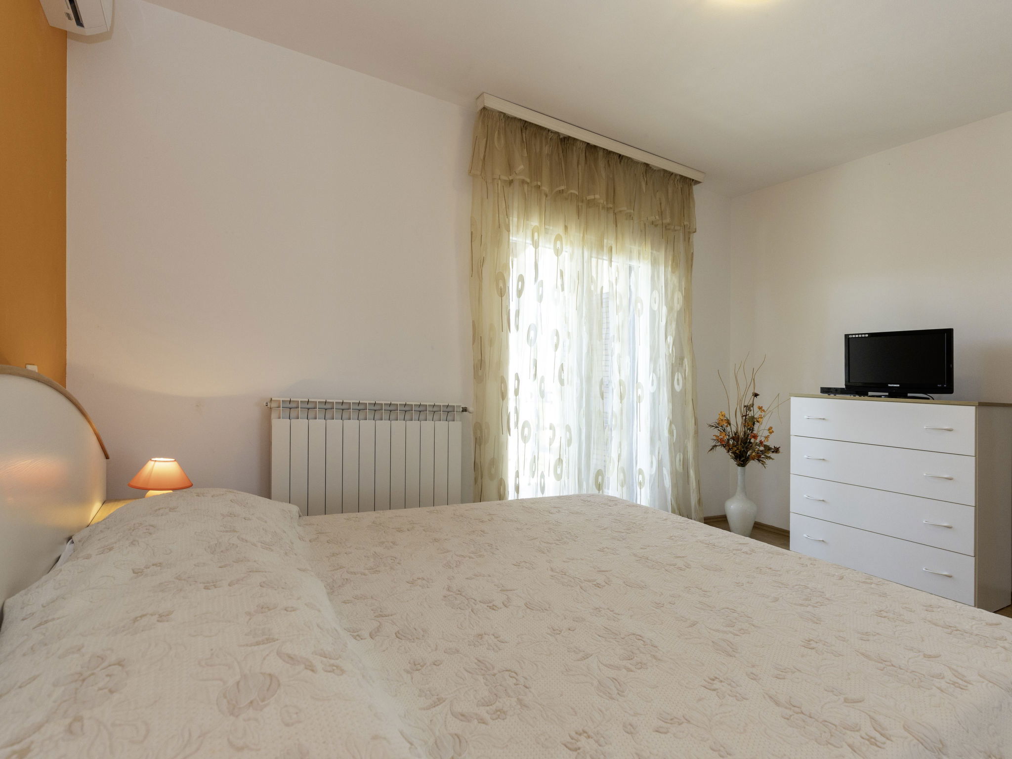 5-room apartment 150 m2 on 1st floor. Living/dining room with satellite TV and air conditioning. 1 room with 1 double bed (2 x 90 cm, length 200 cm), satellite TV and air conditioning. 1 room with 1 french bed (160 cm, length 200 cm), satellite TV and air conditioning. 1 room with 1 french bed (160 cm, length 200 cm), satellite TV and air conditioning. Exit to the terrace. 1 room with 1 x 2 bunk beds (90 cm, length 200 cm), air conditioning. Exit to the terrace. Open kitchen (oven, dishwasher, 4 induction hot plates, toaster, kettle, microwave, freezer, electric coffee machine). Shower/WC, shower/bidet/WC, double hand-basin. Forced-air heating. Terrace 15 m2, roofed. Terrace furniture, deck chairs. View of the countryside. Facilities: washing machine, dryer, iron, hair dryer. Internet (WiFi, free). Please note: non-smoking house. Maximum 1 pet/ dog allowed.