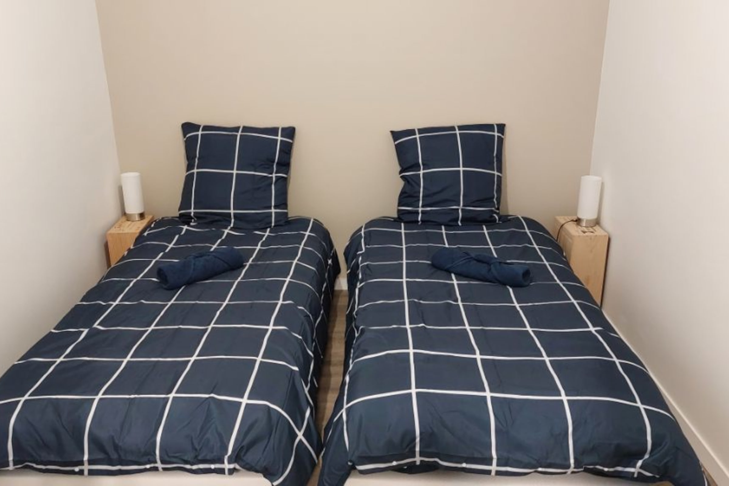 Bedroom 1 has 2 single beds, a desk and a wardrobe.
