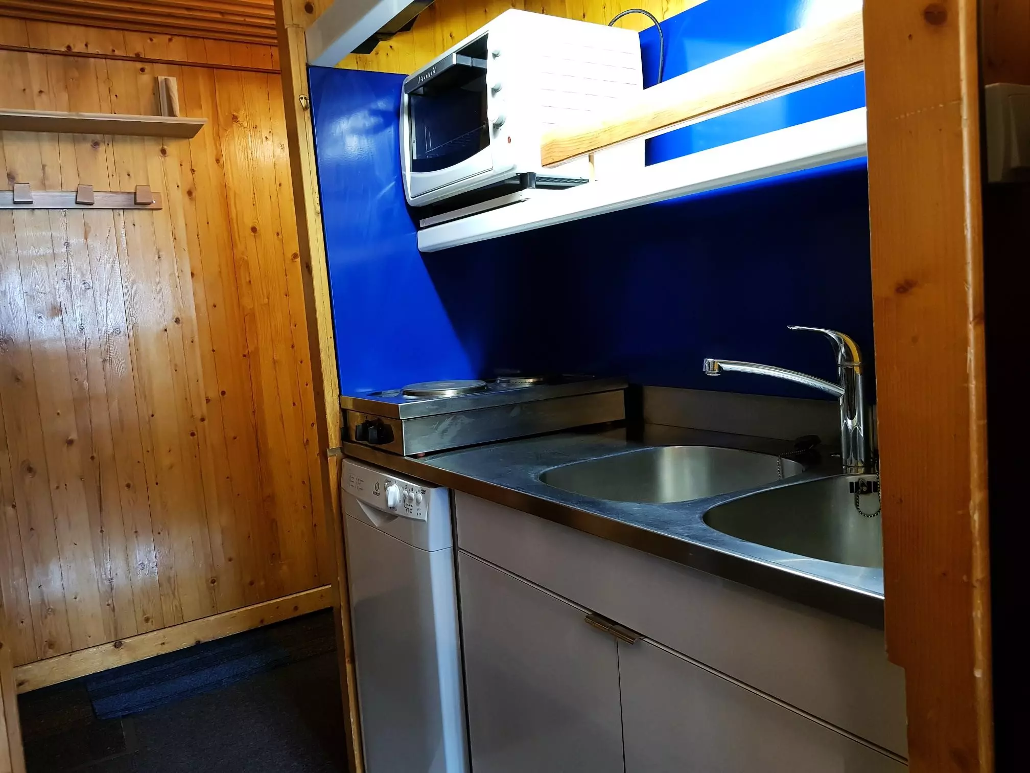It is equipped with electric hobs, an oven, a microwave and a refrigerator.