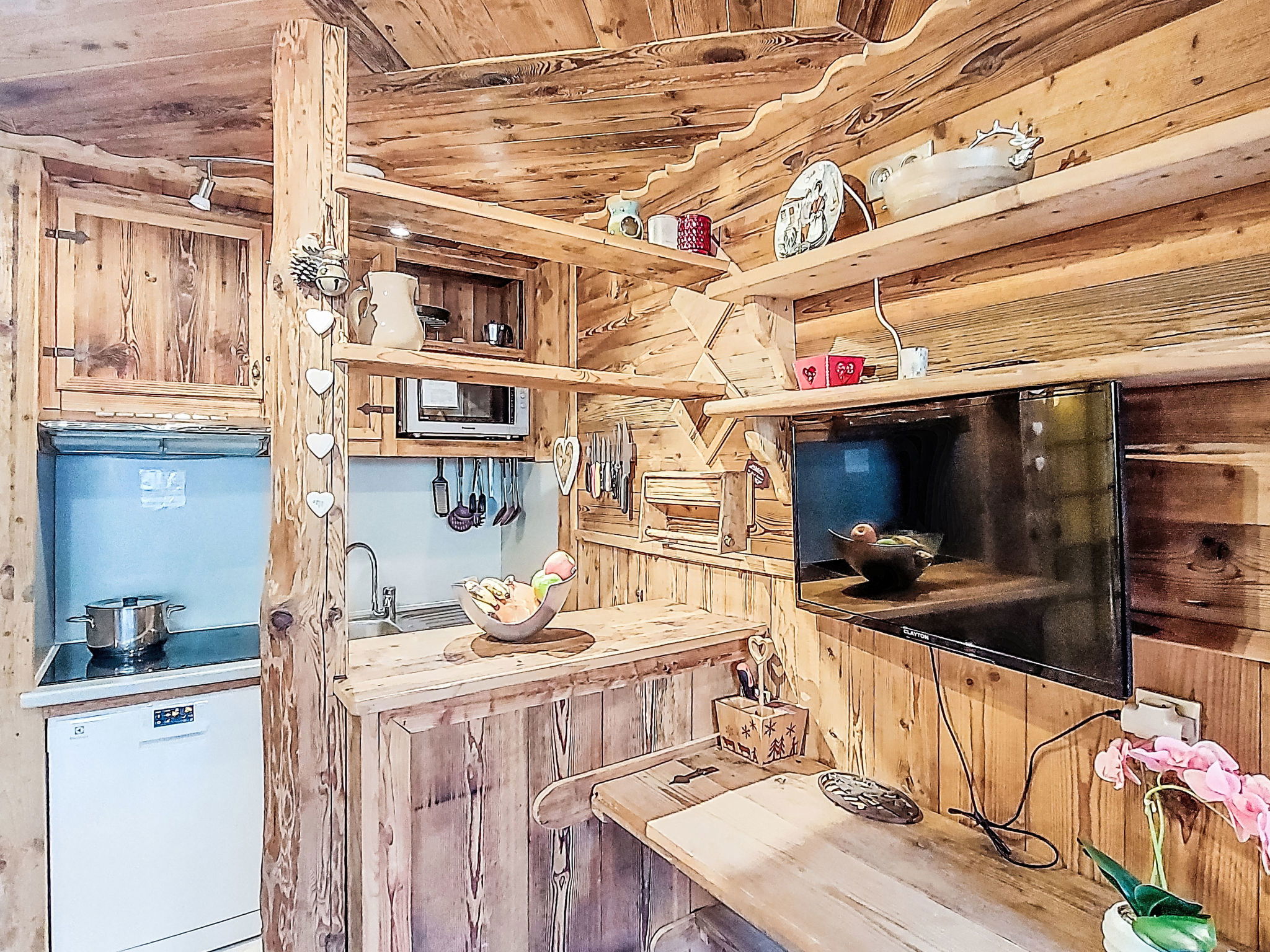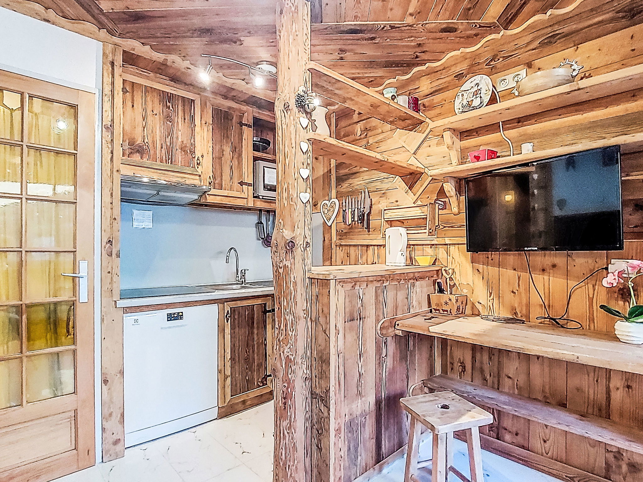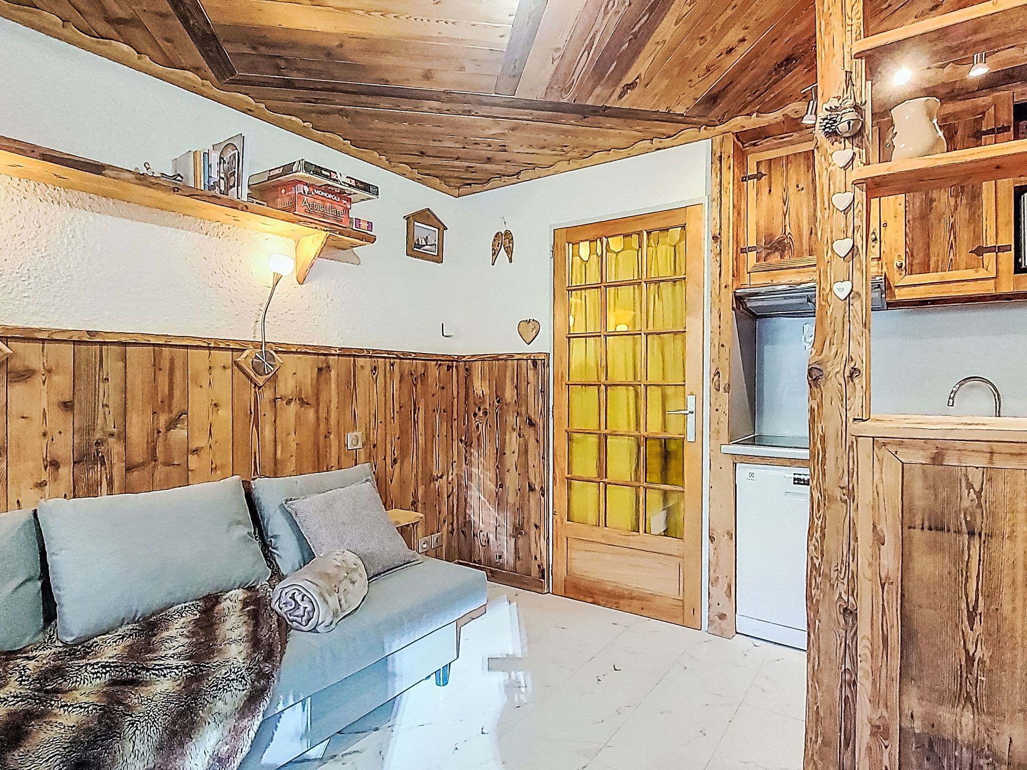 "Serac Y6", 1-room studio 29 m2, north facing position. Modern and wooden furniture furnishings: living/sleeping room with veranda with 1 double sofabed (1 x 140 cm, length 190 cm), TV, flat screen and electric heating. Sleeping alcove with 1 x 2 bunk beds (90 cm, length 190 cm) with dining table and dining nook. Exit to the veranda. Kitchenette (dishwasher, 3 induction hot plates, kettle, microwave, grill, electric coffee machine, cooking island). Shower, sep. WC. Natural stone floors. Partial view of the mountains, the valley, the ski run and the resort. Facilities: Internet (WiFi, extra). Please note: non-smokers only. Smoke alarm. Offer by a private individual according to Art. 155, IV of CGI.