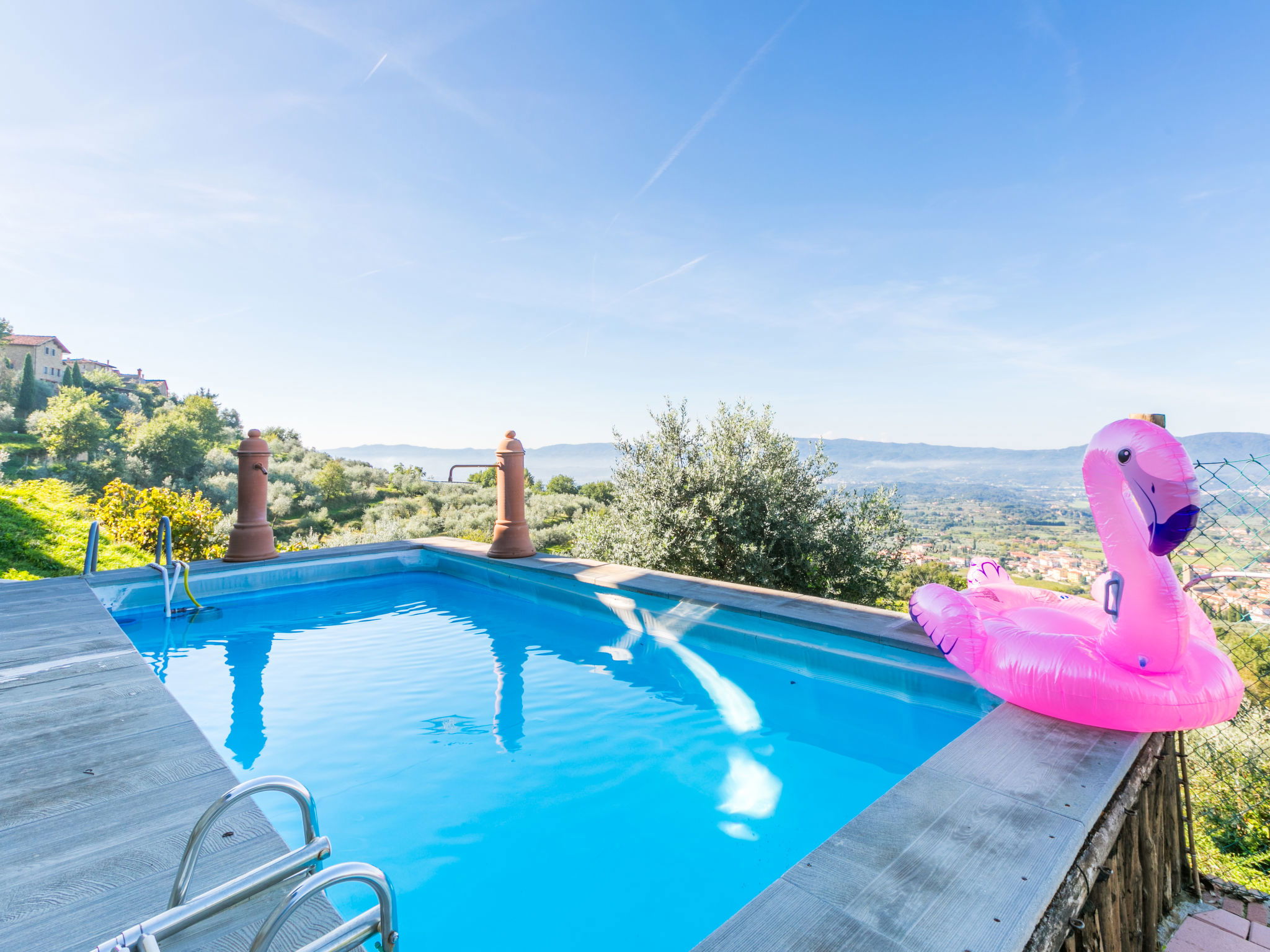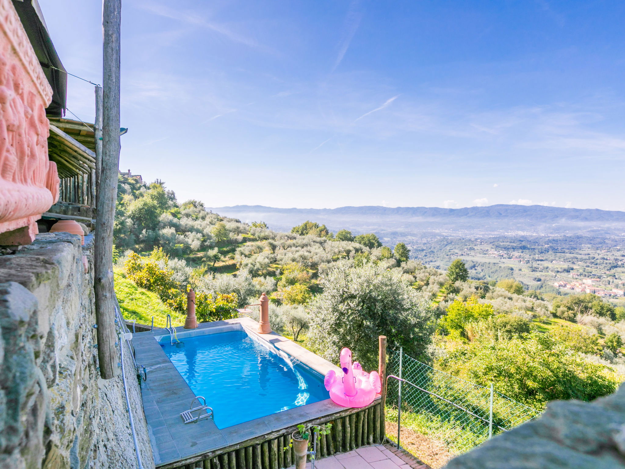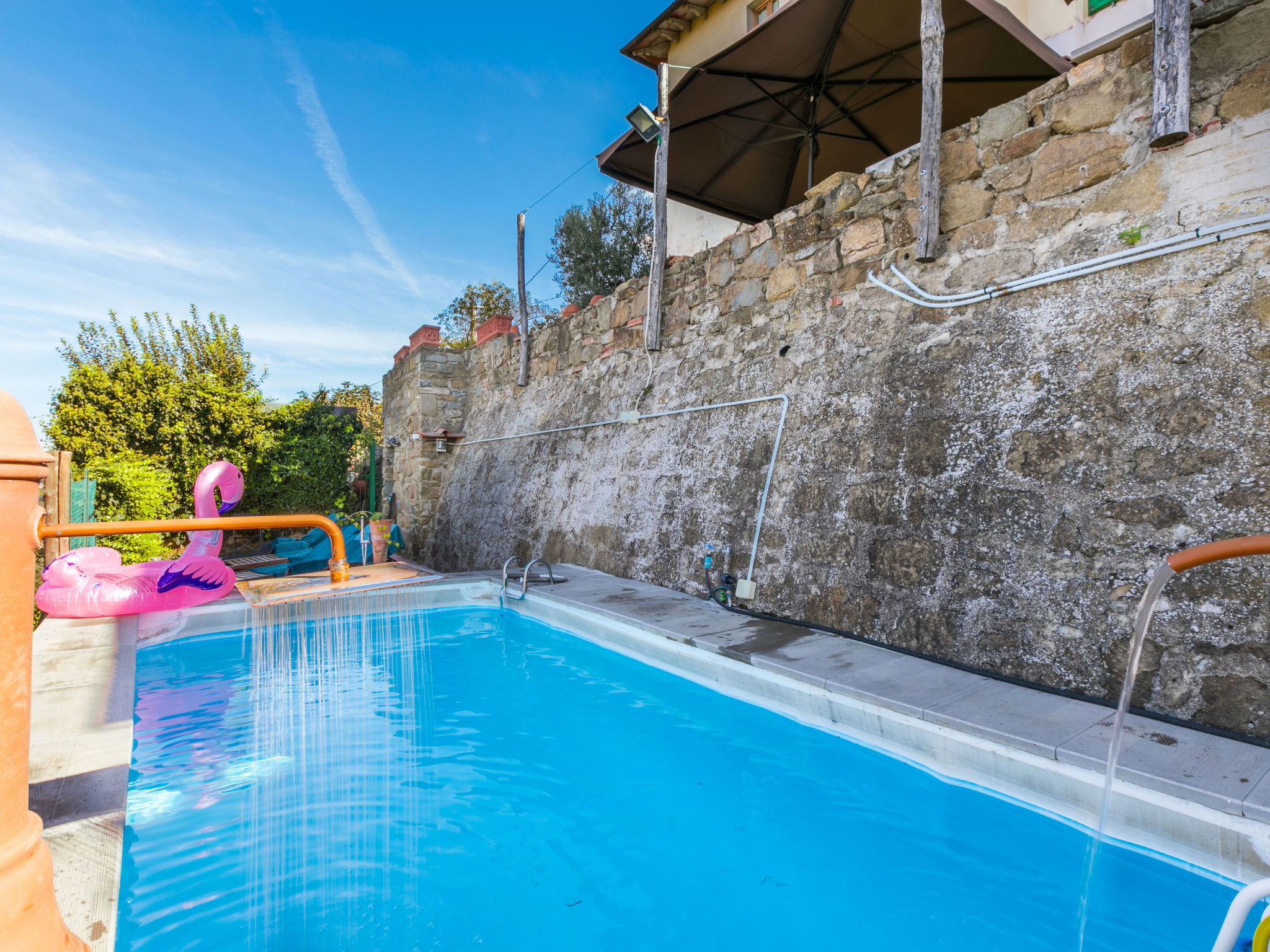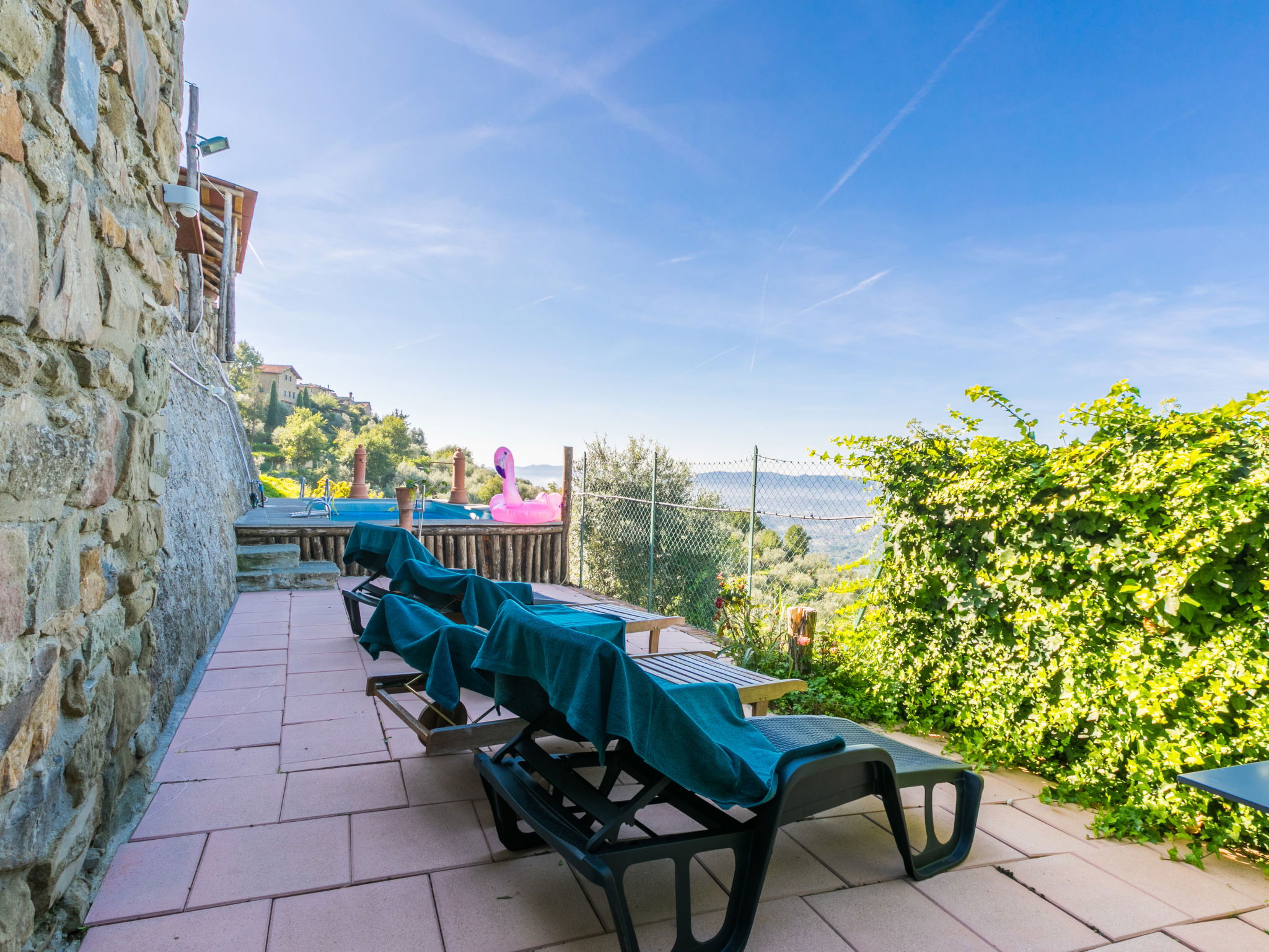 Country house 450 m a.s.l., semi-detached. 1.4 km from the centre of Reggello, 30 km from the centre of Greve in Chianti, 40 km from the centre of Firenze, in an elevated position on top of a hill, in the countryside. Private: terraced garden (fenced), swimming pool heated, fenced (8 x 6 m, depth 140 cm, seasonal availability: 04.Apr. - 24.Oct.). Shower/WC in the pool area, garden furniture. In the house: central heating system, heating to be paid on the spot, heating available only from 01.Nov. - 04.Apr.. Cook on request (extra). Parking on the premises. Shop, grocery, supermarket 700 m, bus stop 2 km, railway station "Figline Valdarno" 12 km, bathing lake "Bilancino" 70 km. Tennis 1 km, riding stable 1 km. Nearby attractions: Castelfranco di Sopra 12 km, Vallombrosa 13 km, Loro Ciuffenna 21 km, Gaiole in Chianti 36 km, Panzano in Chianti, Radda in Chianti 38 km, Siena 75 km. Please note: car recommended.