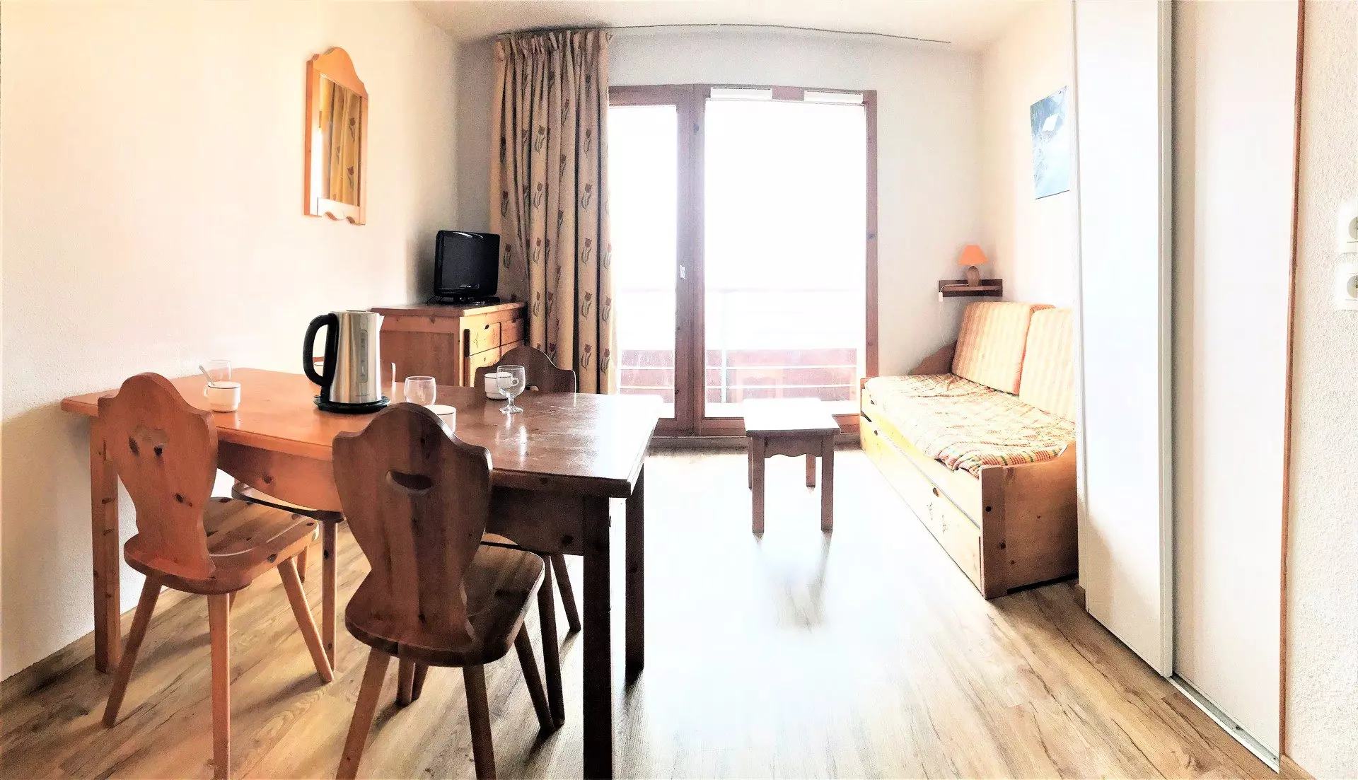 The living room is equipped with a pull-out sofa for 2 people, large screen TV, table that can accommodate 6 guests, balcony, and a kitchen area with 4 vitro ceramic hobs, combined microwave oven, top refrigerator, dishwasher, Nespresso® coffee machine, toaster, kettle and raclette machine.