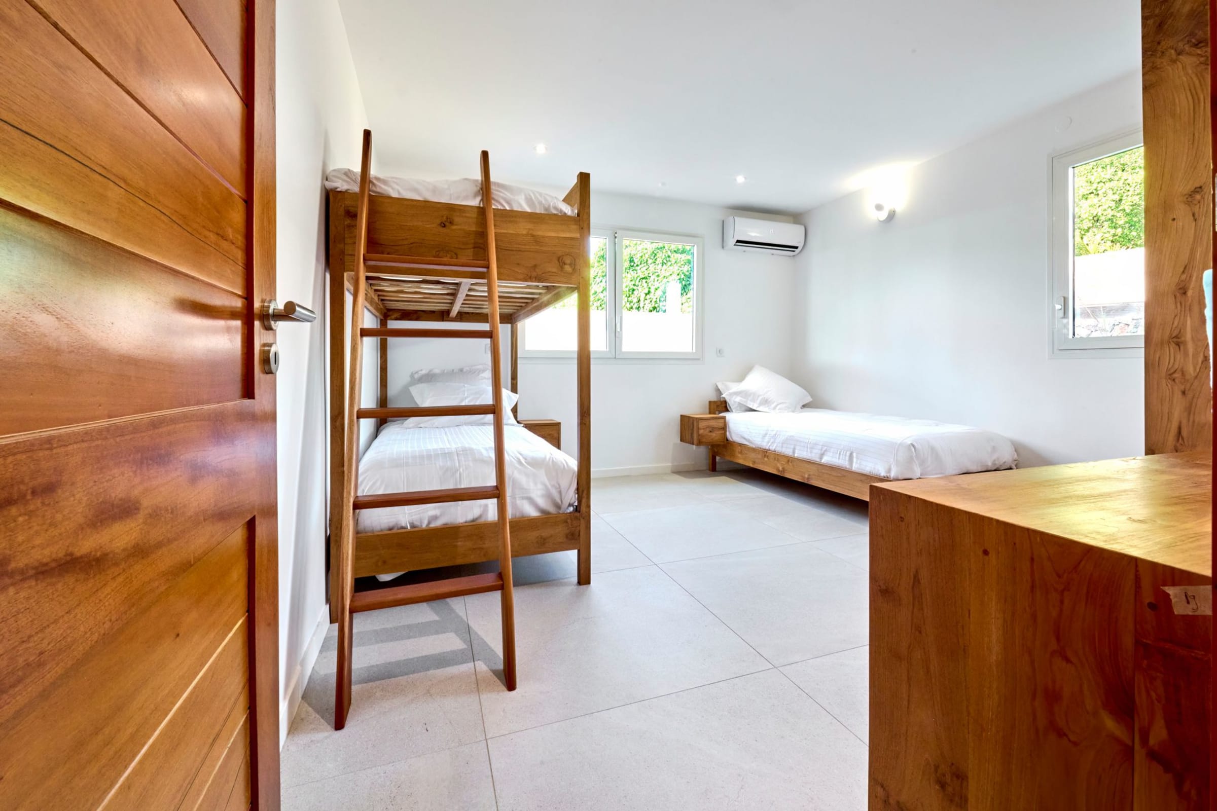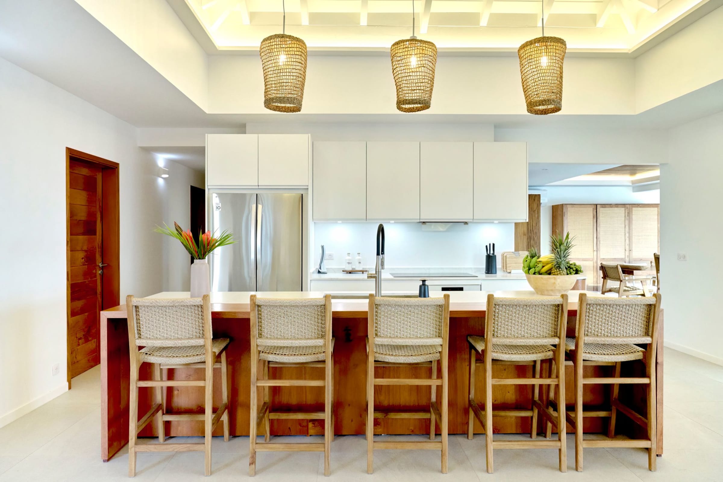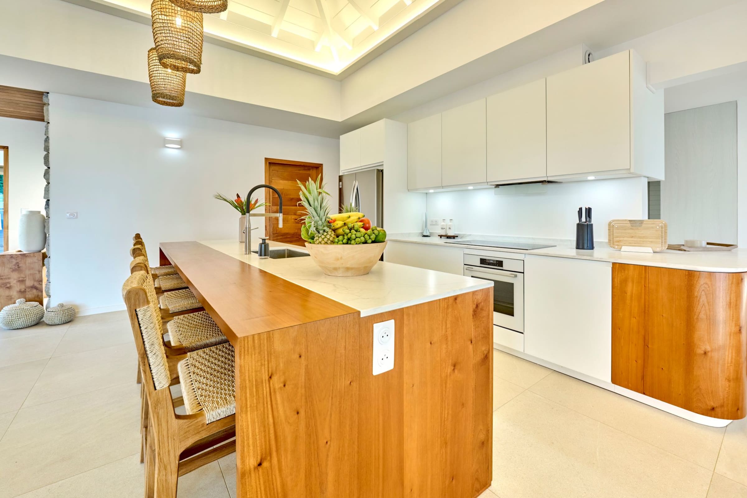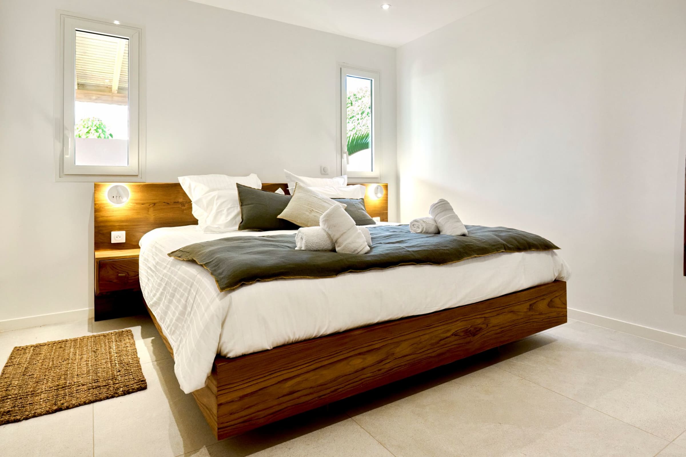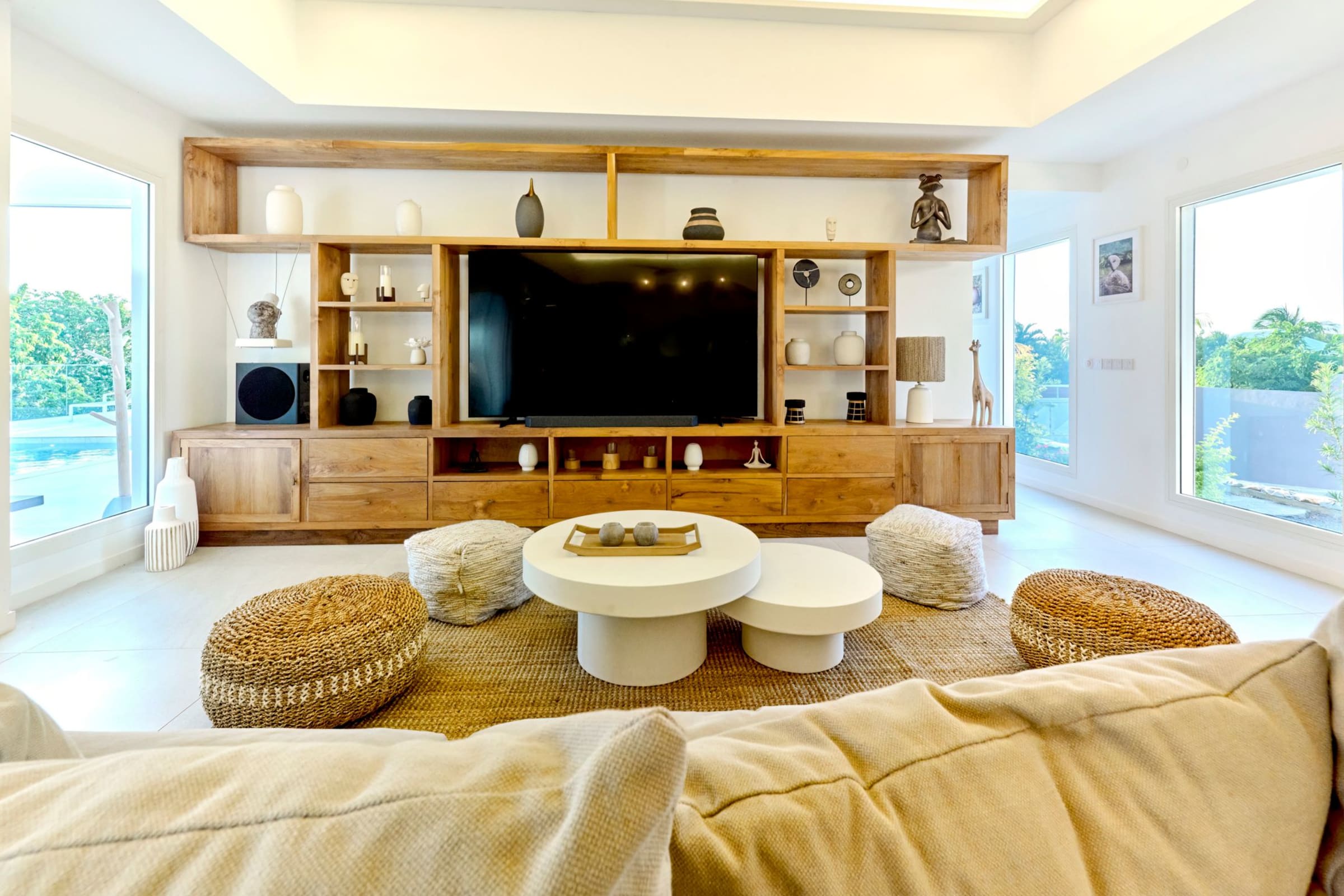 At the heart of the villa lies a modern and functional open-plan kitchen, fully equipped and complemented by a second area designed for casual breakfasts. Flowing naturally from this space, the fully air-conditioned living room offers a warm and refined atmosphere, with a cozy sofa and a large screen for moments of pure relaxation. Bathed in natural light, a games room will soon add a new dimension to leisure and entertainment within the villa.