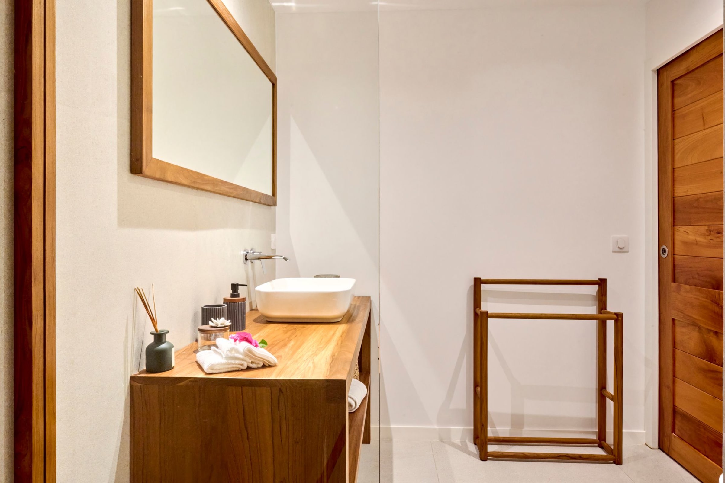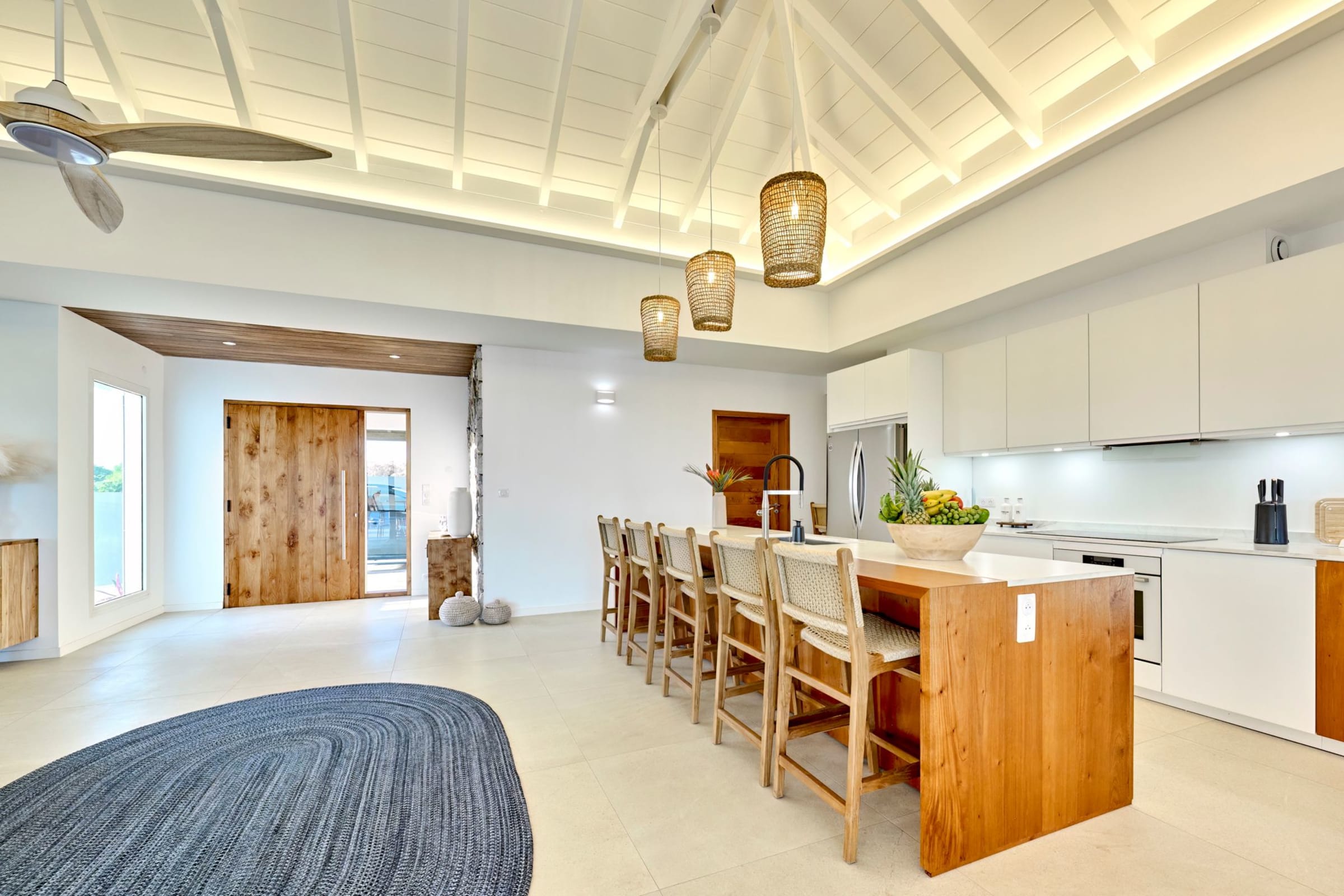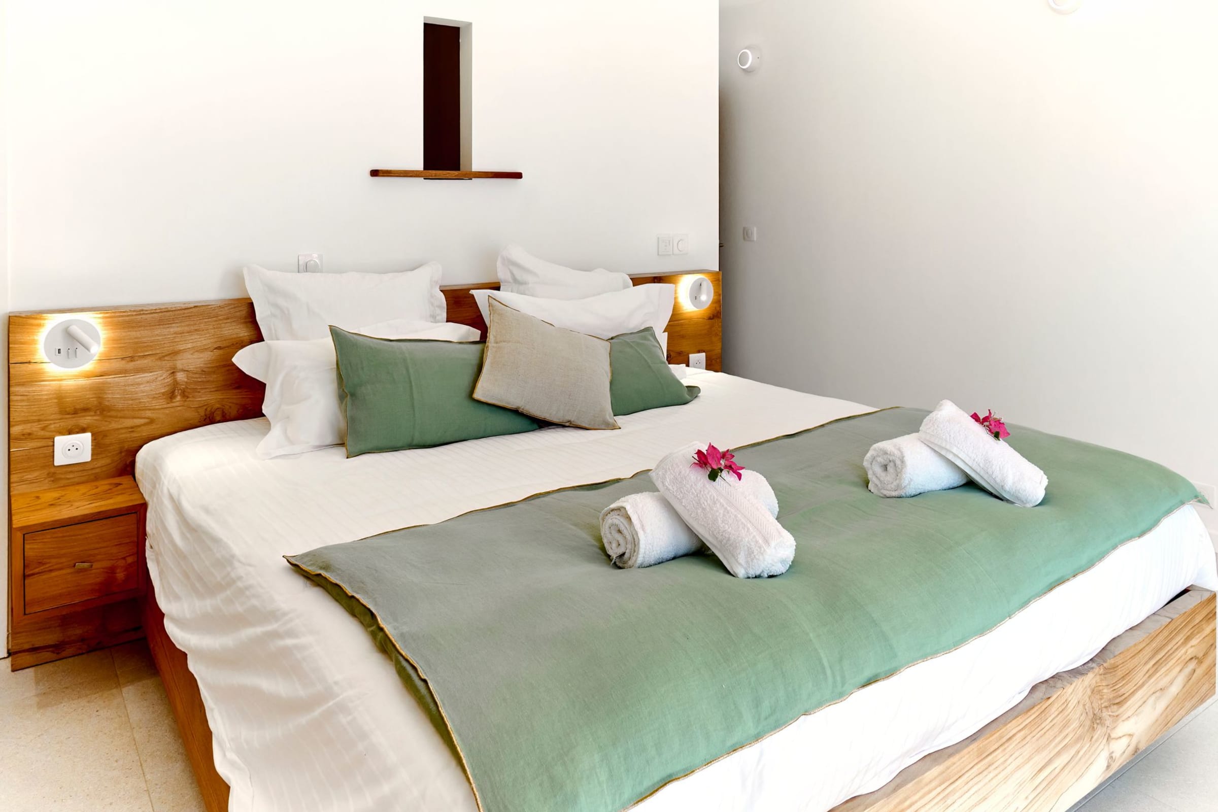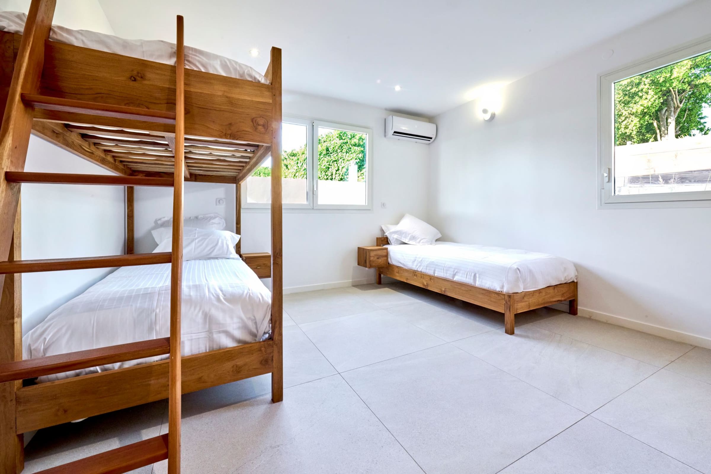 At the heart of the villa lies a modern and functional open-plan kitchen, fully equipped and complemented by a second area designed for casual breakfasts. Flowing naturally from this space, the fully air-conditioned living room offers a warm and refined atmosphere, with a cozy sofa and a large screen for moments of pure relaxation. Bathed in natural light, a games room will soon add a new dimension to leisure and entertainment within the villa.