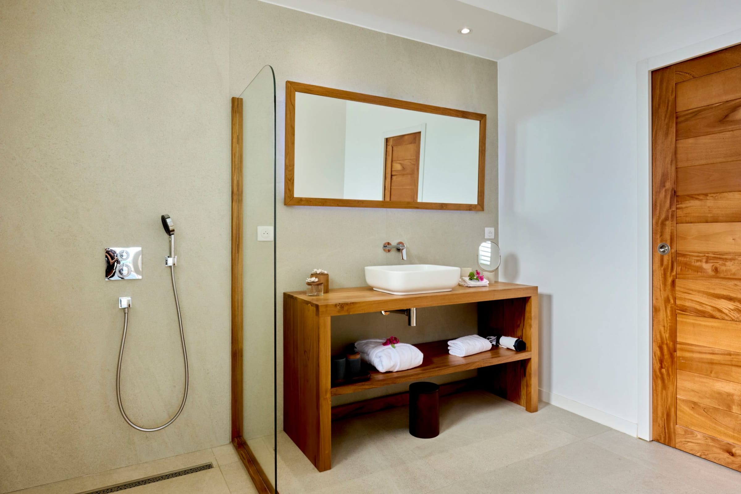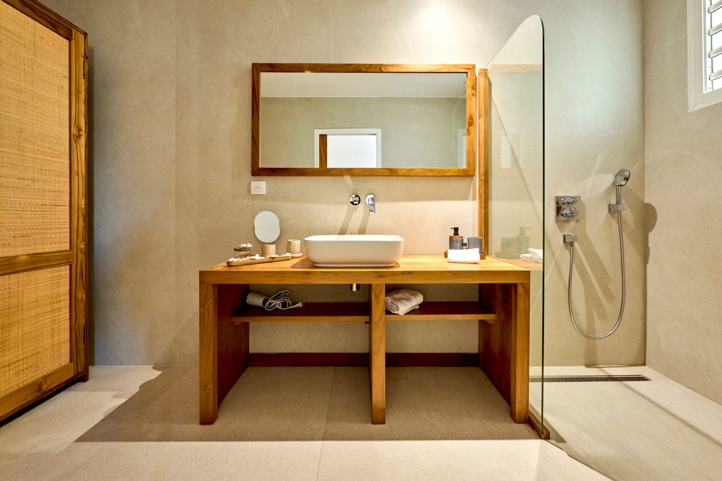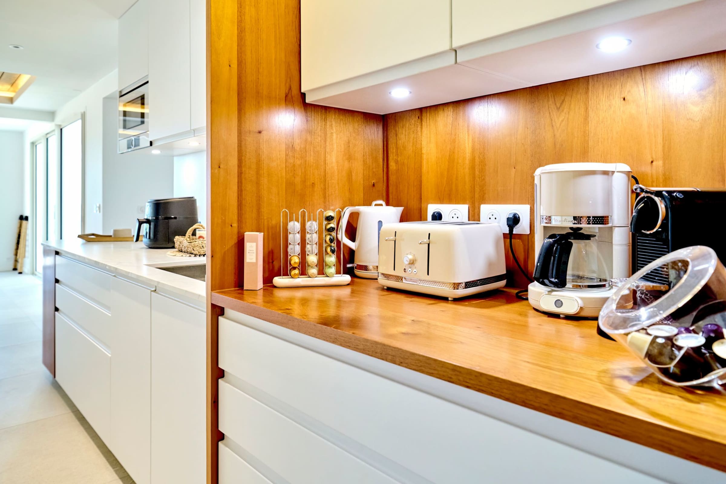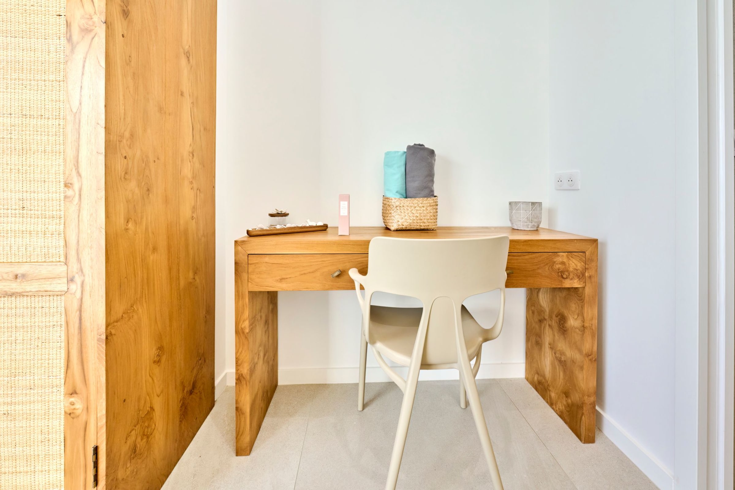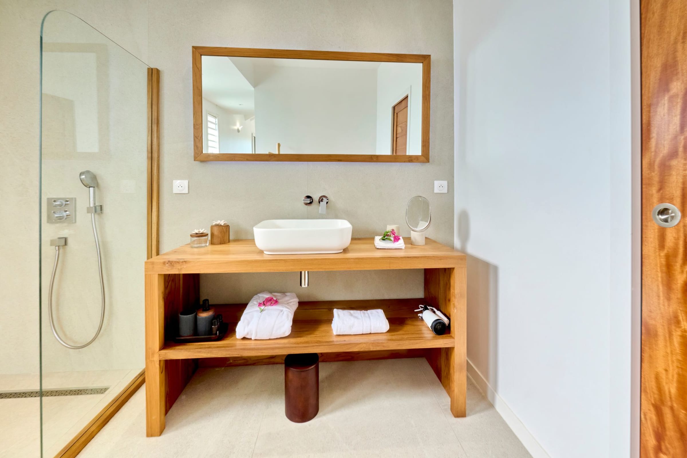 At the heart of the villa lies a modern and functional open-plan kitchen, fully equipped and complemented by a second area designed for casual breakfasts. Flowing naturally from this space, the fully air-conditioned living room offers a warm and refined atmosphere, with a cozy sofa and a large screen for moments of pure relaxation. Bathed in natural light, a games room will soon add a new dimension to leisure and entertainment within the villa.