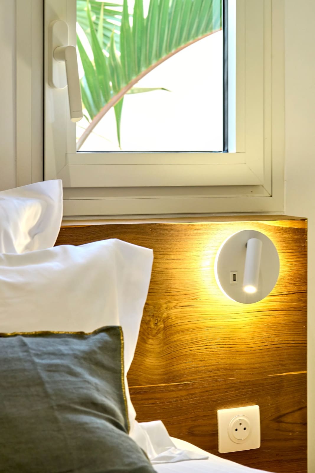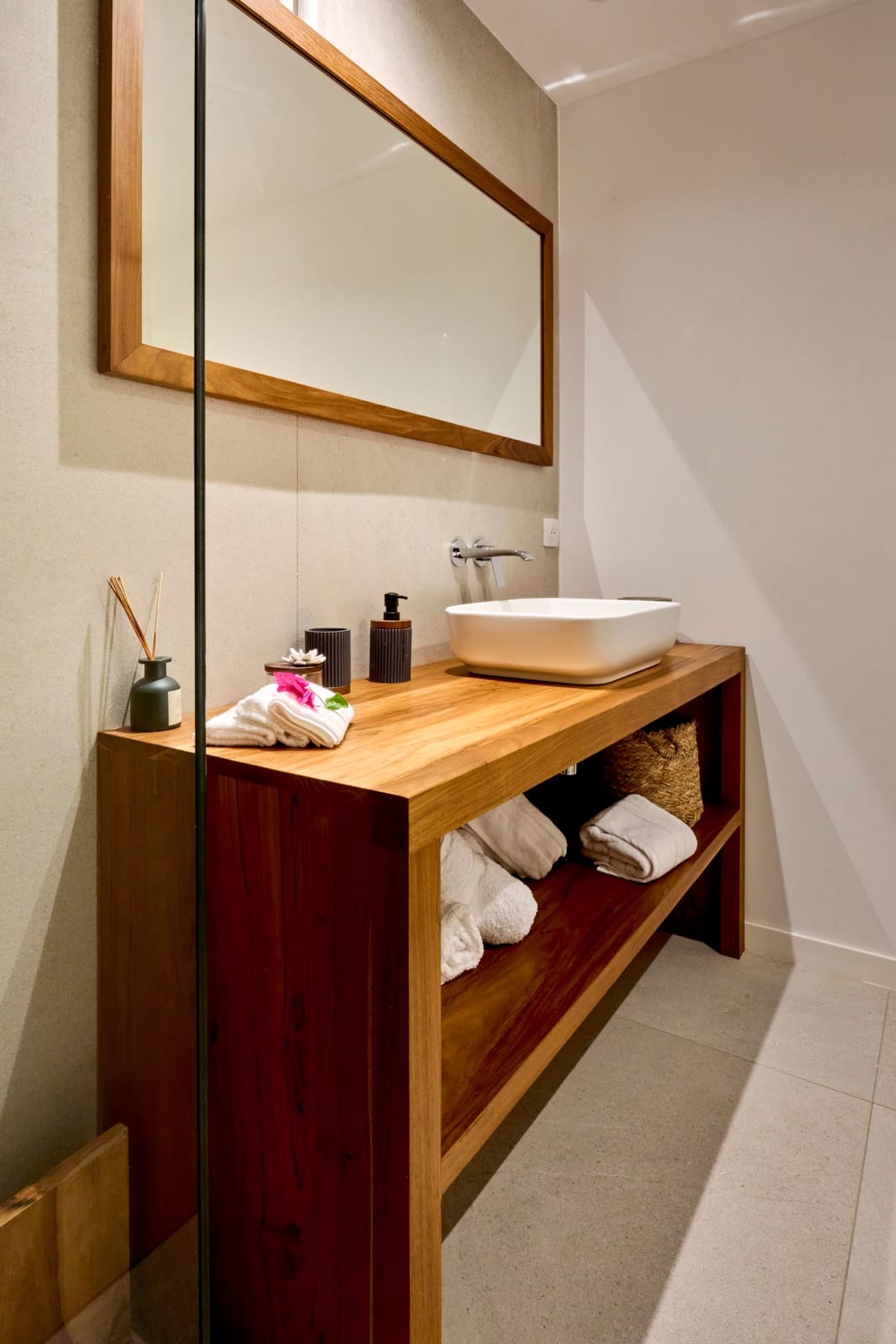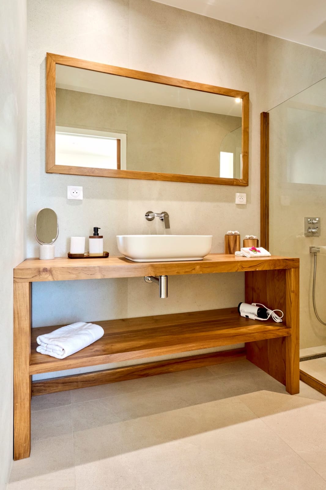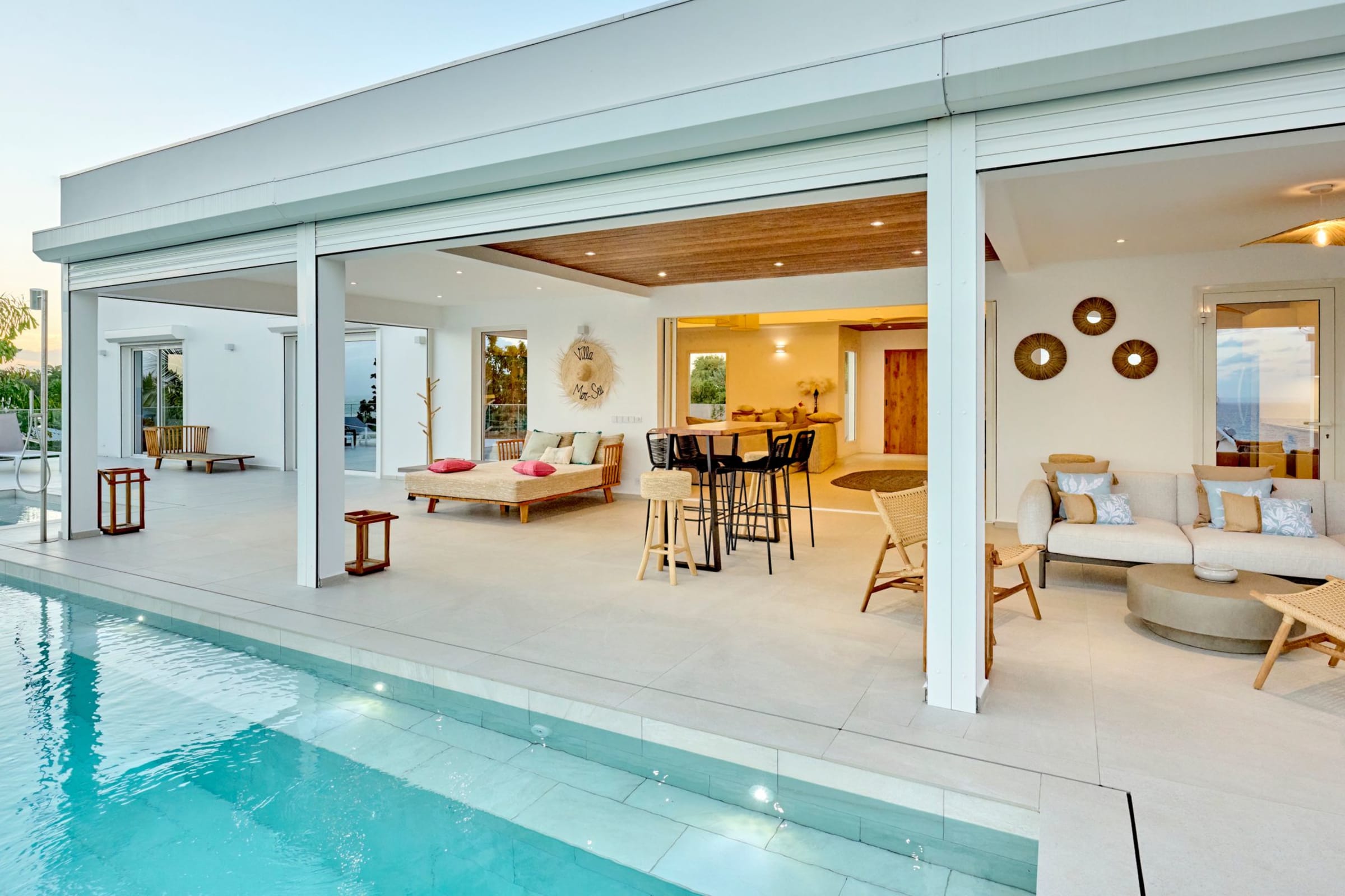The covered terrace is a true living space, designed to fully enjoy every moment facing the sea. A large dining table brings everyone together for shared meals, a comfortable lounge invites relaxation, while sun loungers and a daybed offer the choice between basking in the sun or resting in the shade. At its center, the 13-meter saltwater pool stretches out gracefully, perfect for swimming laps or simply cooling off in complete une conciergerie.