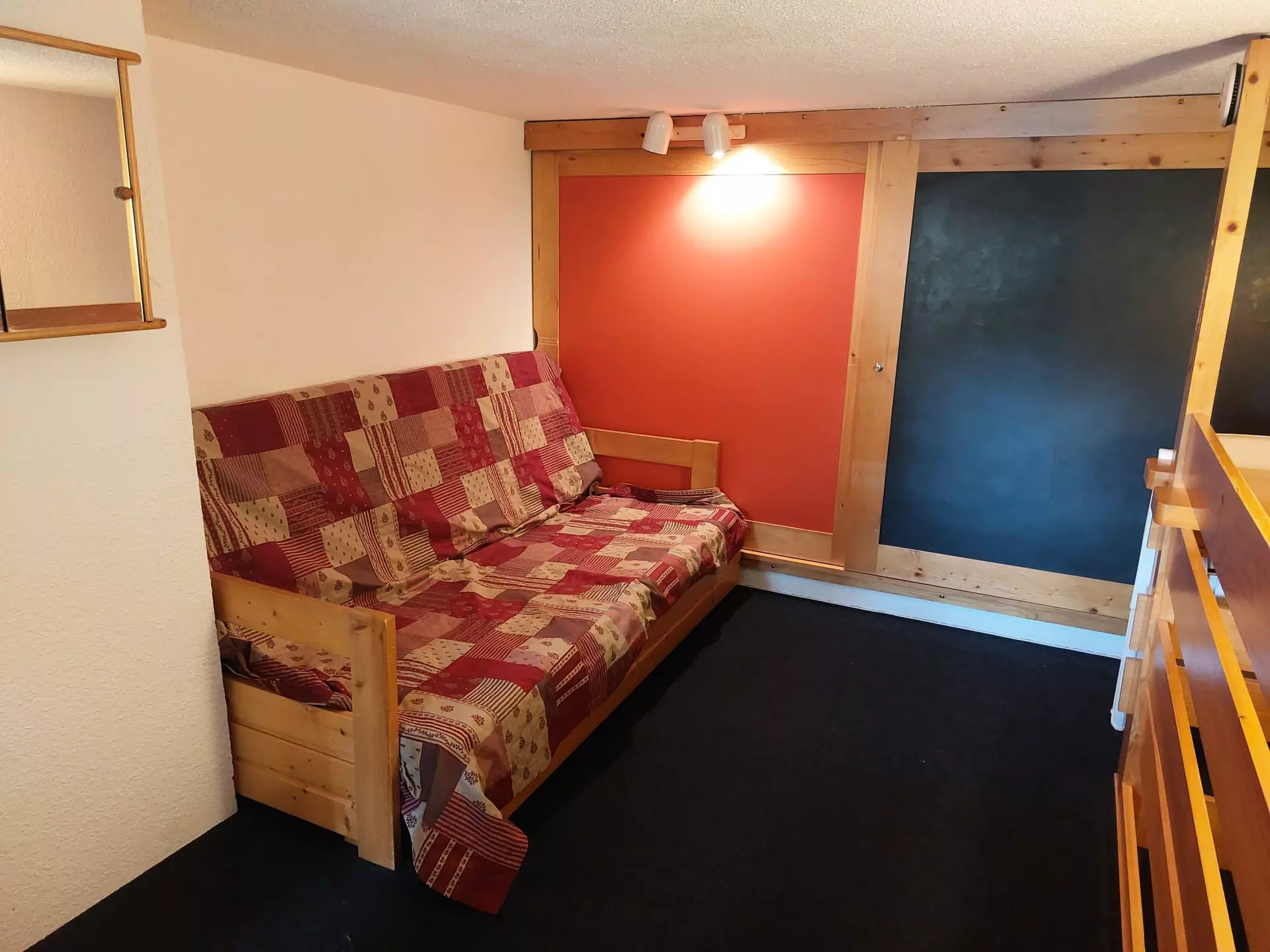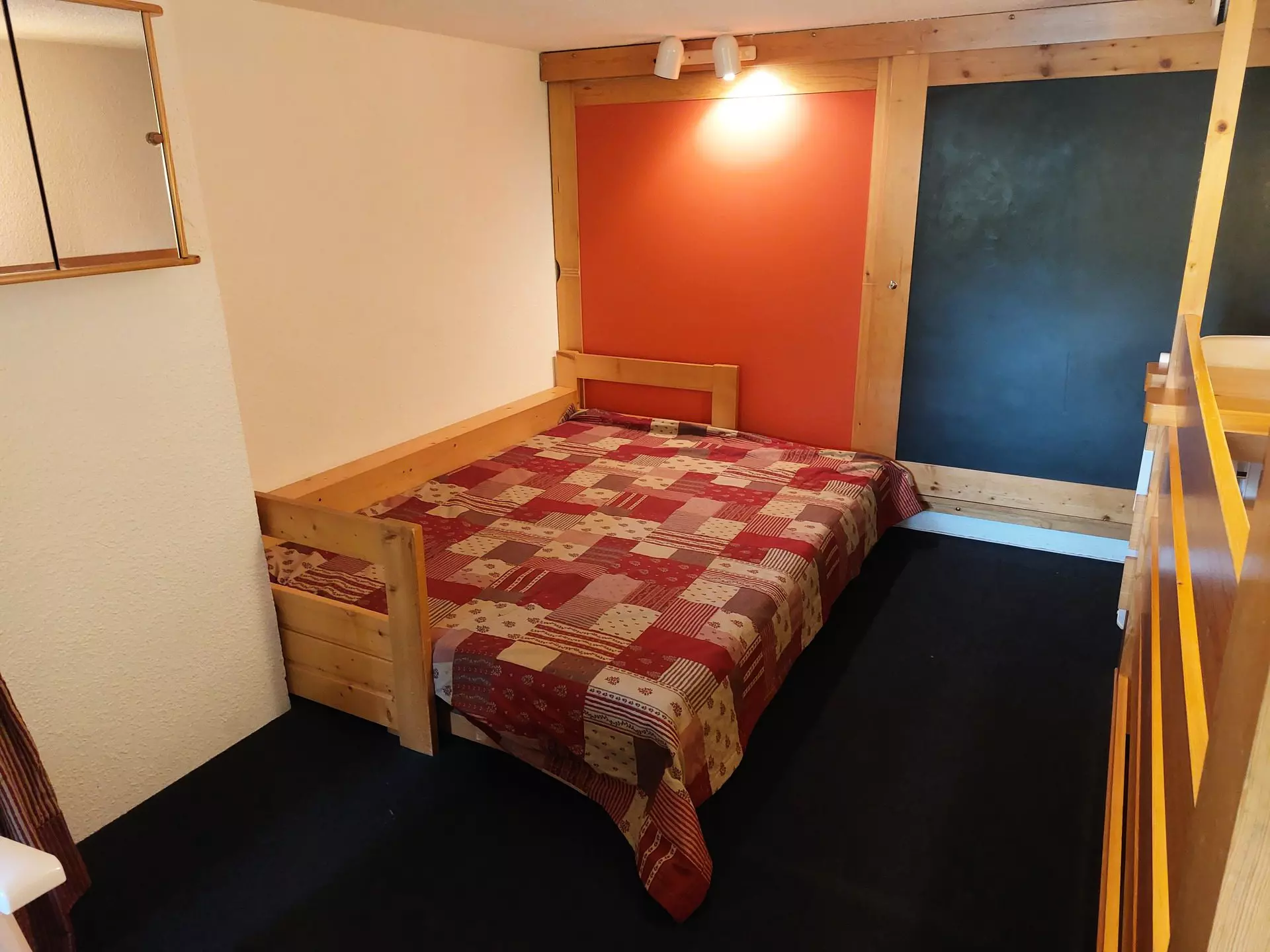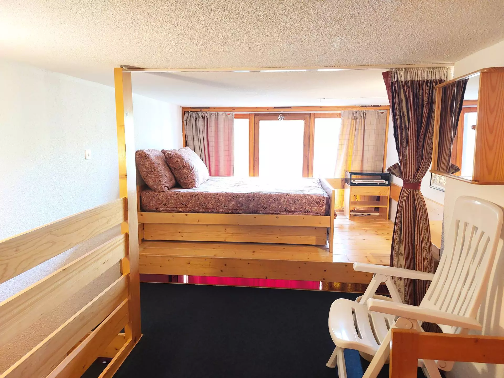 On the mezzanine there is a double bed measuring 140x190 cm and a comb sofa bed measuring 140x190 cm, separated by a curtain.