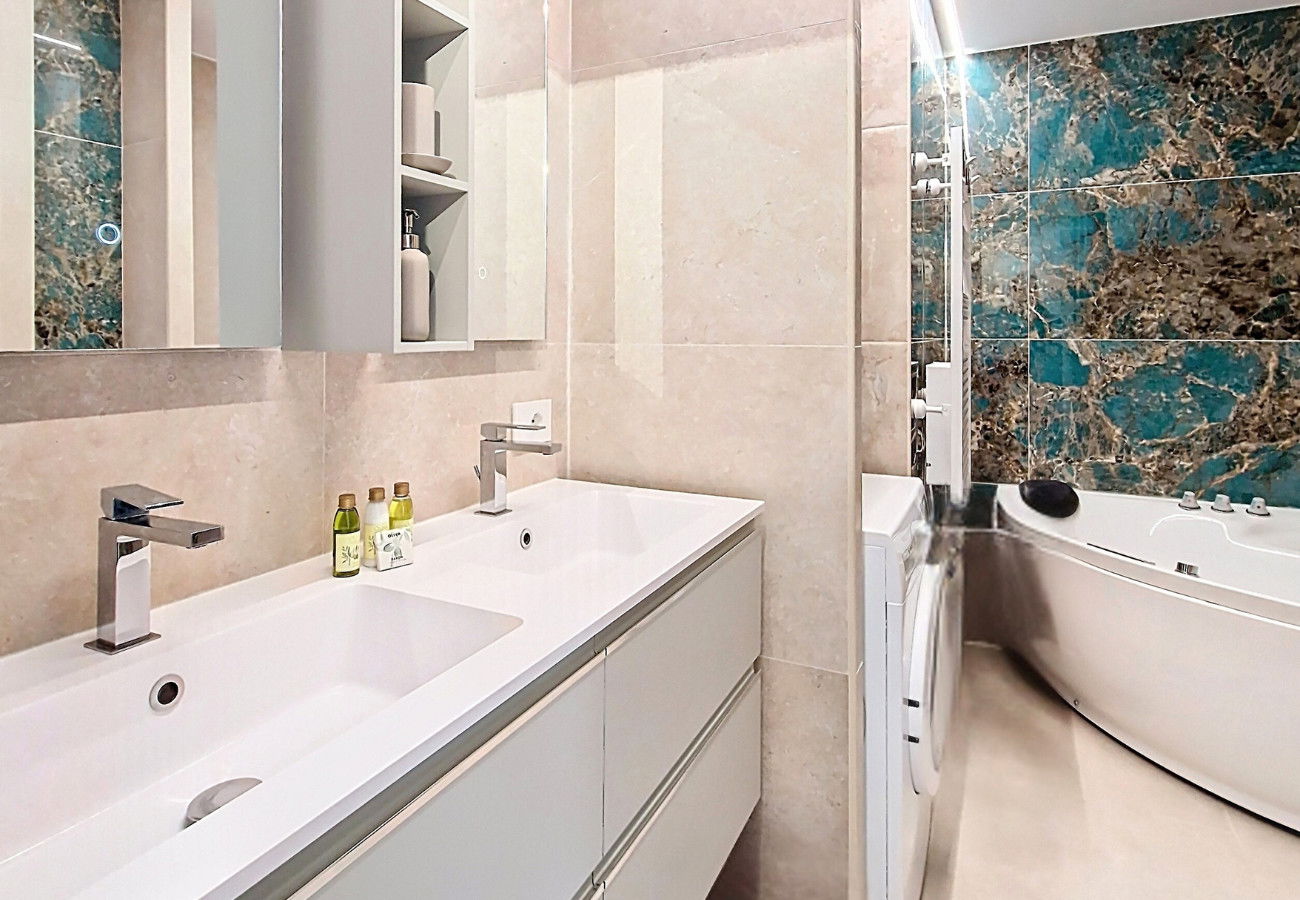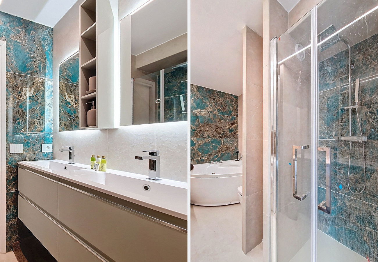 You will also find a modern bathroom with double sink, shower, bathtub, WC and washing machine, ideal for a practical and comfortable stay.