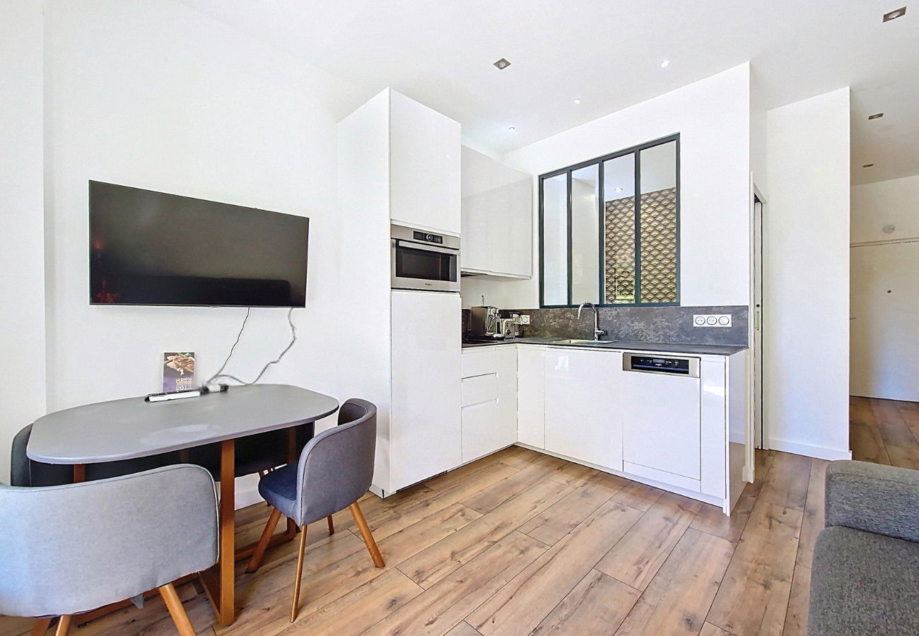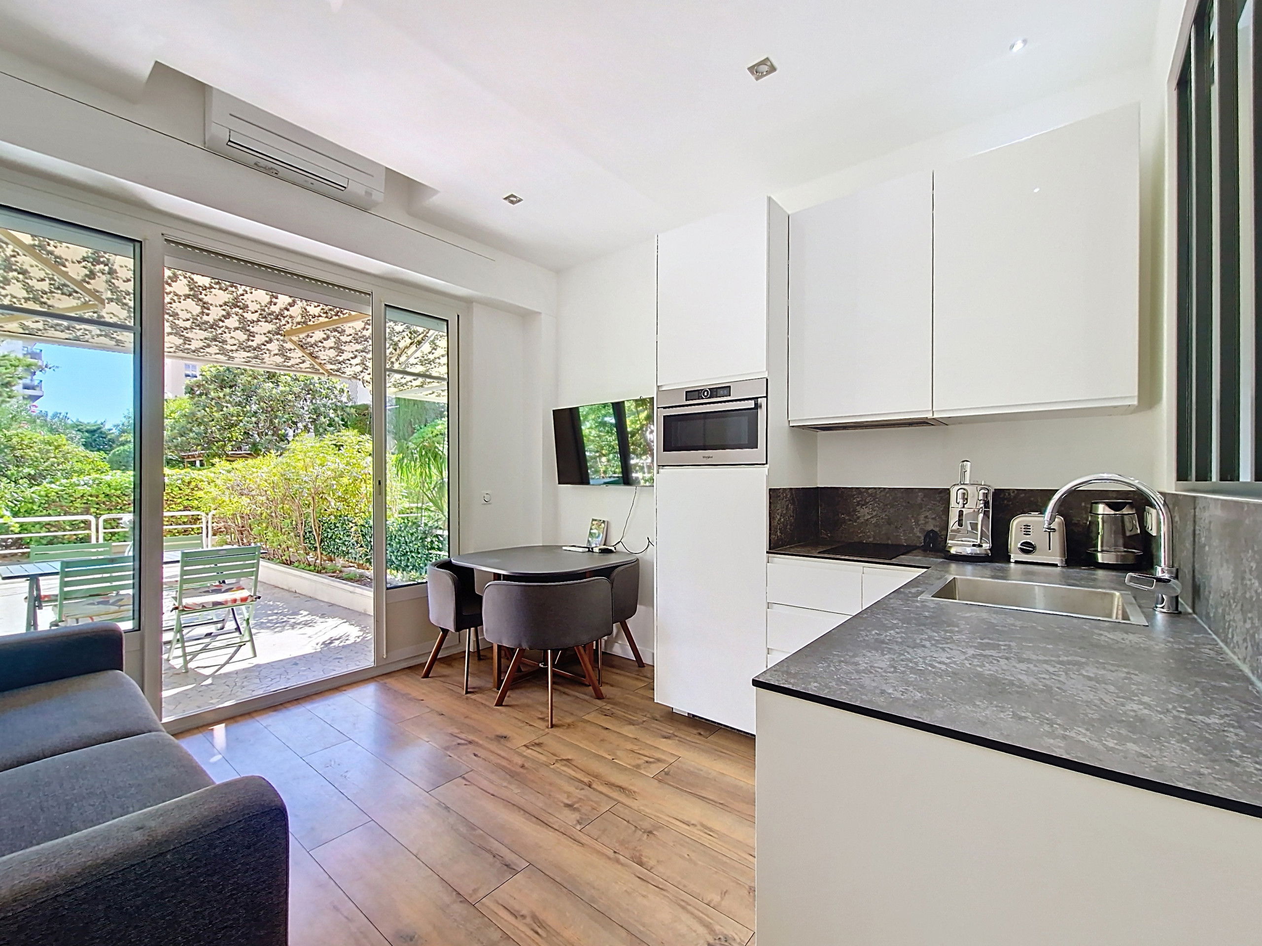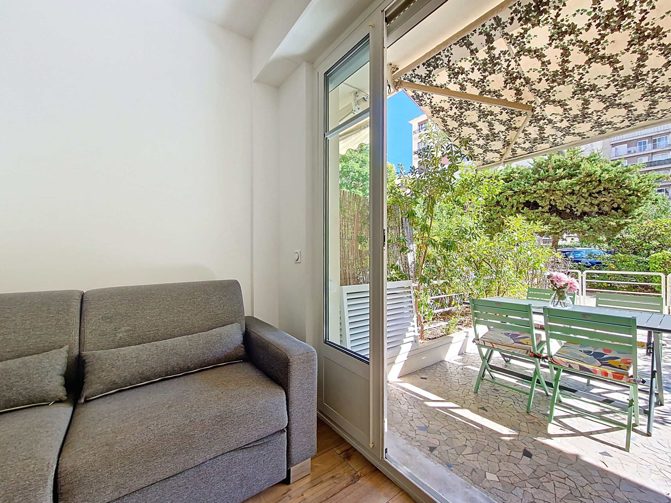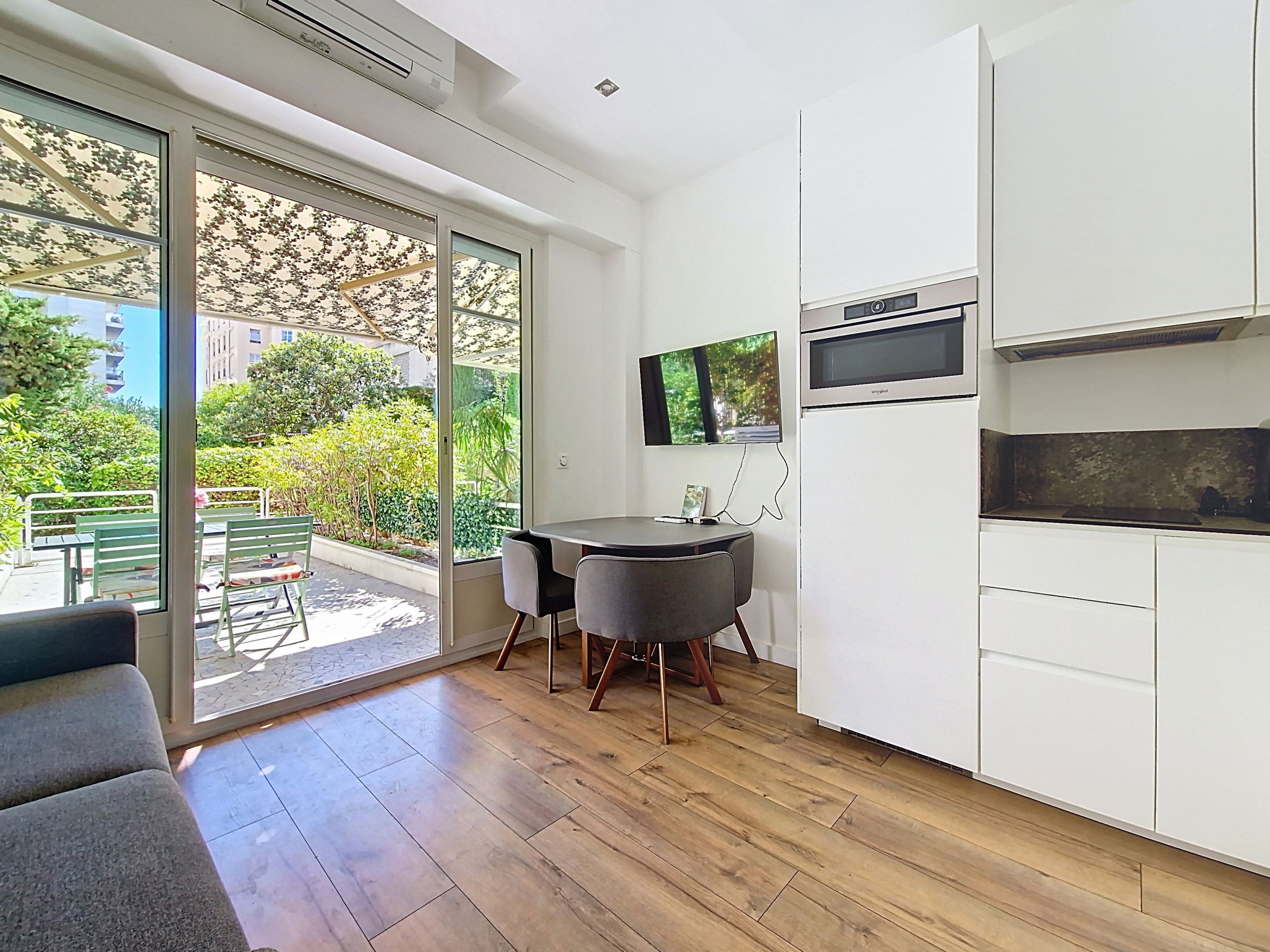 Its real highlight: a spacious south-facing terrace, perfect for enjoying meals outdoors or simply relaxing under the Mediterranean sun while soaking up the unique atmosphere of the French Riviera.