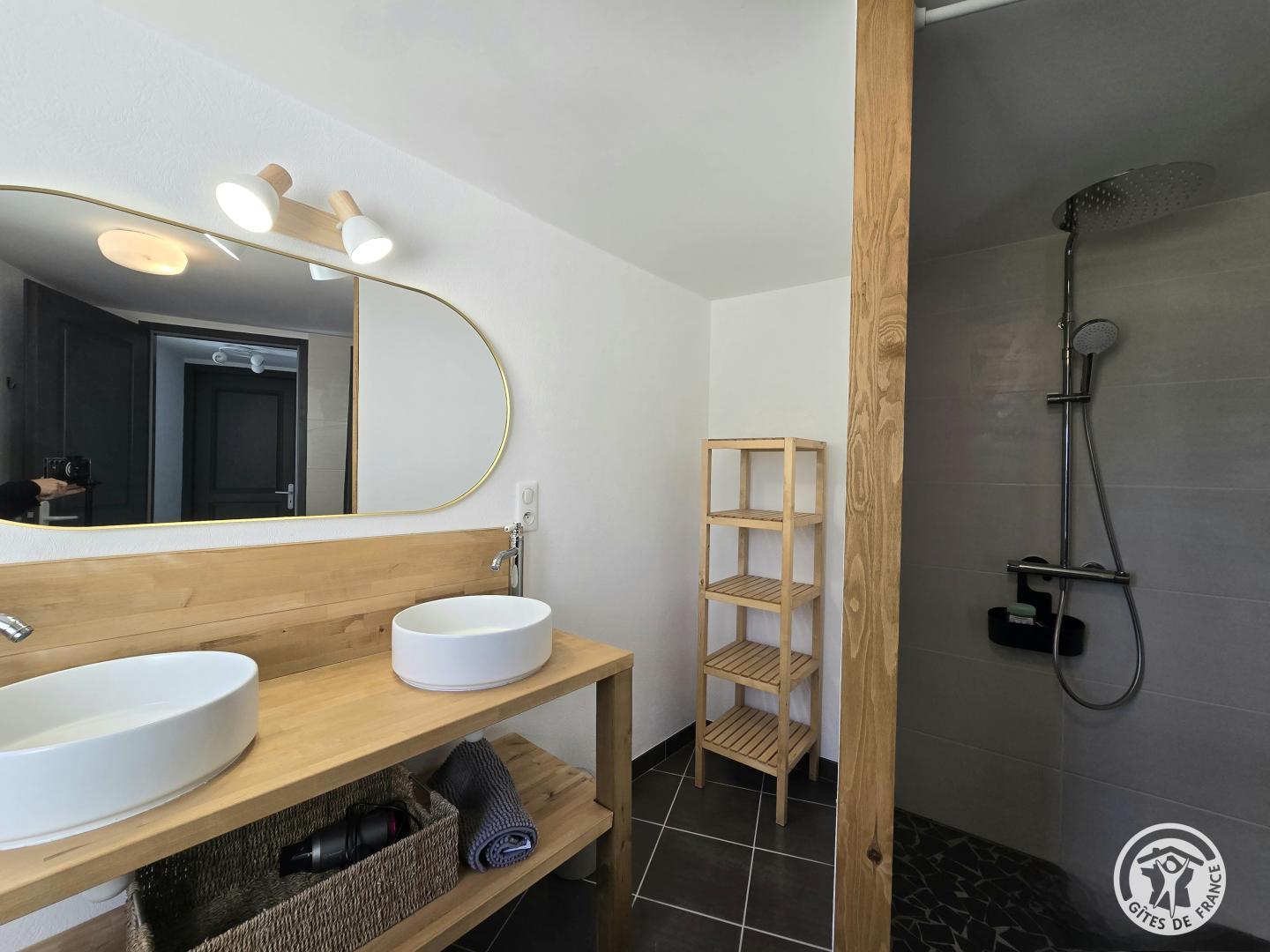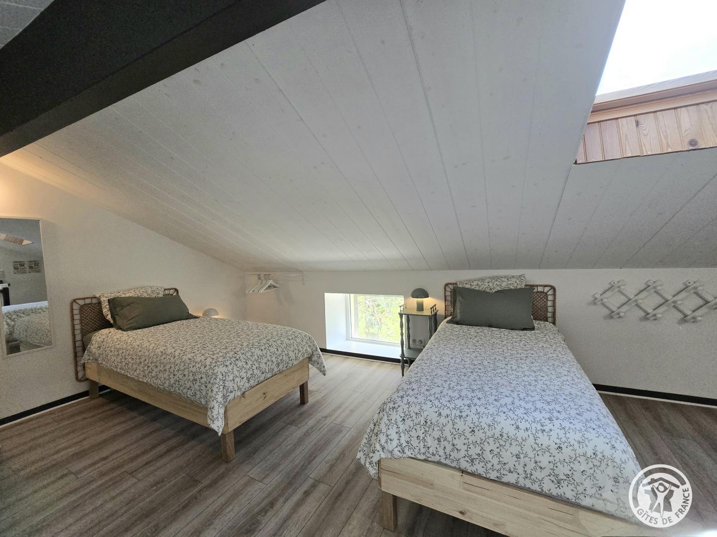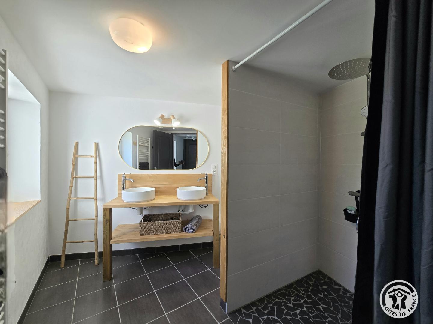 On the ground floor: equipped kitchen (oven, induction hob, dishwasher, freezer combination), dining area, a relaxation lounge with board games, a second cozy lounge with television and Wi-Fi. Still on the ground floor, a corridor leads to 2 bedrooms with a 140 cm bed, 2 90 cm beds, a bathroom with walk-in shower, 2 sinks. Upstairs: accessible from the kitchen, a mezzanine bedroom in dormitory with 4 90 cm beds. From the relaxation lounge, access by stairs to 2 bedrooms (2 140 cm beds) and a bathroom with WC.