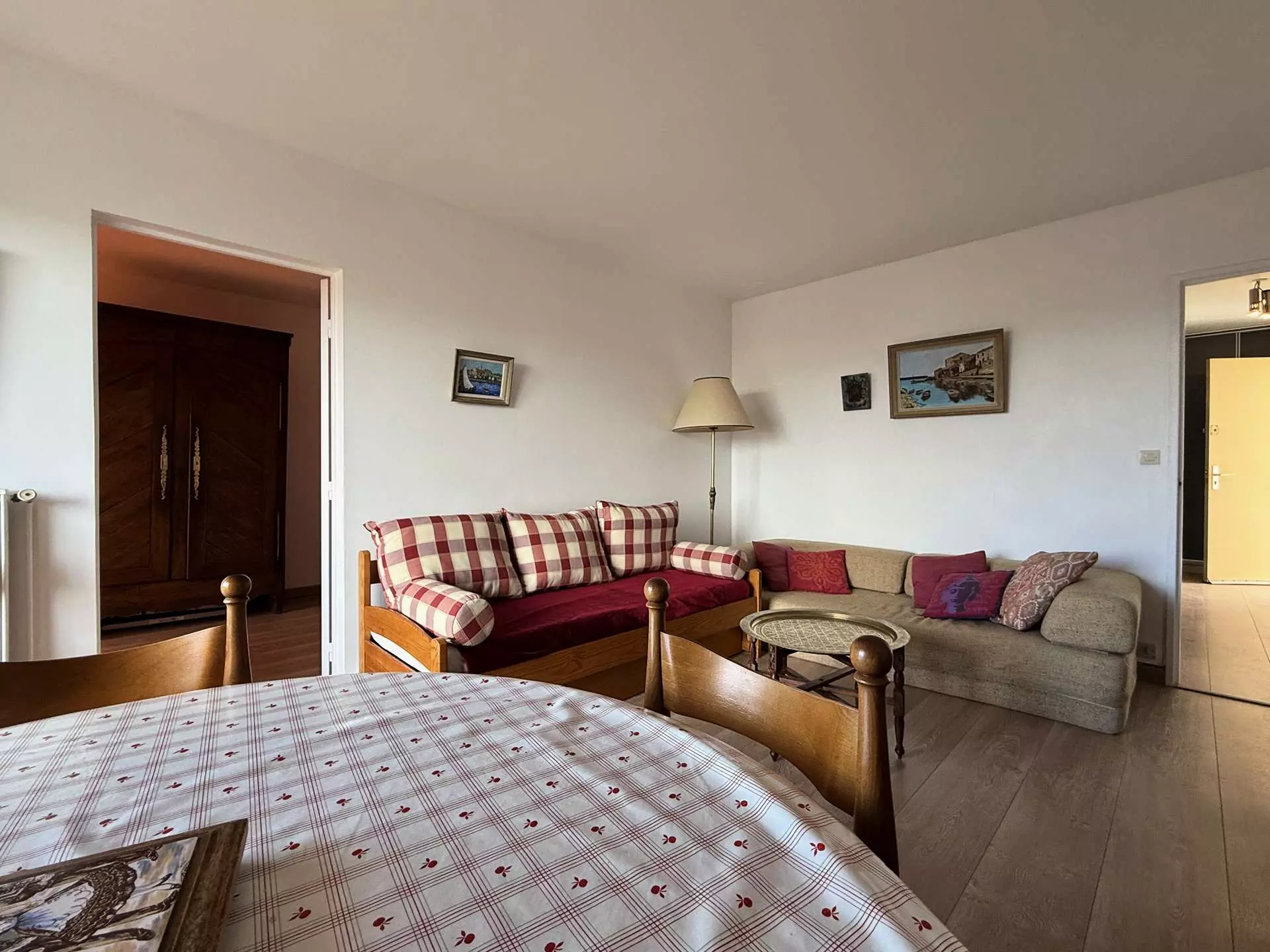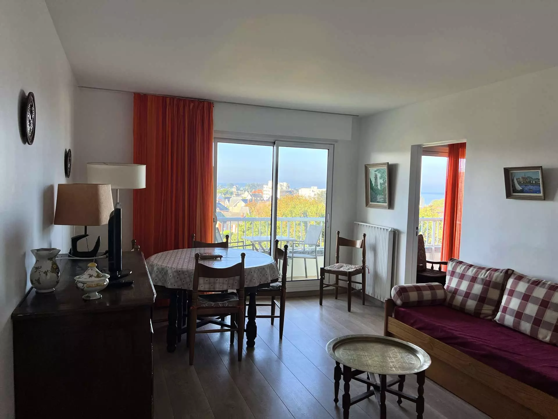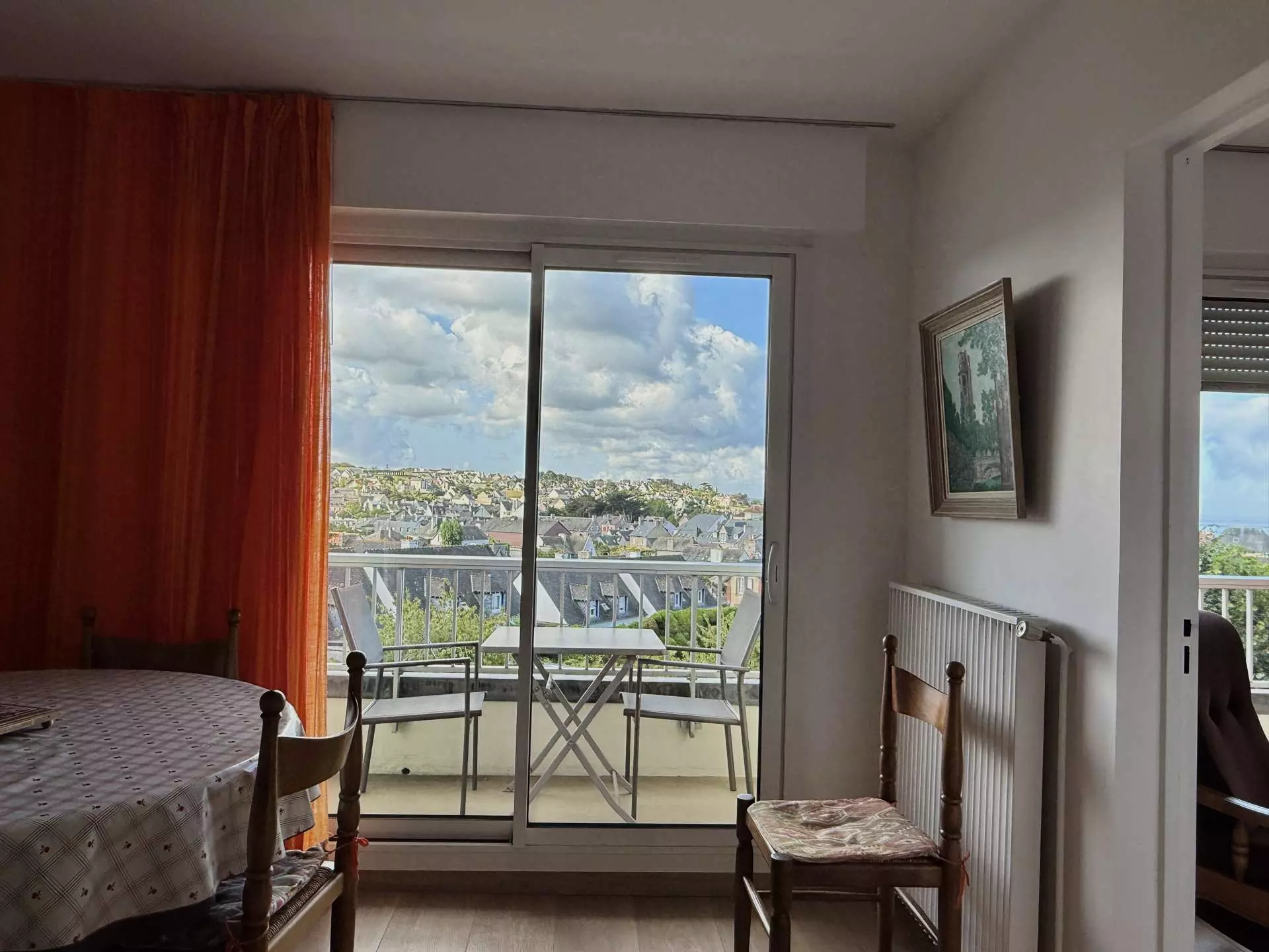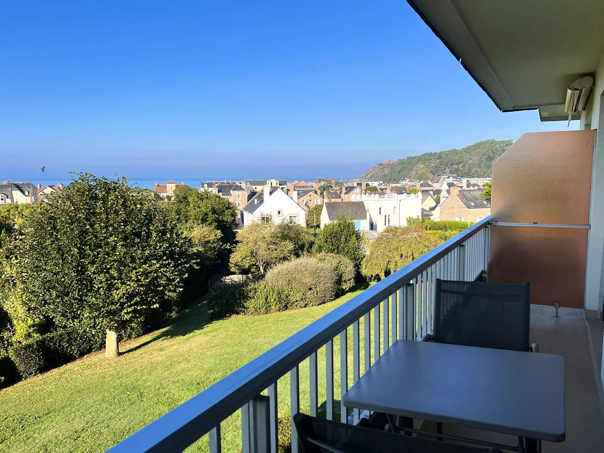 • A balcony furnished with terrace furniture offering a breathtaking view of the town of Erquy, as well as the sea in the background
