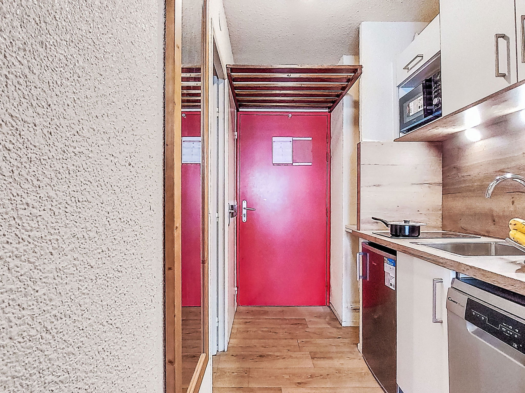 1-room studio 22 m2 on 5th floor, north facing position. Practical furnishings: living/dining room with Dressing room with 1 bed (80 cm, length 190 cm), 1 pull-out bed (1 pers. 2 x 80 cm, length 190 cm), dining table and electric heating. Exit to the balcony, north facing position. Kitchenette (2 hot plates, dishwasher, toaster, kettle, microwave, electric coffee machine). Bathroom, sep. WC. Carpet. Small balcony 3 m2, north facing position. Partial view of the mountains, the valley, the ski run and the resort. Facilities: Internet (WiFi, extra). Please note: non-smokers only. Smoke alarm. Offer by a private individual according to Art. 155, IV of CGI. 73257011391MX