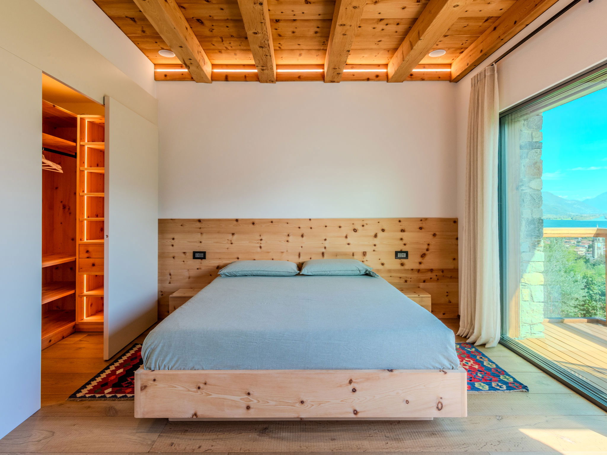 4-room house 150 m2 on 3 levels. Bright, tasteful and wooden furniture furnishings: 1 large double bedroom with panoramic window Dressing room. Exit to the balcony. 1 room with 2 beds. Exit to the garden. Shower/bidet/WC. On the lower ground floor: 1 room with 1 bed and 1 x 2 bunk beds. Shower/bidet/WC. Upper floor: entrance hall. Open large living room with panoramic window with TV and hi-fi system. Exit to the balcony. Open dining room with sliding door, panoramic window. Exit to the terrace. Open kitchen (oven, dishwasher, 4 induction hot plates, toaster, kettle, microwave, electric coffee machine) with small bar. Shower/bidet/WC. Air-conditioning, forced-air heating. Wooden floors. 2 balconies, terrace. Terrace furniture, balcony furniture, deck chairs (4). Panoramic view of the lake and the countryside. Facilities: washing machine, children's high chair, baby cot for up to 2 year olds, hair dryer. Internet (WiFi, free). Parking (fenced 2 cars). Please note: non-smoking house. Fire extinguisher. IT013089C2A3TFPPW9