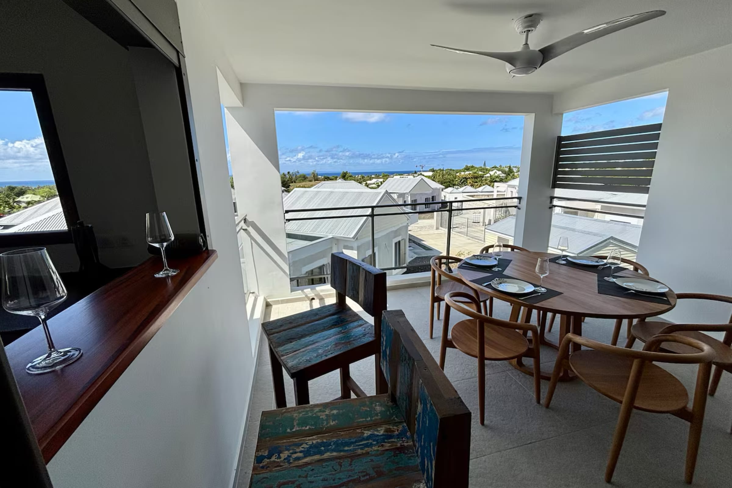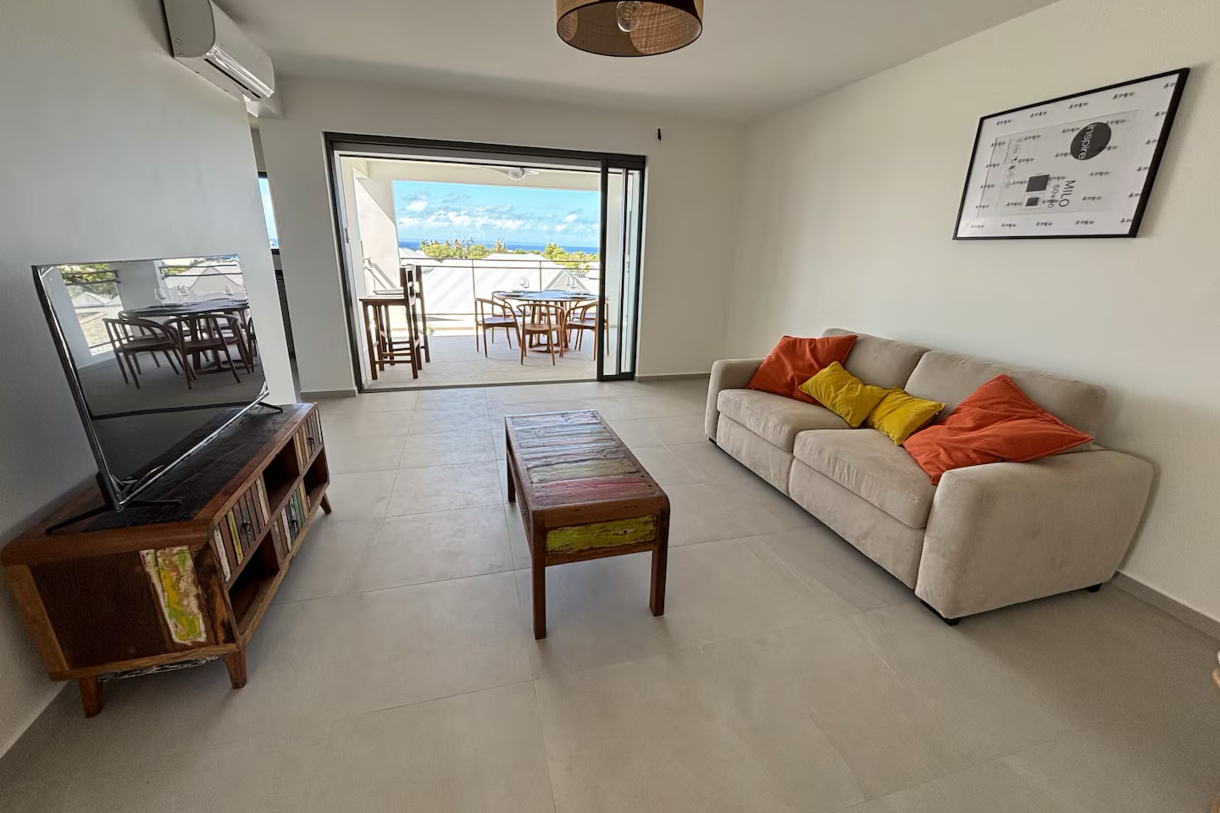 The terrace invites you to unwind while enjoying the spectacular view of Marie-Galante and Petite Terre – the perfect setting for a morning coffee or a sunset aperitif.