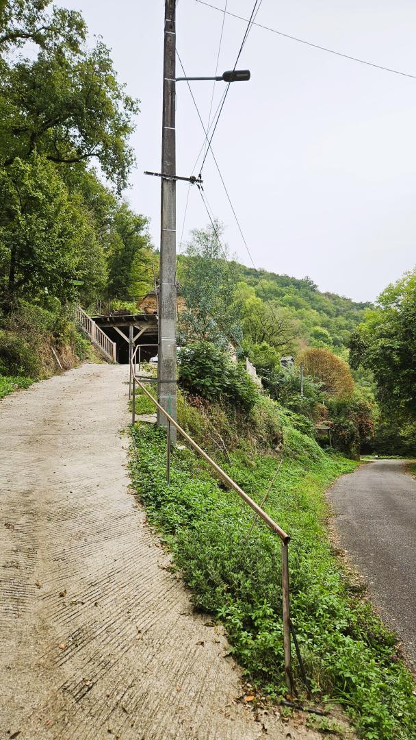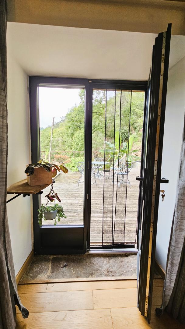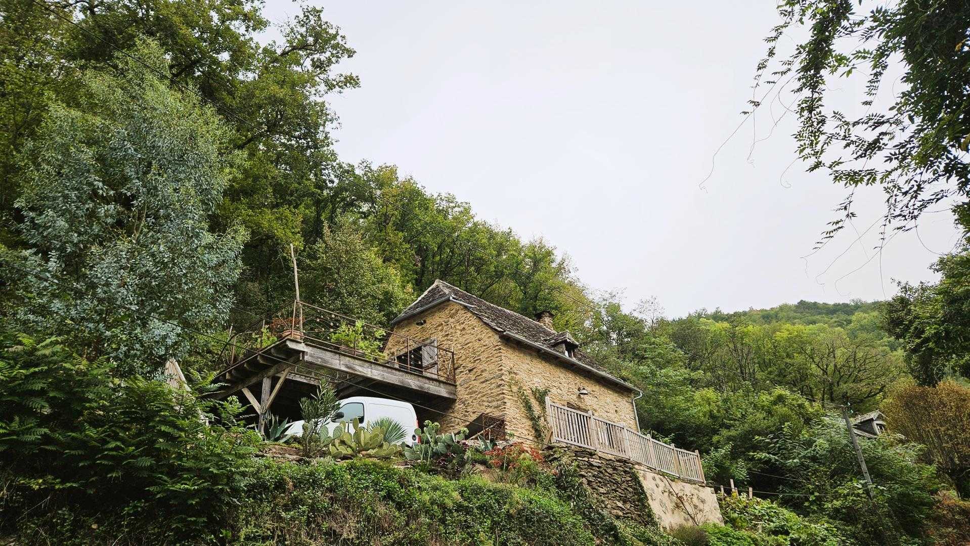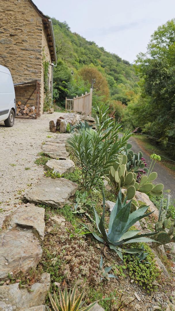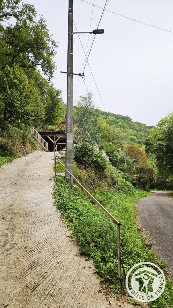 The property is surrounded by vegetation, providing a peaceful and natural setting. Access is via a sloping path, with parking nearby. Located in a wooded environment with no overlooked views.