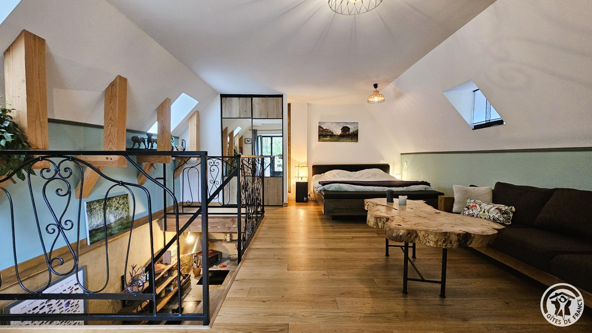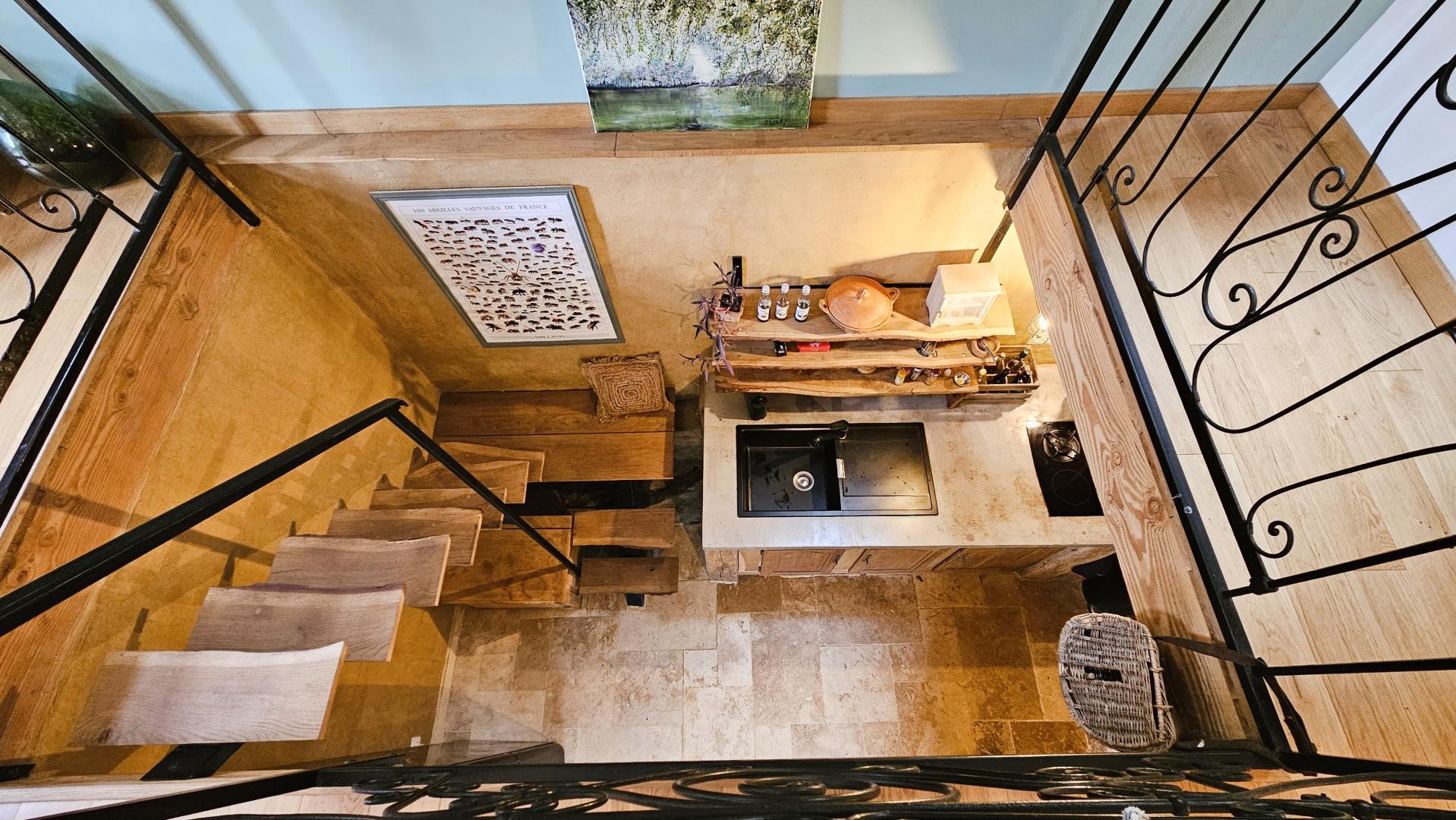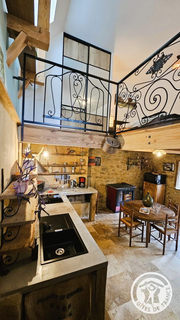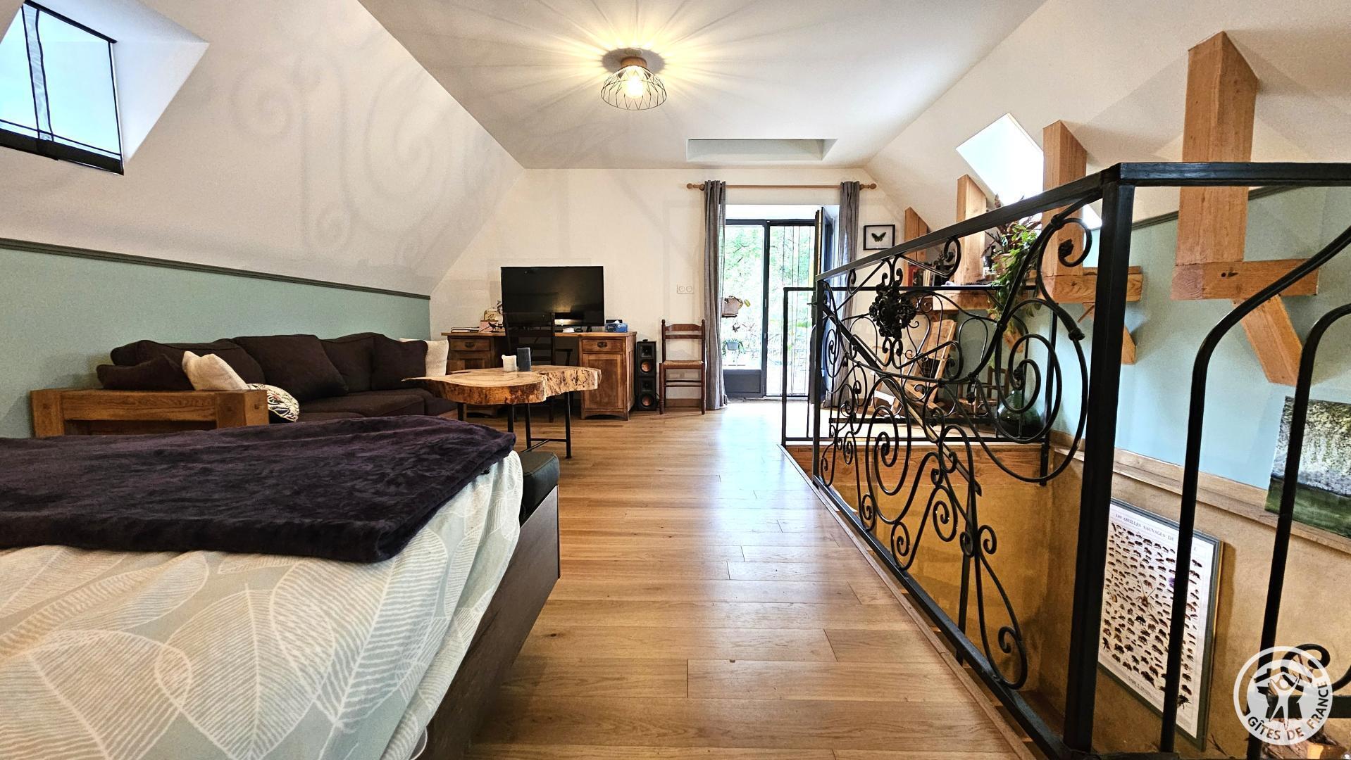 Upstairs: a mezzanine equipped with a king-size bed, a sofa, a desk, a chair, and a television, offering direct access to the terrace with a garden table and chairs. Ideally located in Argentat-sur-Dordogne, a stone's throw from the peaceful Maronne River, this charming gîte, a former winemaker's house, completely renovated by the owner with care, combines authenticity and modern comfort.