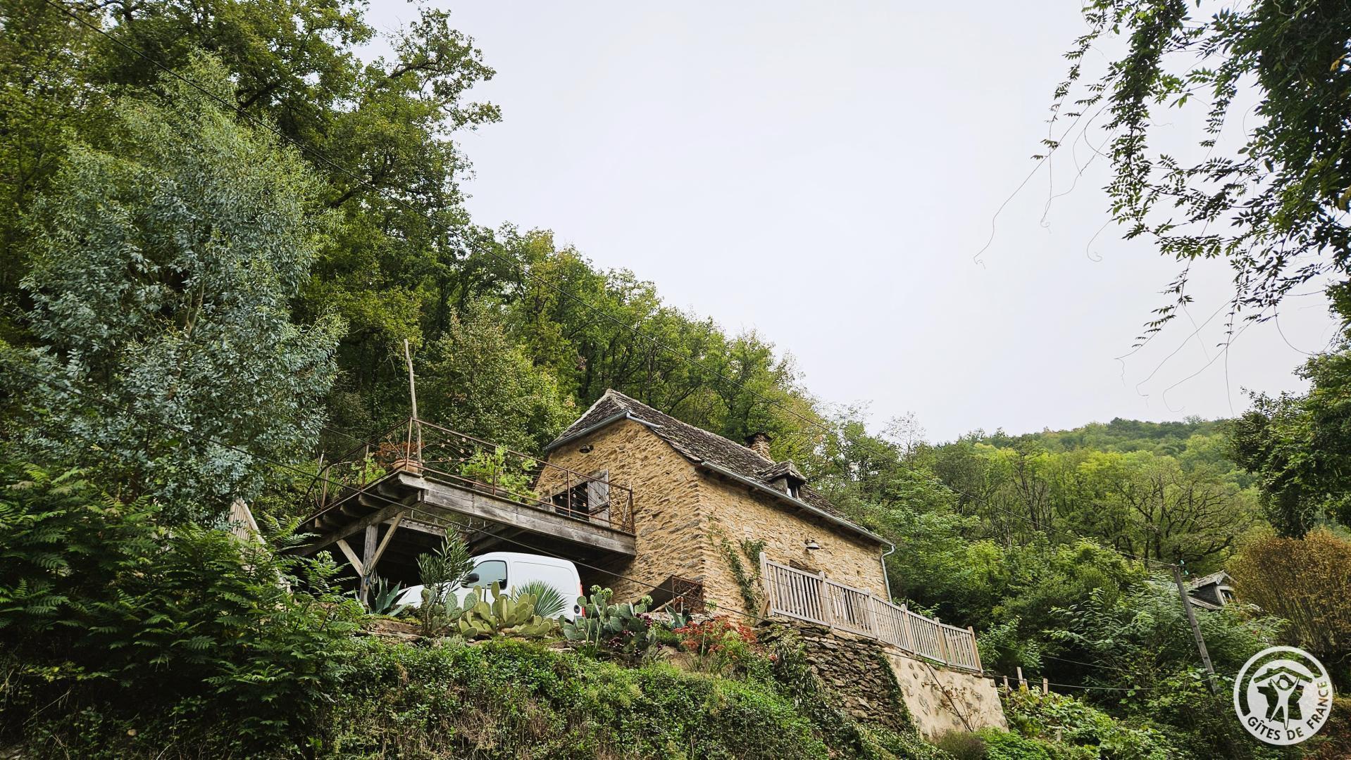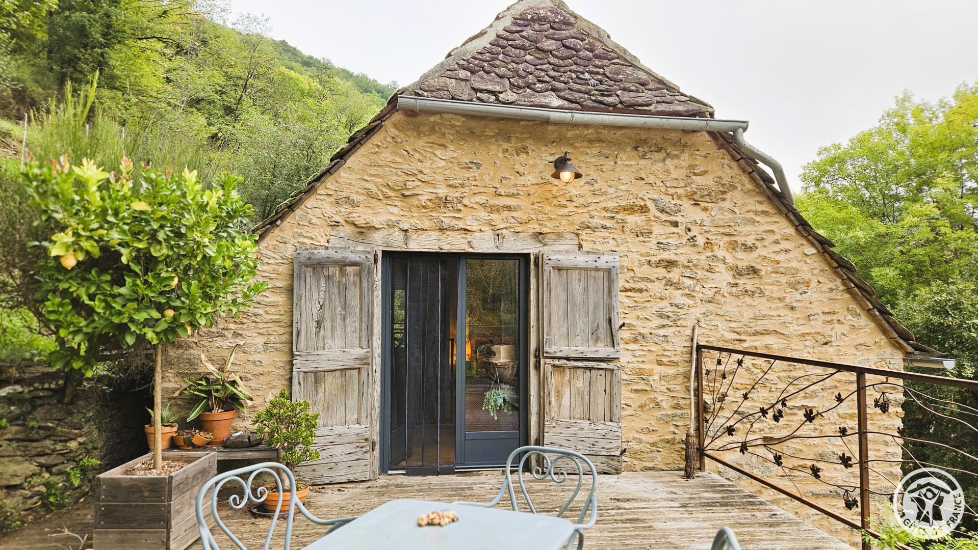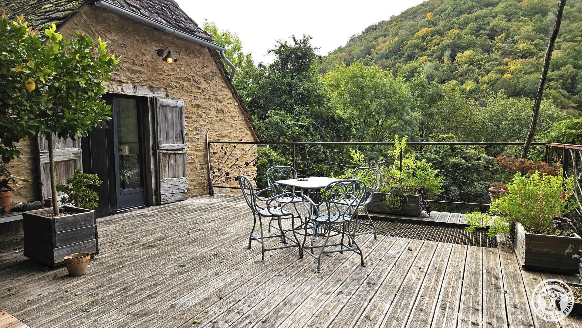Stone cottage with slate roof, including a large raised terrace equipped with a small bath.