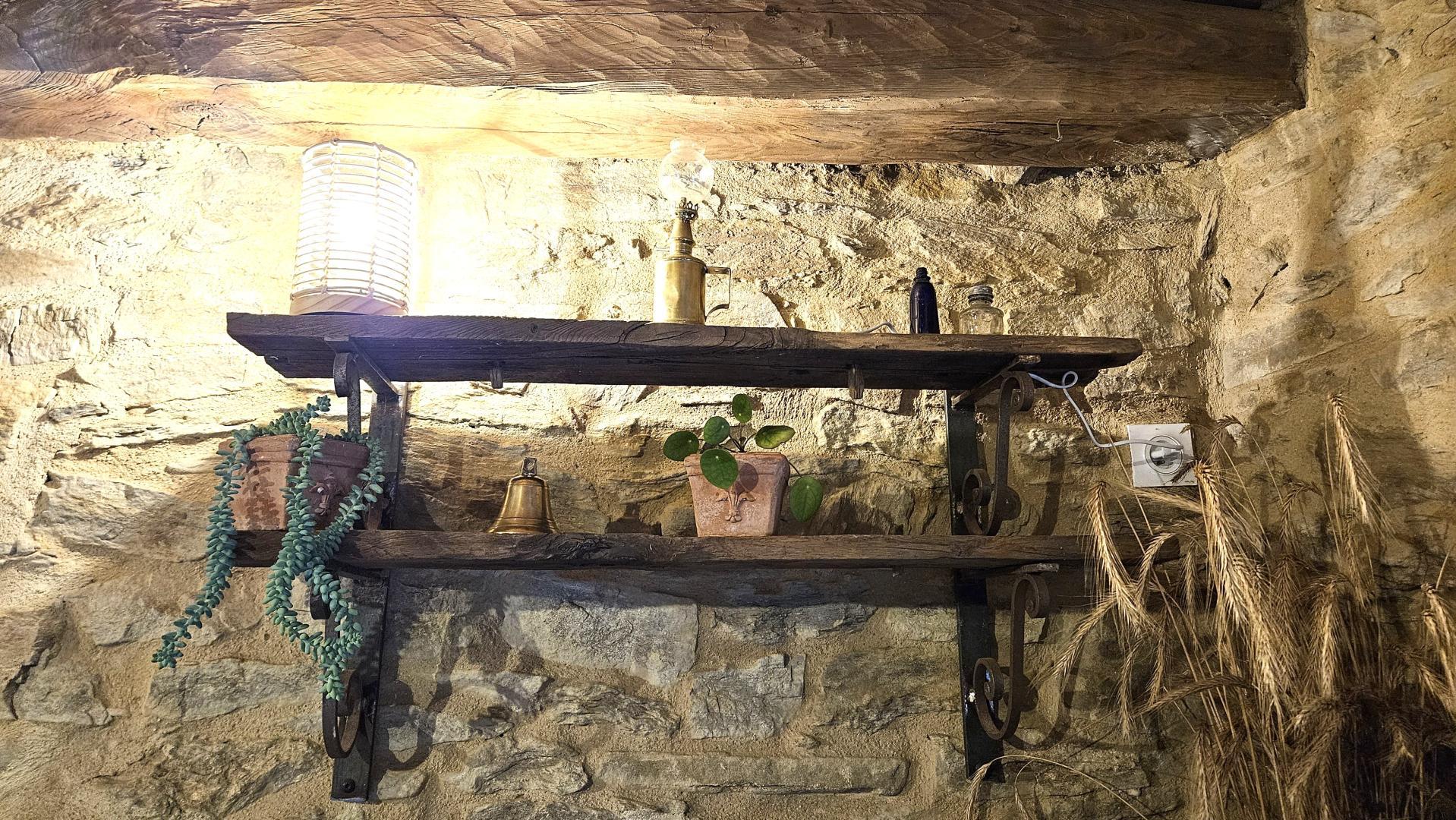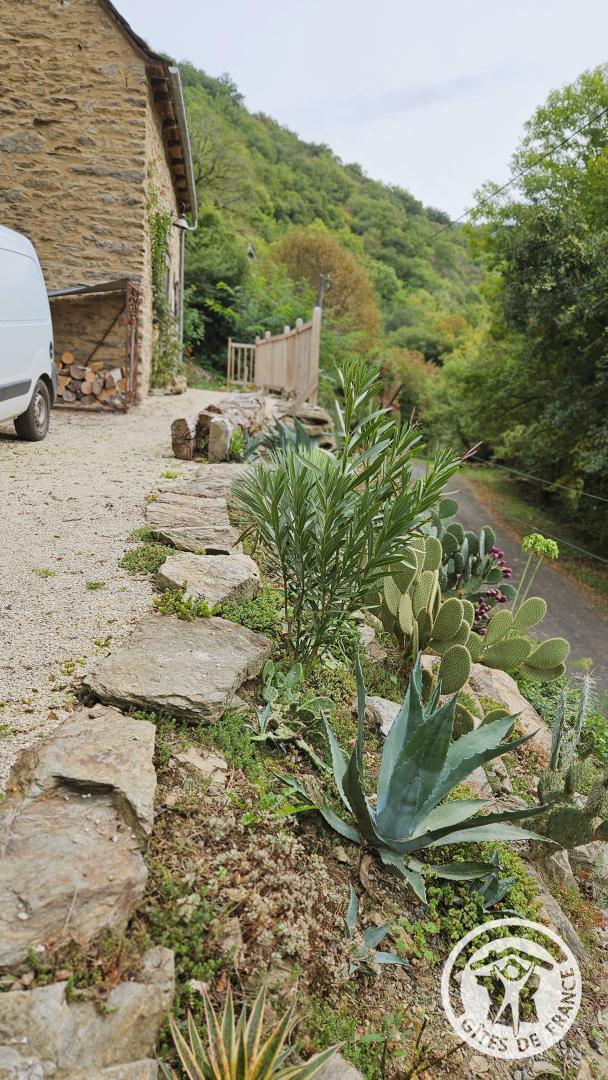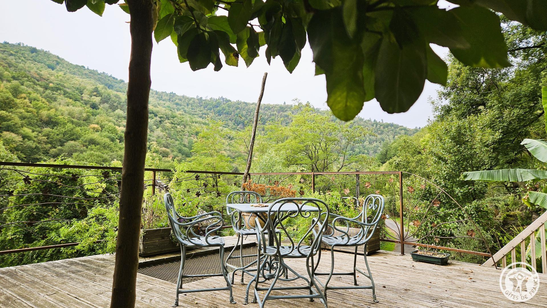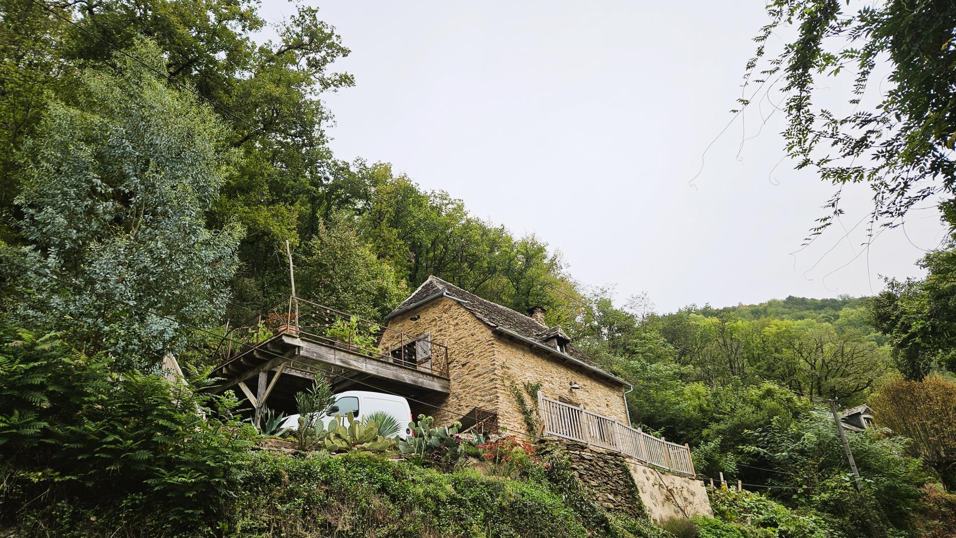 Stone cottage with slate roof, including a large raised terrace equipped with a small bath.