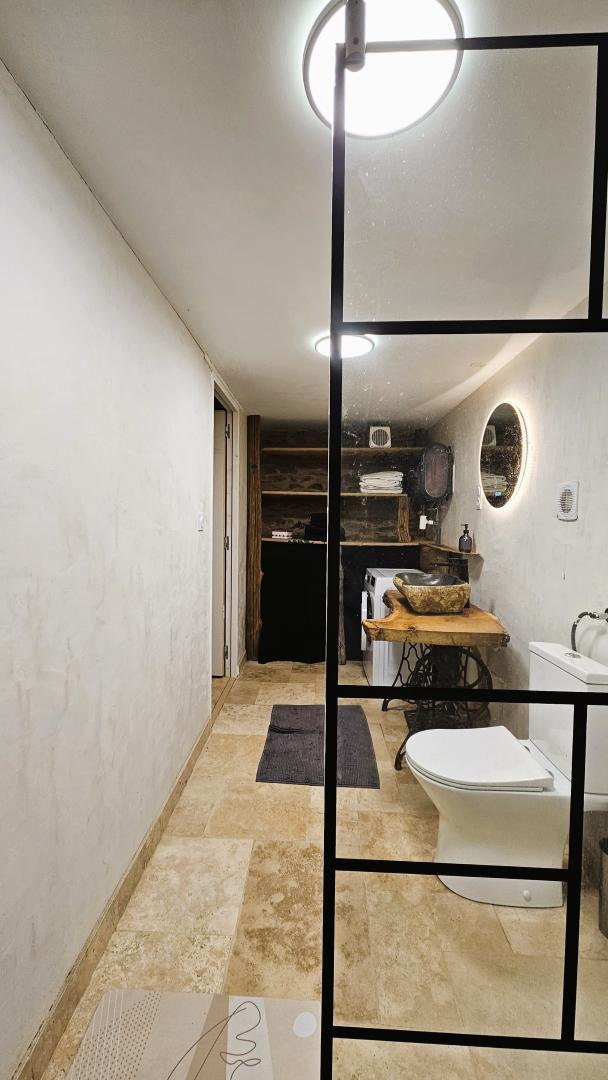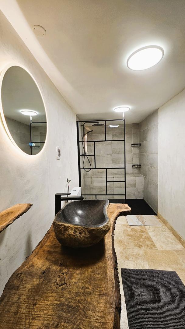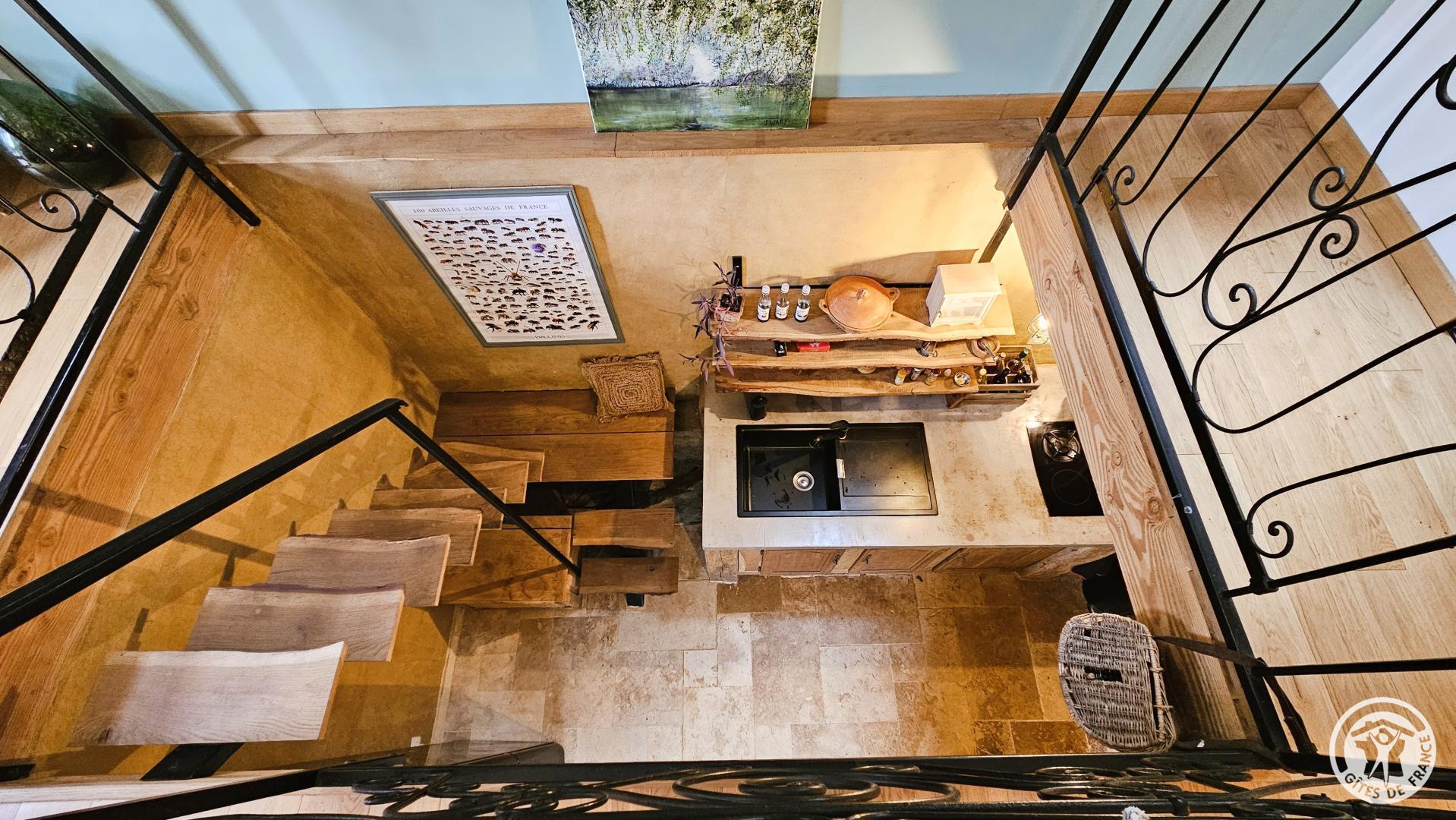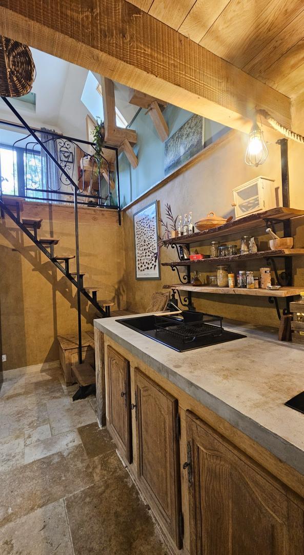 The kitchen opens onto a cozy mezzanine and features a large 180 cm bed for peaceful nights. From the mezzanine, a large elevated terrace offers an ideal space for enjoying the sun or dining outdoors. In summer, a small ornamental pool, similar to a mini swimming pool, provides a refreshing dip, perfect for dipping your feet or relaxing.