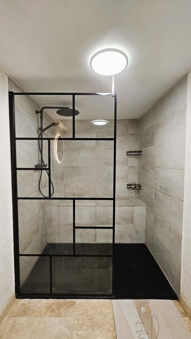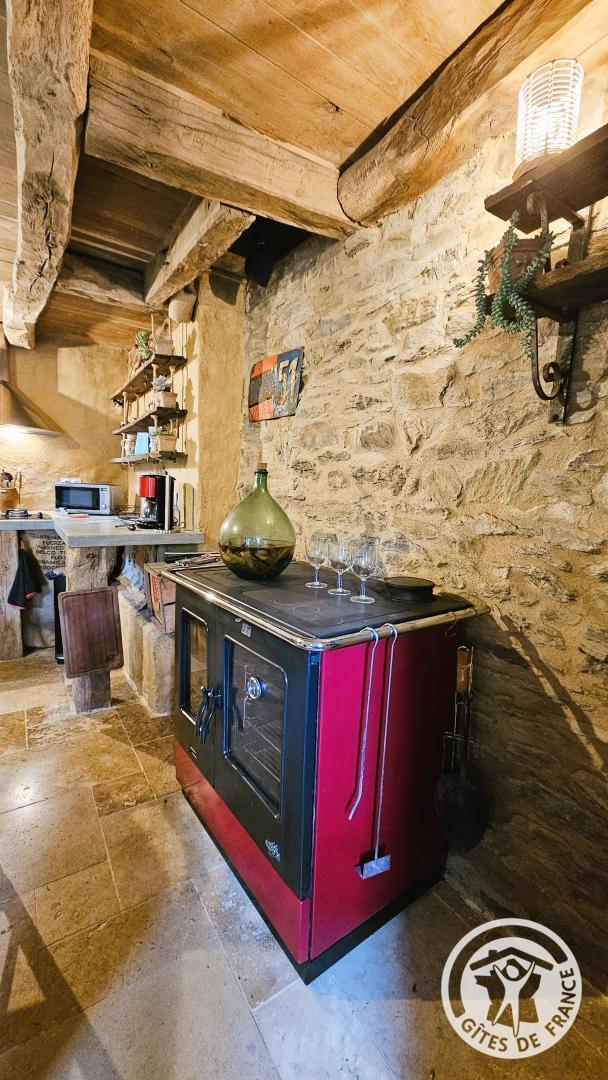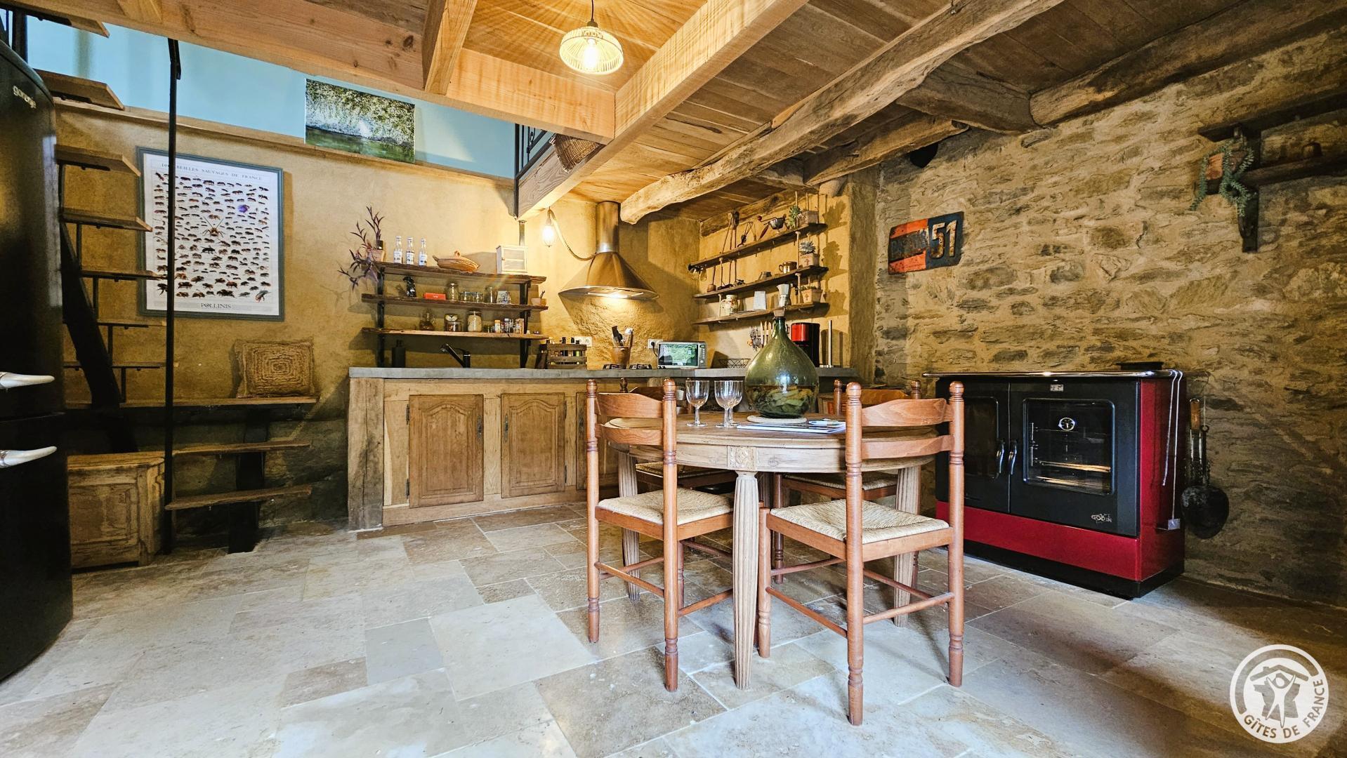 On the ground floor: a fitted kitchen including a refrigerator, a wood-burning stove, an oven, a microwave, a filter coffee maker, a pod coffee maker, a kettle, a toaster, as well as a bathroom with a walk-in shower and WC.