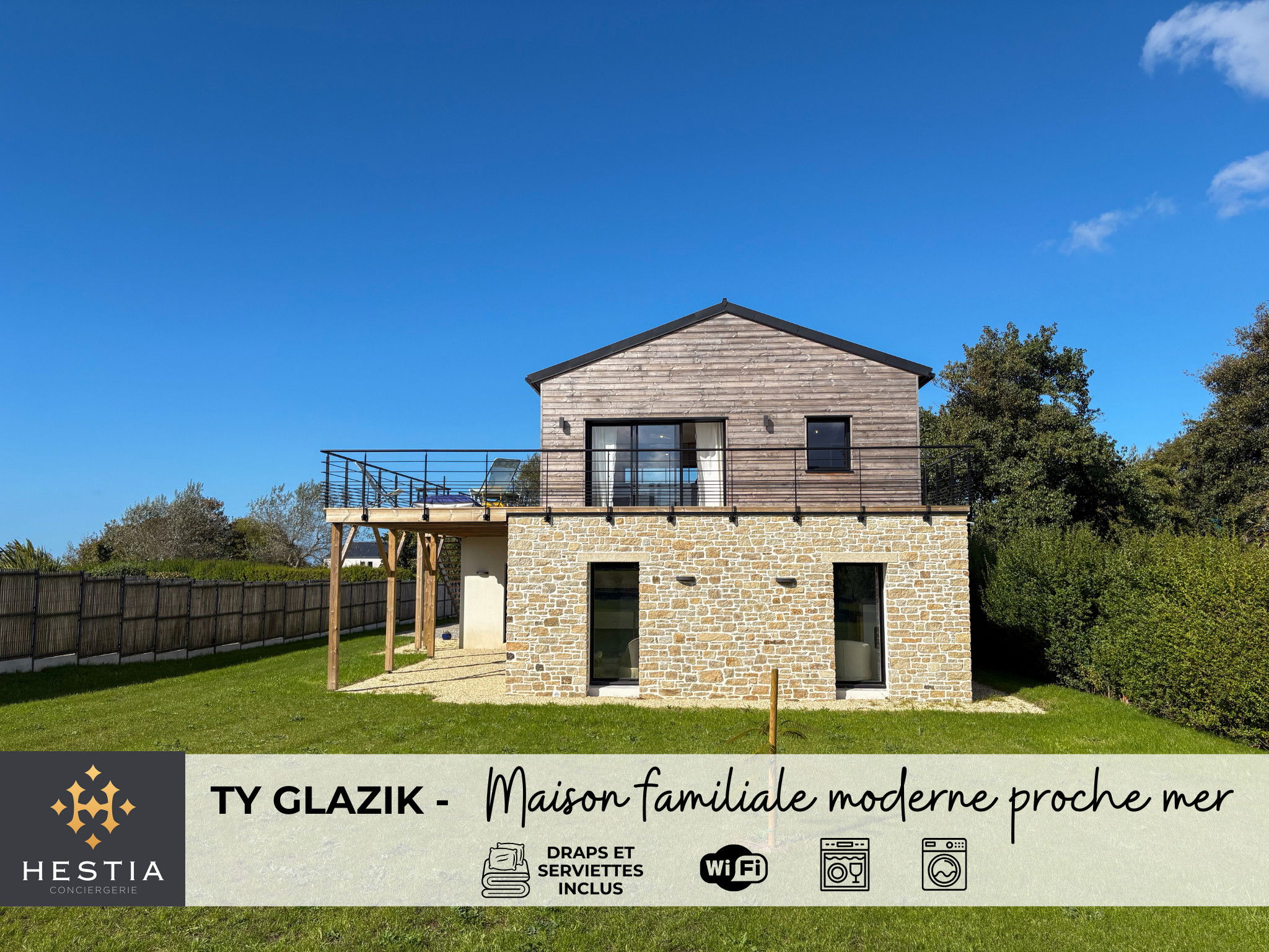 Welcome to TY Glazik, a beautiful contemporary house located in the charming commune of Saint-Pabu. Nestled in a peaceful neighbourhood, this spacious house offers all the necessary comfort to accommodate up to 9 people, in an ideal setting for family or friends' holidays.