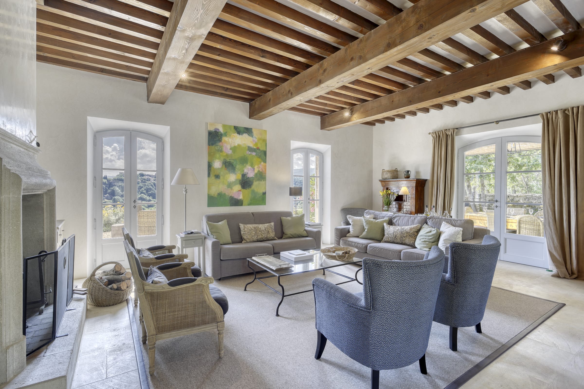 . Charming and tastefully decorated living room with fireplace, TV, a 3 seater armchair, a 4 seater armchair, 2 bleu armchairs and access to the terraces.
