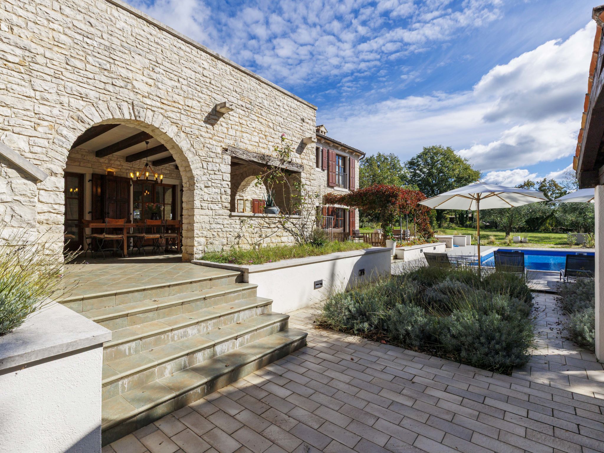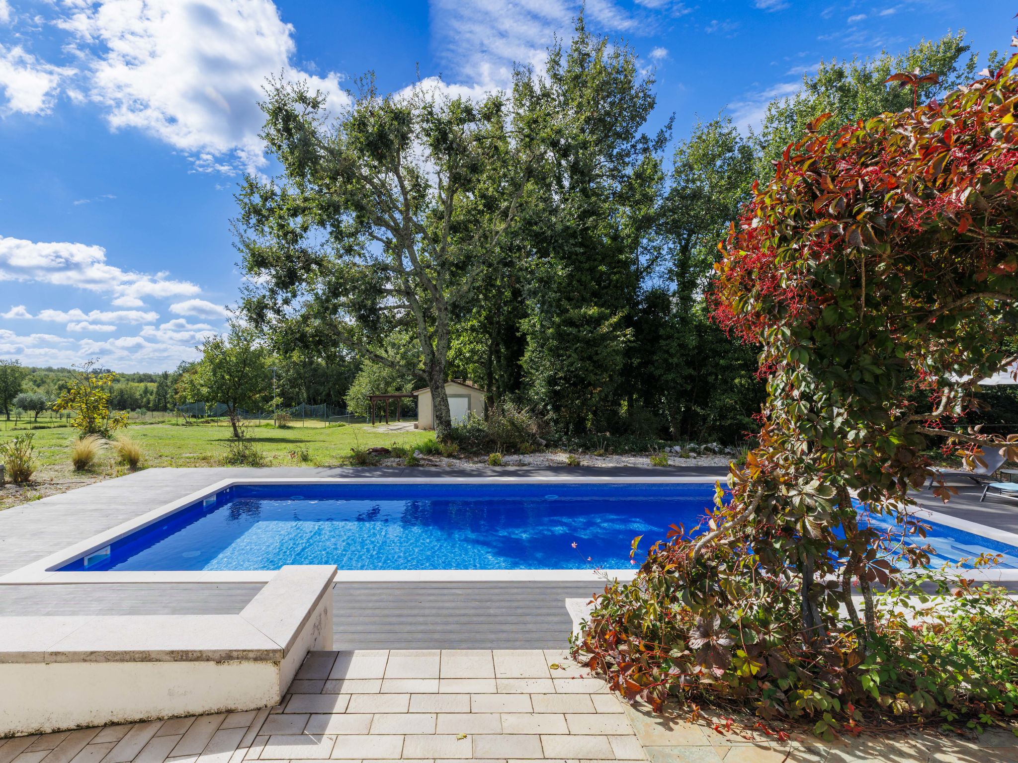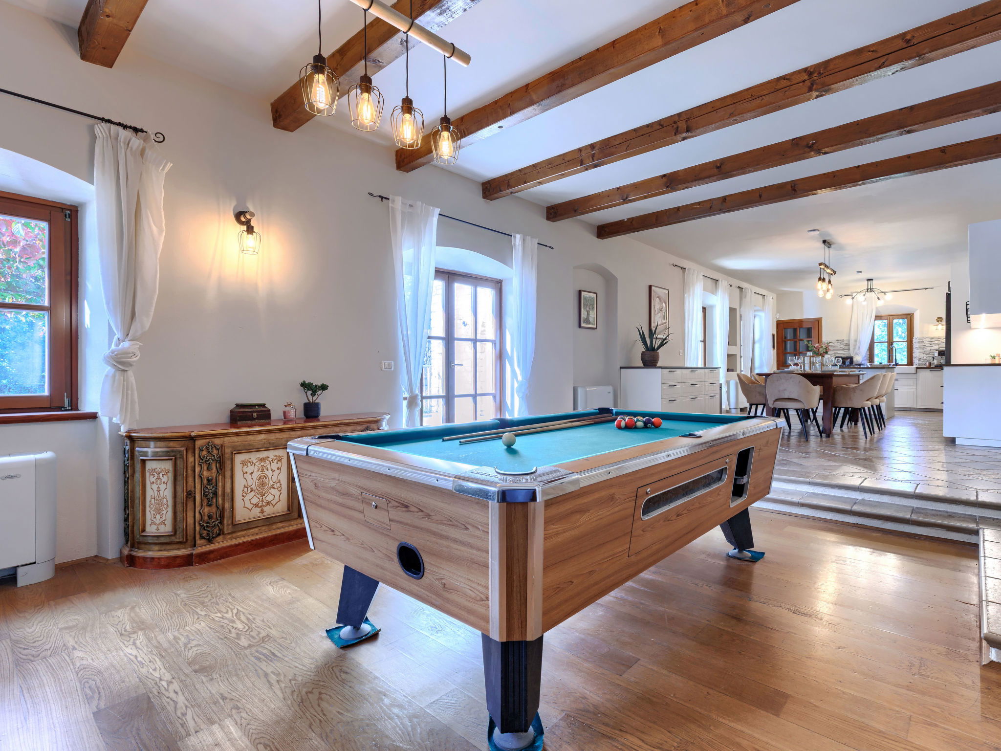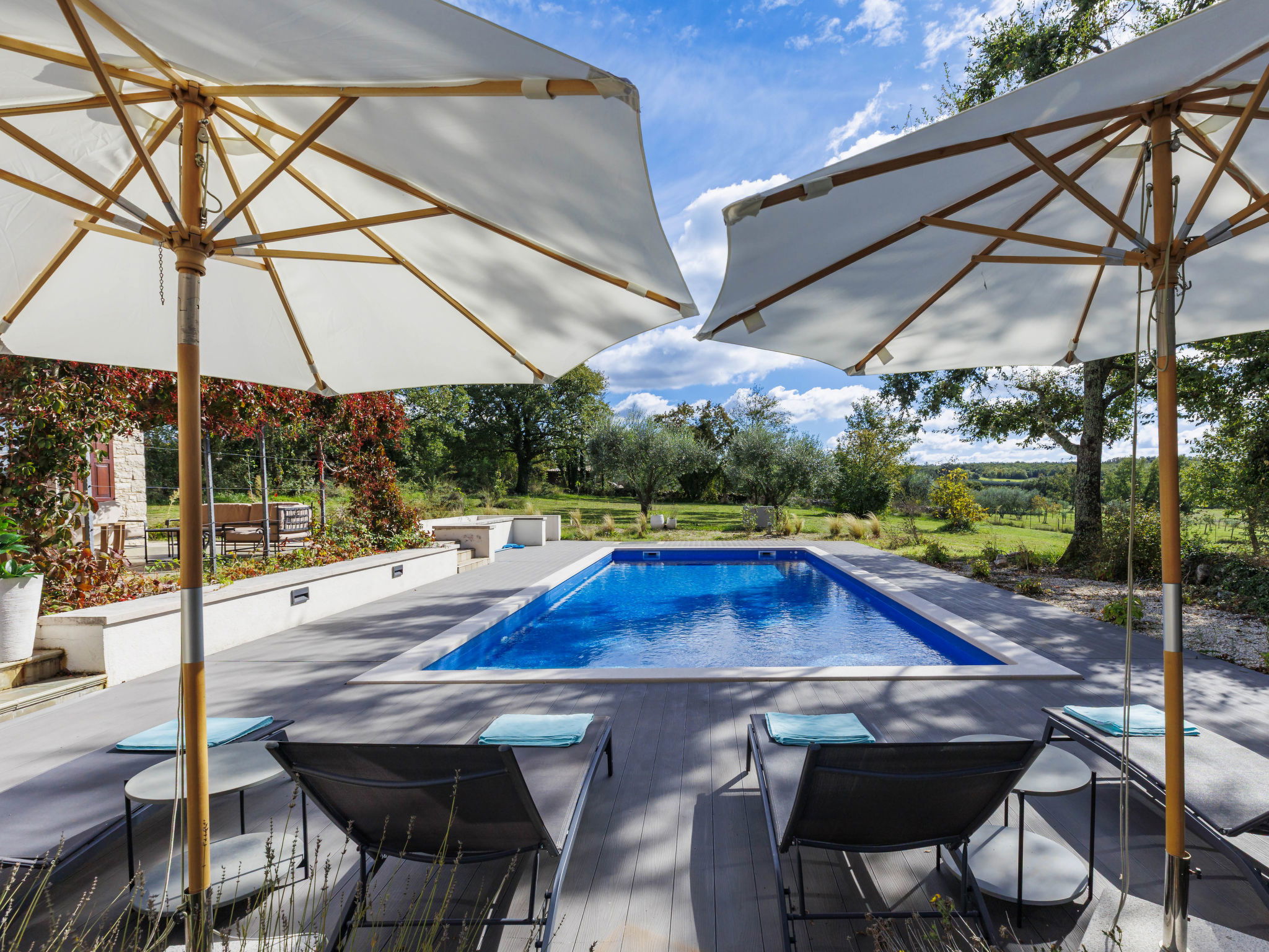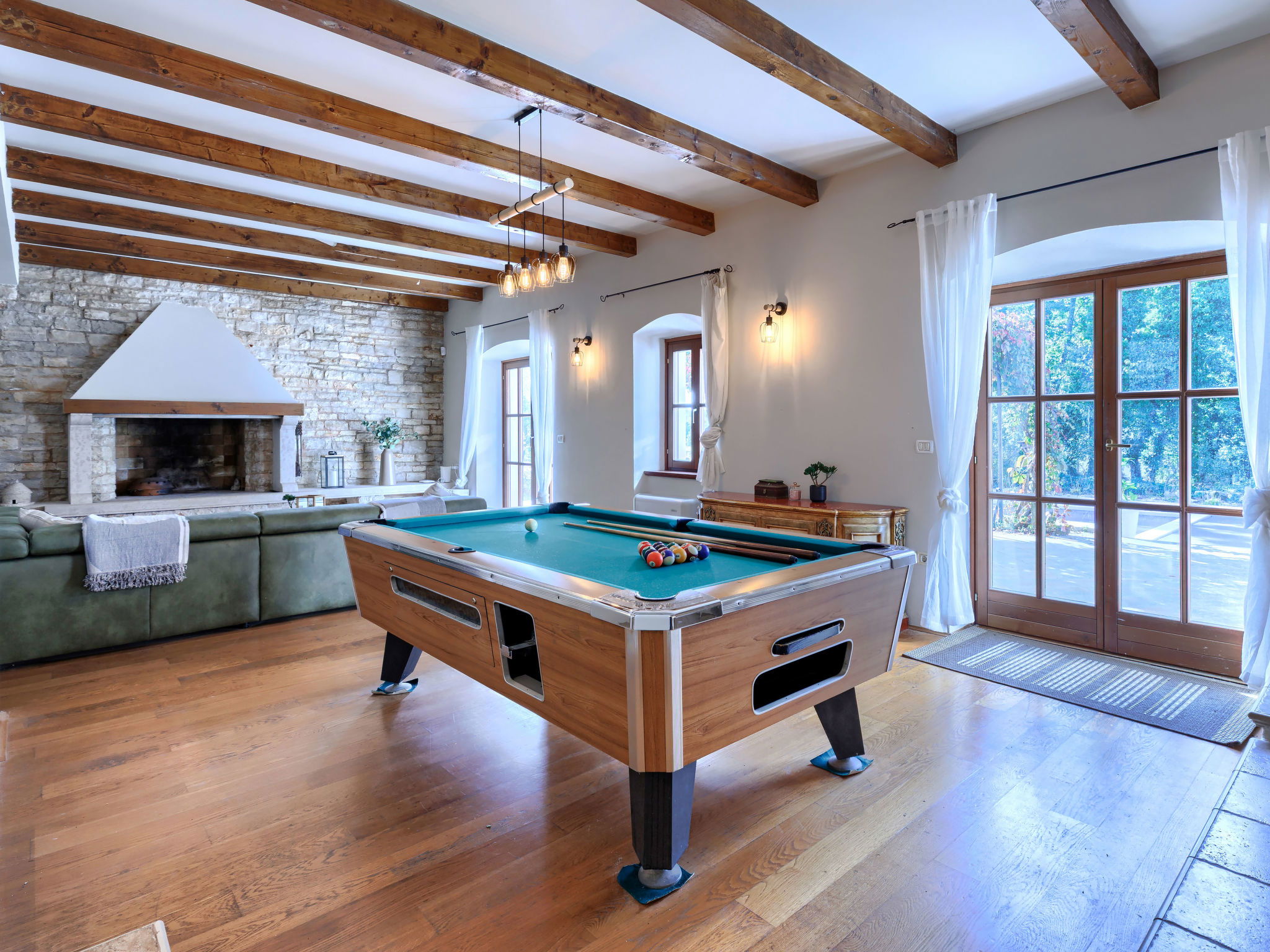 Beautiful villa "Nadua", 2 storeys. In the hamlet Košutići 5.5 km from the centre of Višnjan, in a quiet, sunny position, 15 km from the sea, in a cul-de-sac, in the countryside. Private: property 3'000 m2 with lawn and wildlife garden, swimming pool angular, heated (15 x 4 m, depth 140 - 160 cm, seasonal availability: 01.May. - 30.Sep.) with internal staircase. Outdoor shower, patio, garden furniture, barbecue. In the house: internet access, billiard table, washing machine. Parking (for 4 cars) at the house on the premises. Shop 5.5 km, supermarket 16 km, restaurant 2.5 km, bus stop 5.5 km. Walking paths from the house 50 m, cycle lane 100 m. Nearby attractions: Winery 4 km. Please note: airfield 60 km from the property. Paddling pool (5 m2, depth 40 cm, 01.05.-30.09.).
