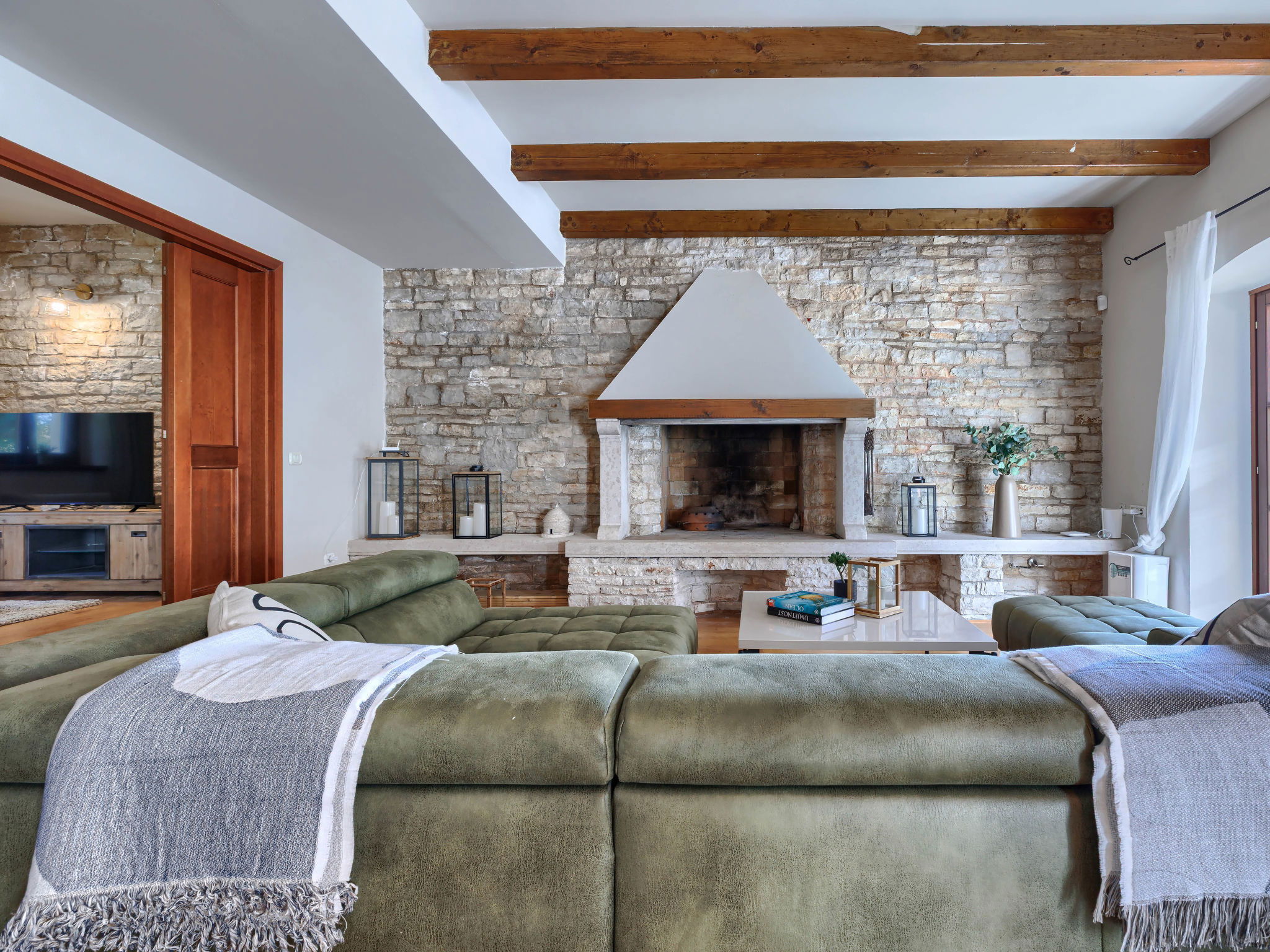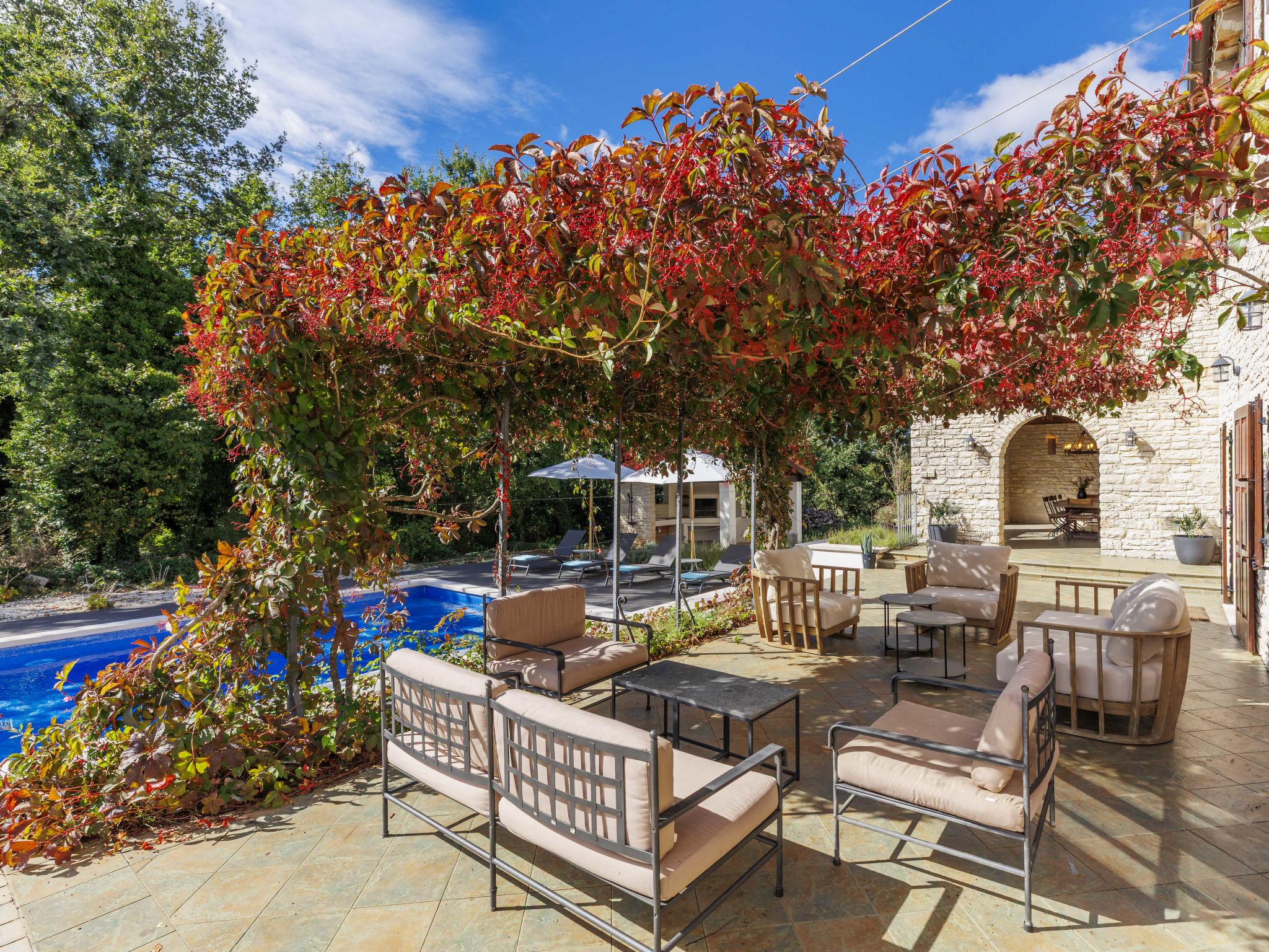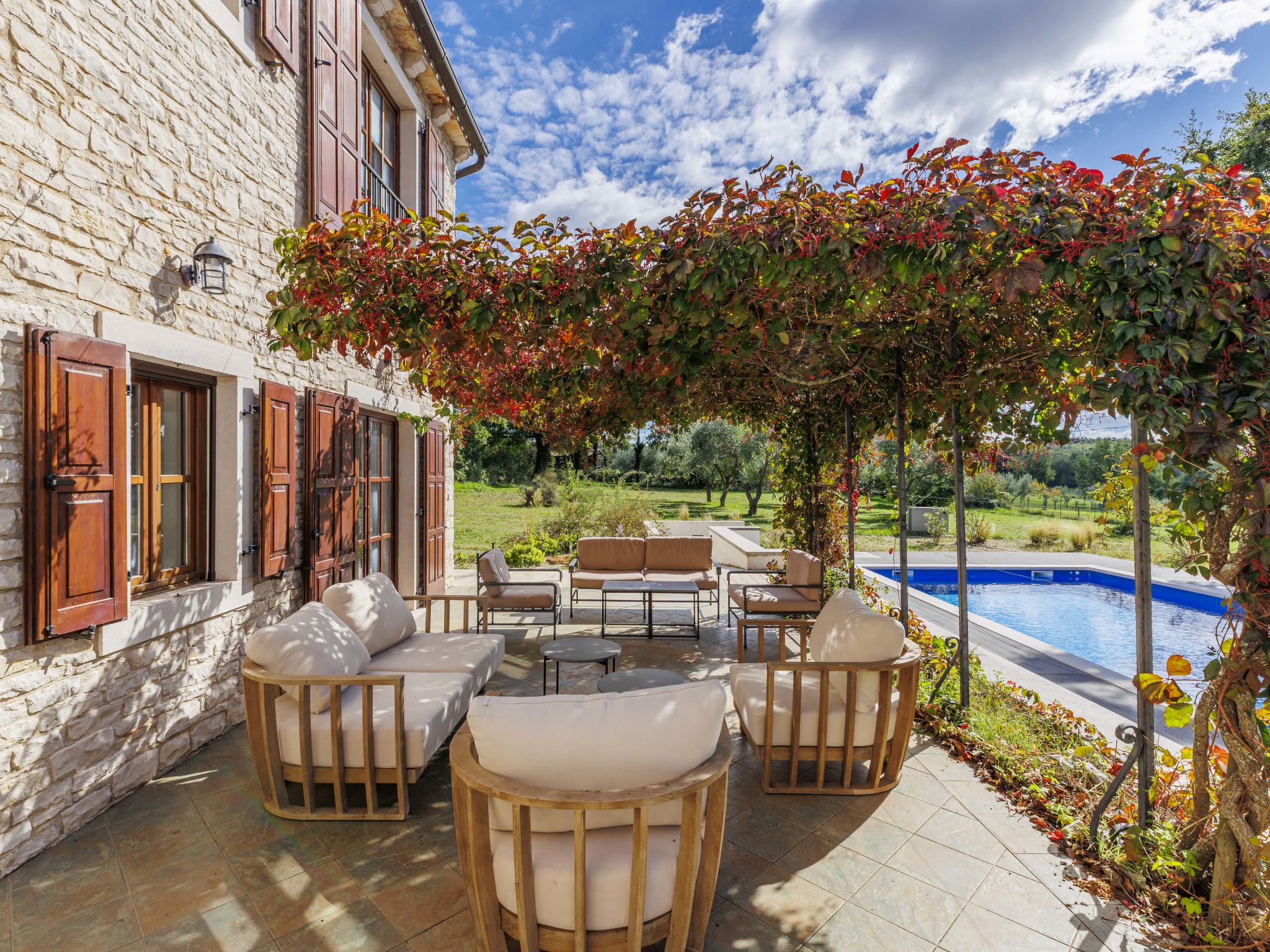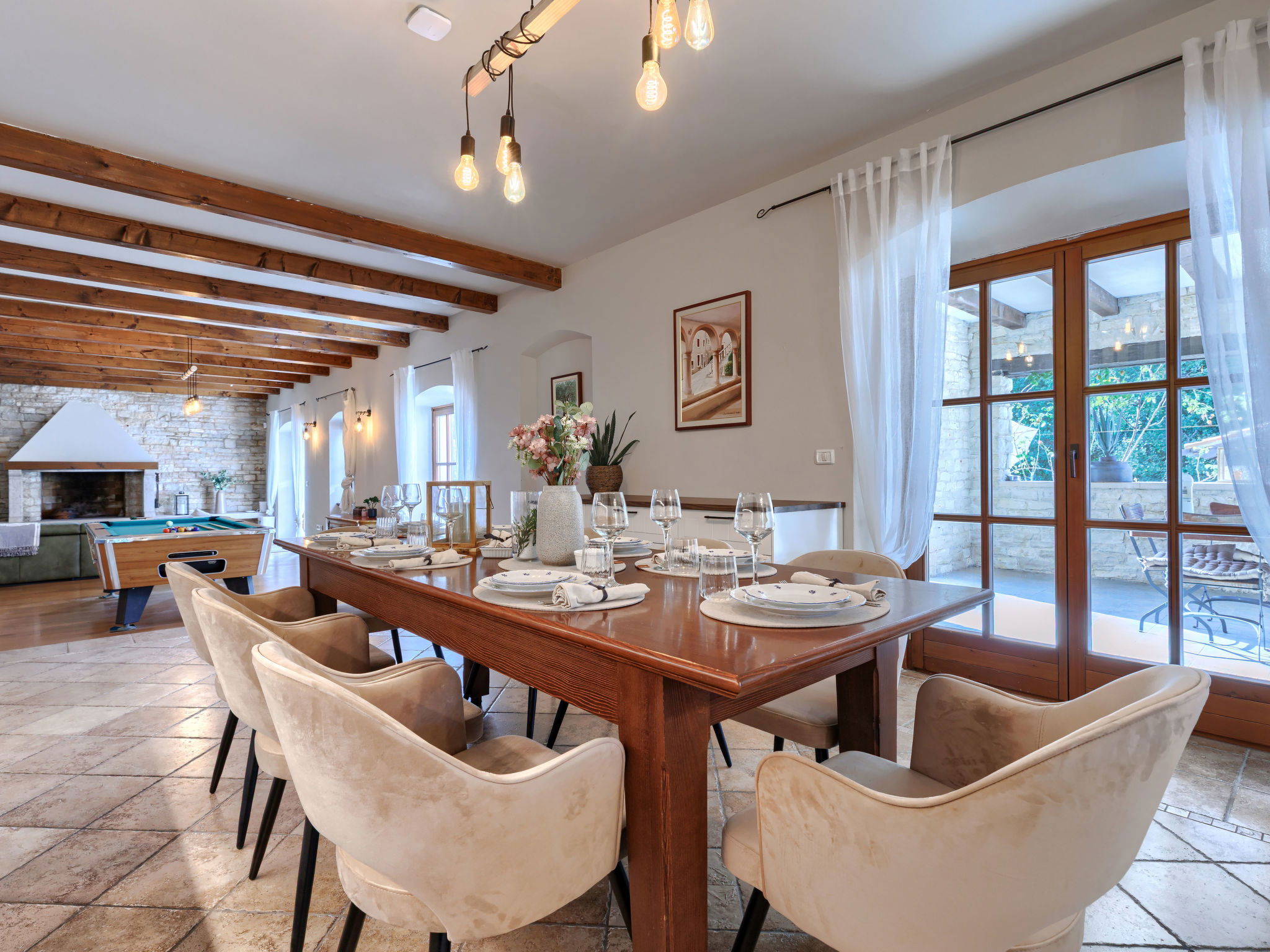 Beautiful villa "Nadua", 2 storeys. In the hamlet Košutići 5.5 km from the centre of Višnjan, in a quiet, sunny position, 15 km from the sea, in a cul-de-sac, in the countryside. Private: property 3'000 m2 with lawn and wildlife garden, swimming pool angular, heated (15 x 4 m, depth 140 - 160 cm, seasonal availability: 01.May. - 30.Sep.) with internal staircase. Outdoor shower, patio, garden furniture, barbecue. In the house: internet access, billiard table, washing machine. Parking (for 4 cars) at the house on the premises. Shop 5.5 km, supermarket 16 km, restaurant 2.5 km, bus stop 5.5 km. Walking paths from the house 50 m, cycle lane 100 m. Nearby attractions: Winery 4 km. Please note: airfield 60 km from the property. Paddling pool (5 m2, depth 40 cm, 01.05.-30.09.).