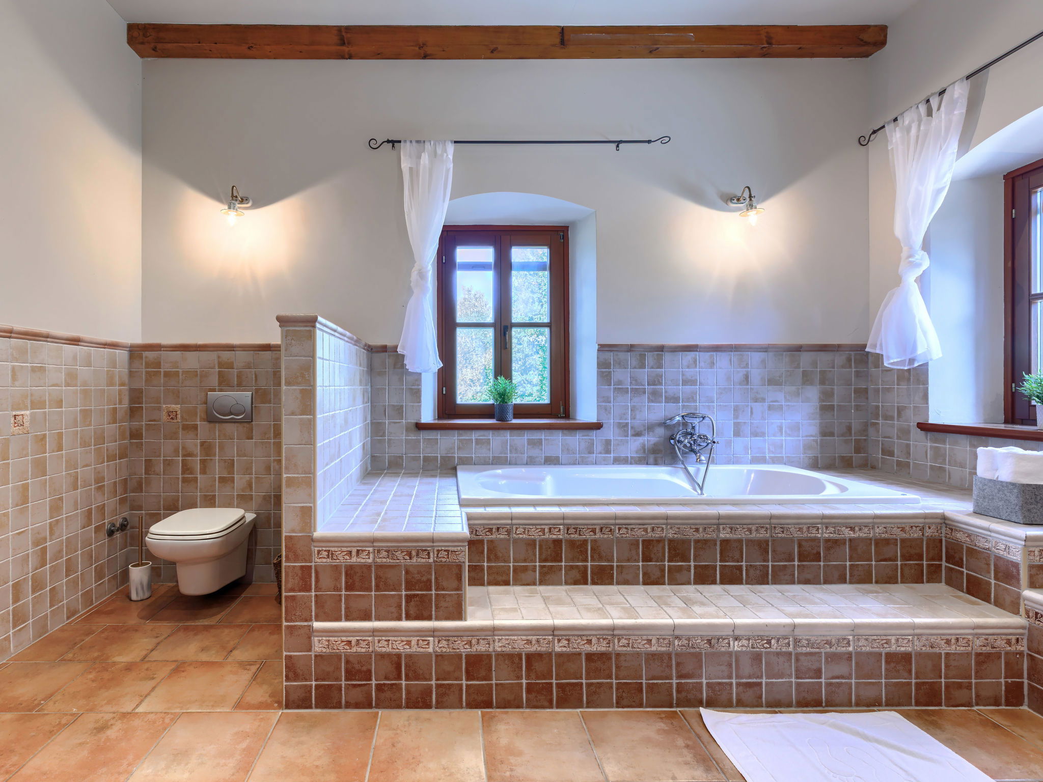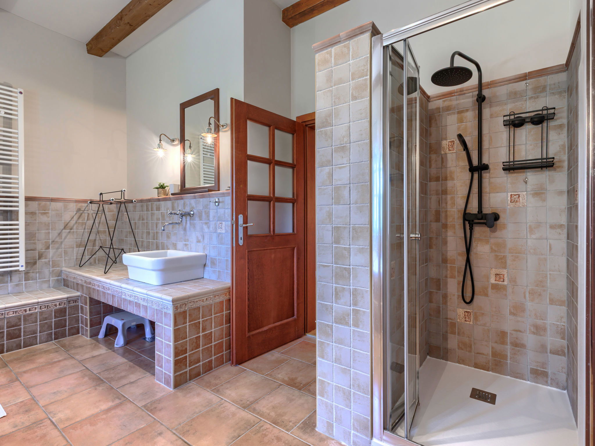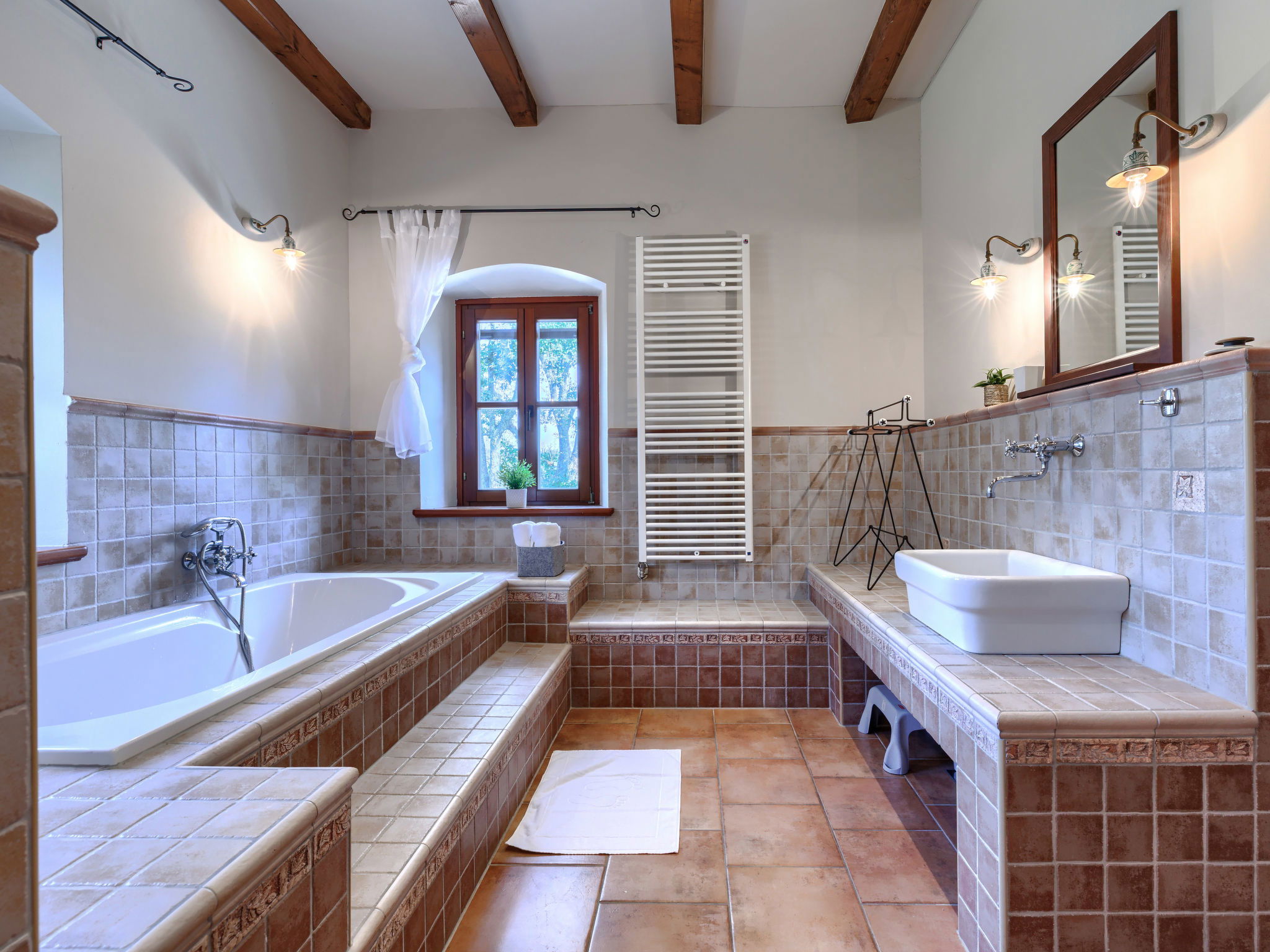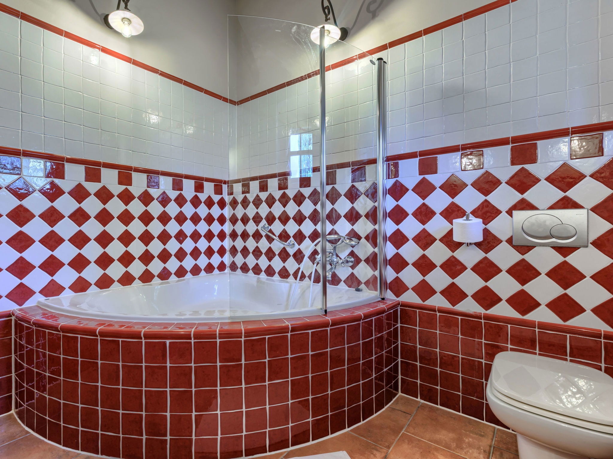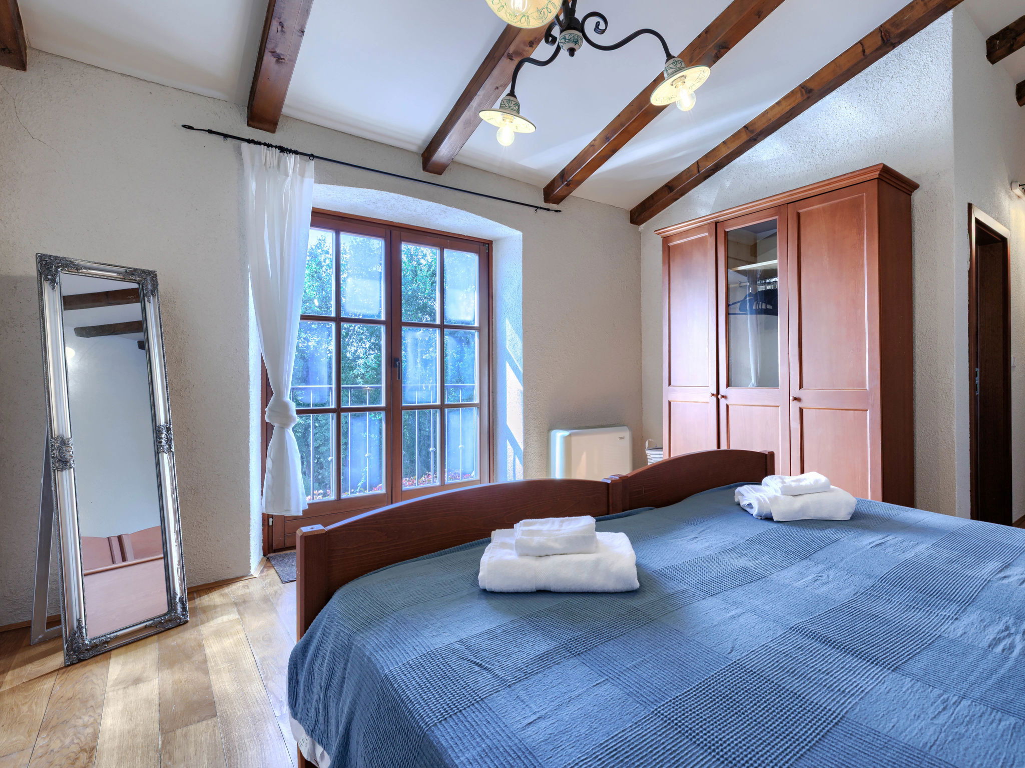 6-room villa 200 m2 on 2 levels. Spacious, stylish and cosy furnishings: living/dining room with open-hearth fireplace (only for decoration), TV and air conditioning. Exit to the terrace. 1 room with 1 french bed (160 cm, length 200 cm), shower/WC and air conditioning. Open kitchen (oven, dishwasher, 5 gas rings, toaster, kettle, microwave, freezer, electric coffee machine). Shower/WC. Upper floor: 1 room with 1 french bed (180 cm, length 200 cm), bath/shower/WC and air conditioning. Exit to the terrace. 2 rooms, each room with 2 beds (90 cm, length 200 cm), shower/WC and air conditioning. 1 room with 2 beds (90 cm, length 200 cm), bath/WC, with corner bath and air conditioning. Terrace 30 m2. Terrace furniture, deck chairs. Beautiful view of the countryside. Facilities: iron, hair dryer. Internet (WiFi, free). Maximum 2 pets/ dogs allowed.