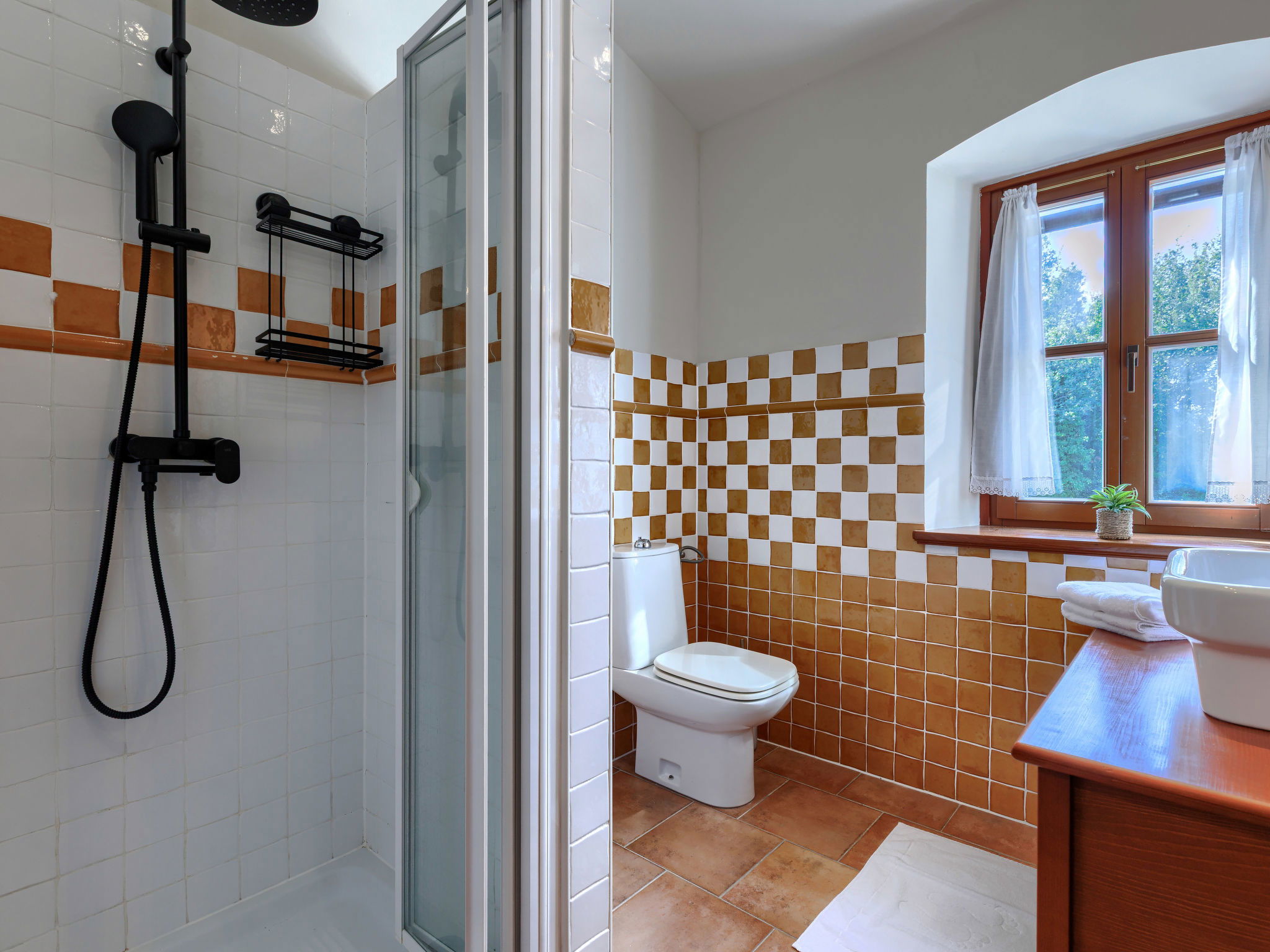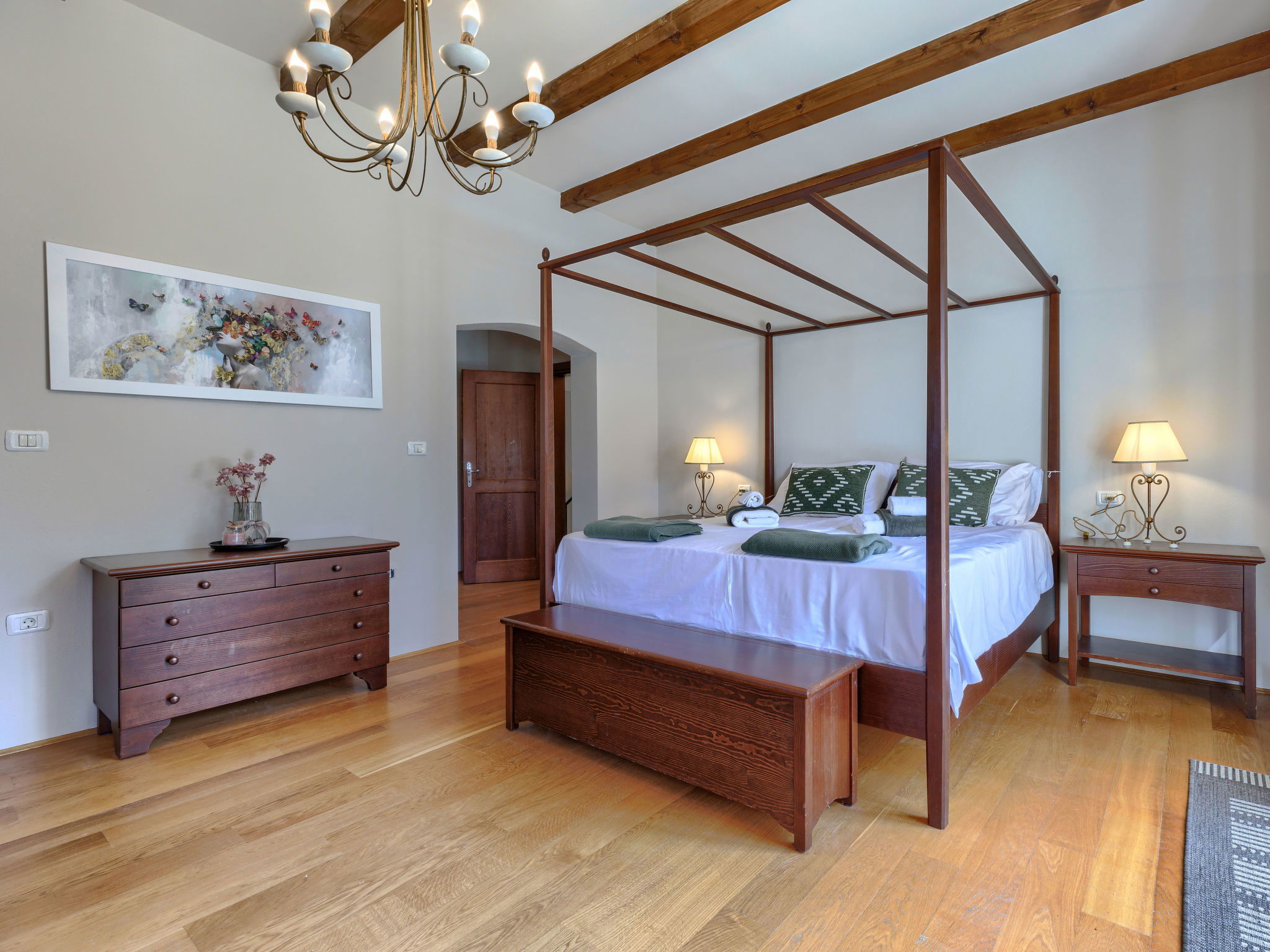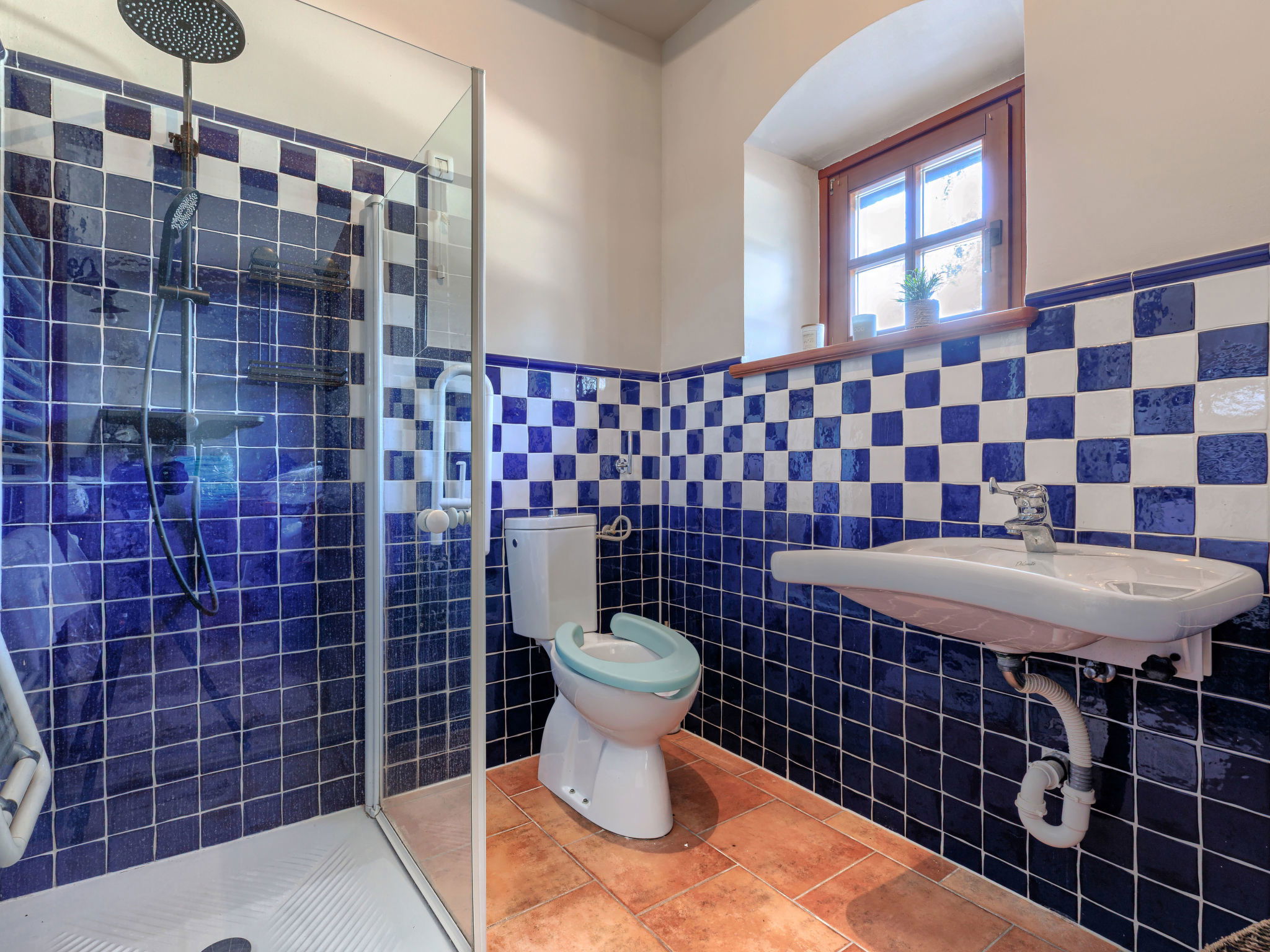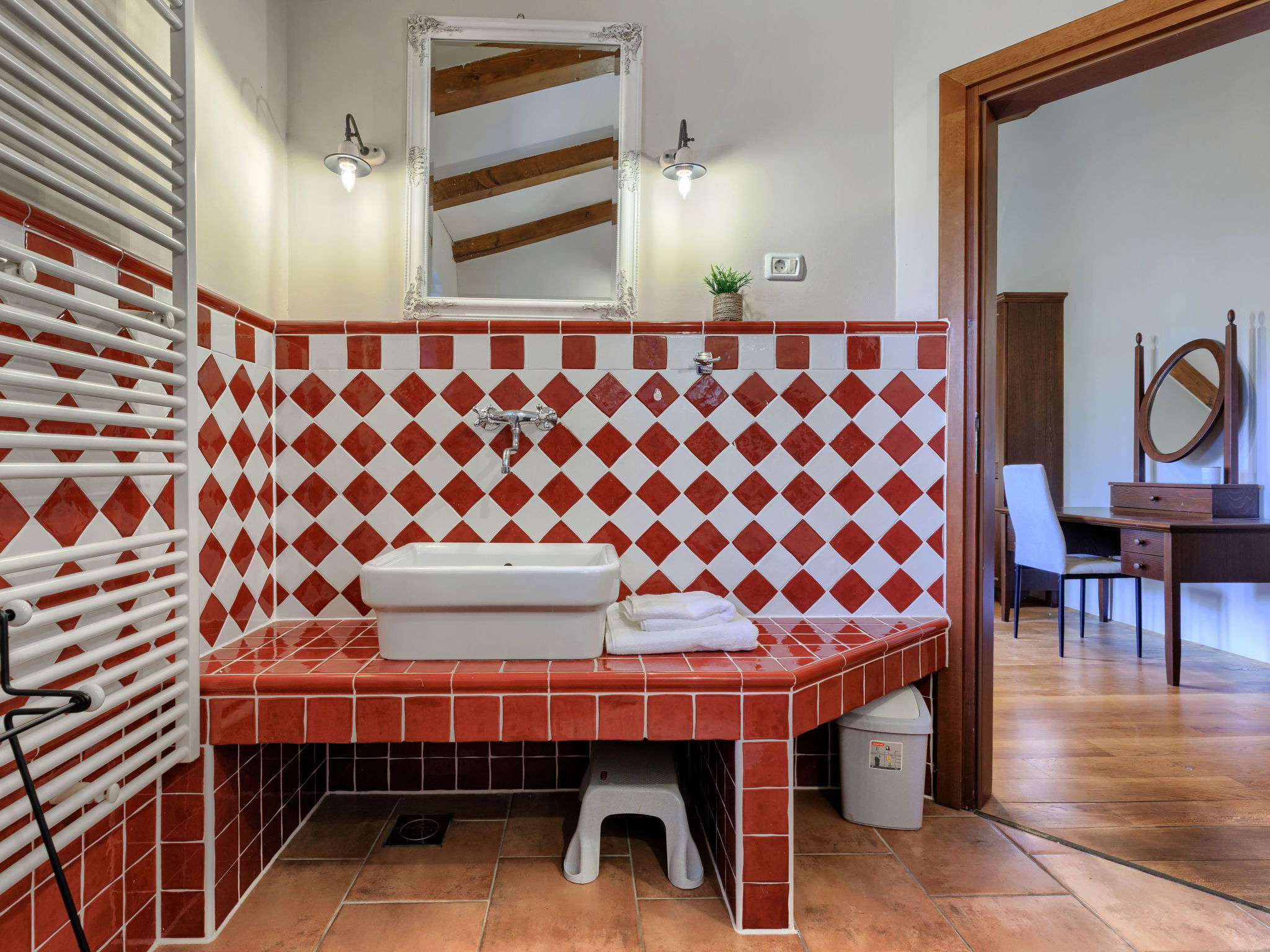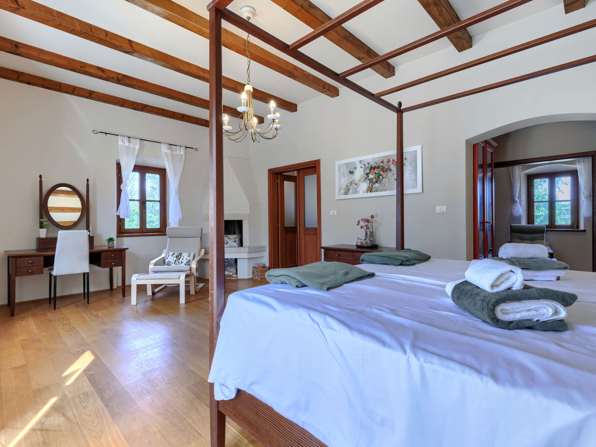 6-room villa 200 m2 on 2 levels. Spacious, stylish and cosy furnishings: living/dining room with open-hearth fireplace (only for decoration), TV and air conditioning. Exit to the terrace. 1 room with 1 french bed (160 cm, length 200 cm), shower/WC and air conditioning. Open kitchen (oven, dishwasher, 5 gas rings, toaster, kettle, microwave, freezer, electric coffee machine). Shower/WC. Upper floor: 1 room with 1 french bed (180 cm, length 200 cm), bath/shower/WC and air conditioning. Exit to the terrace. 2 rooms, each room with 2 beds (90 cm, length 200 cm), shower/WC and air conditioning. 1 room with 2 beds (90 cm, length 200 cm), bath/WC, with corner bath and air conditioning. Terrace 30 m2. Terrace furniture, deck chairs. Beautiful view of the countryside. Facilities: iron, hair dryer. Internet (WiFi, free). Maximum 2 pets/ dogs allowed.