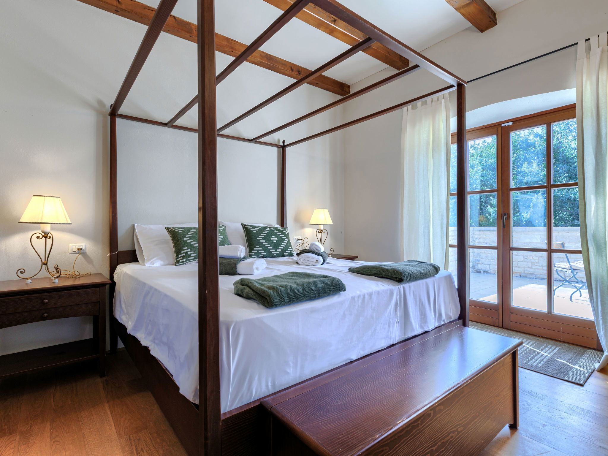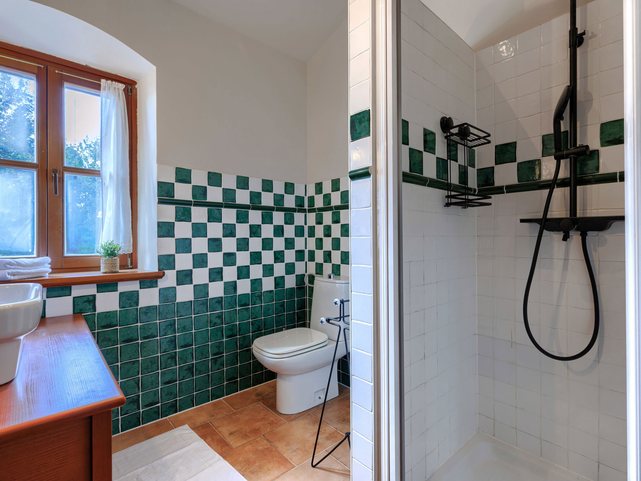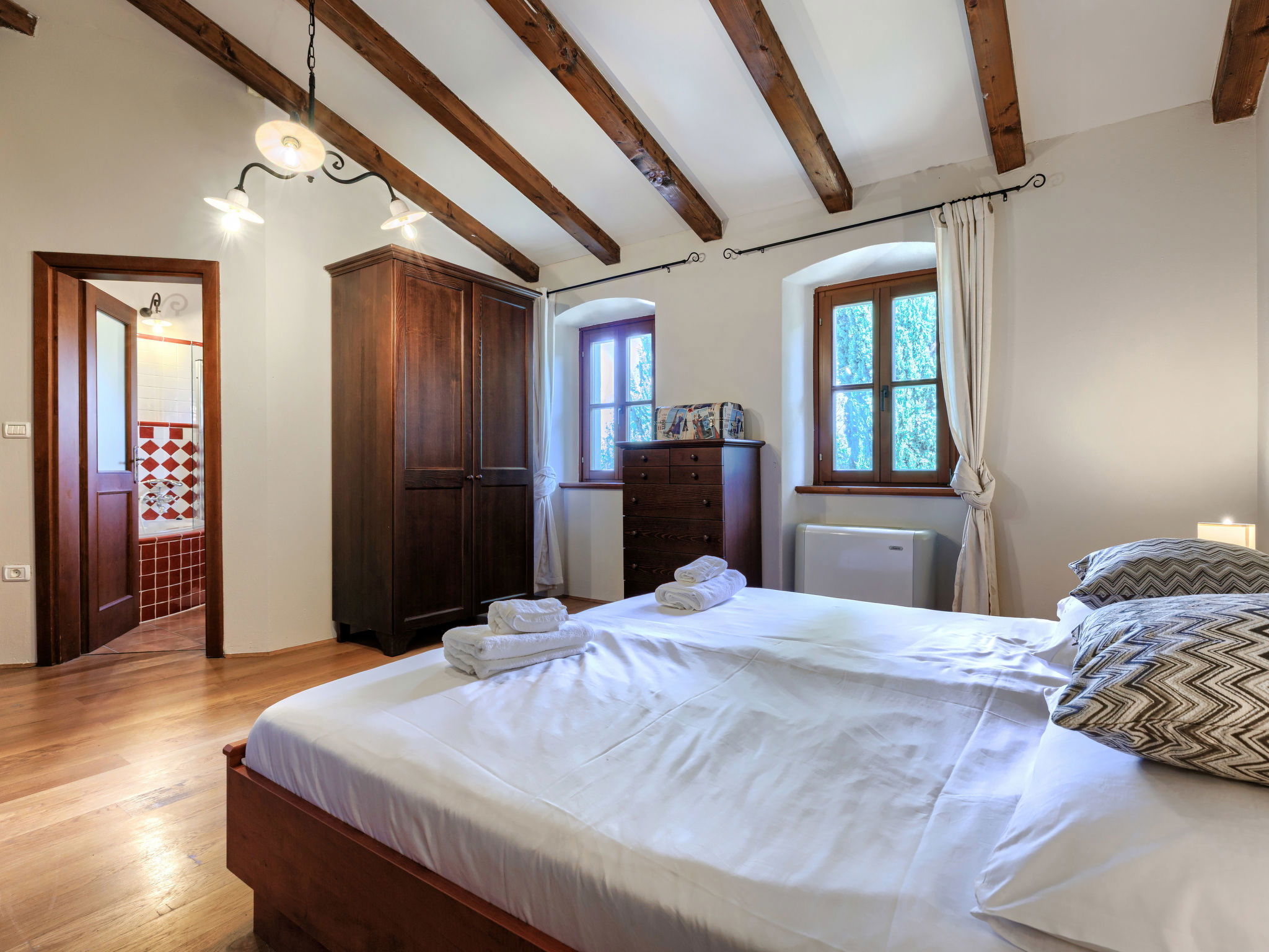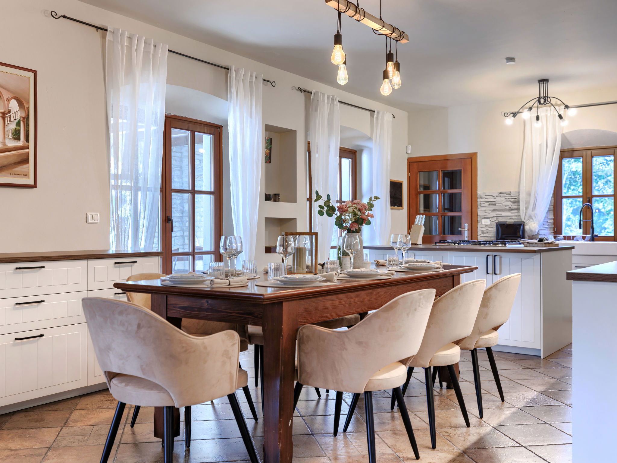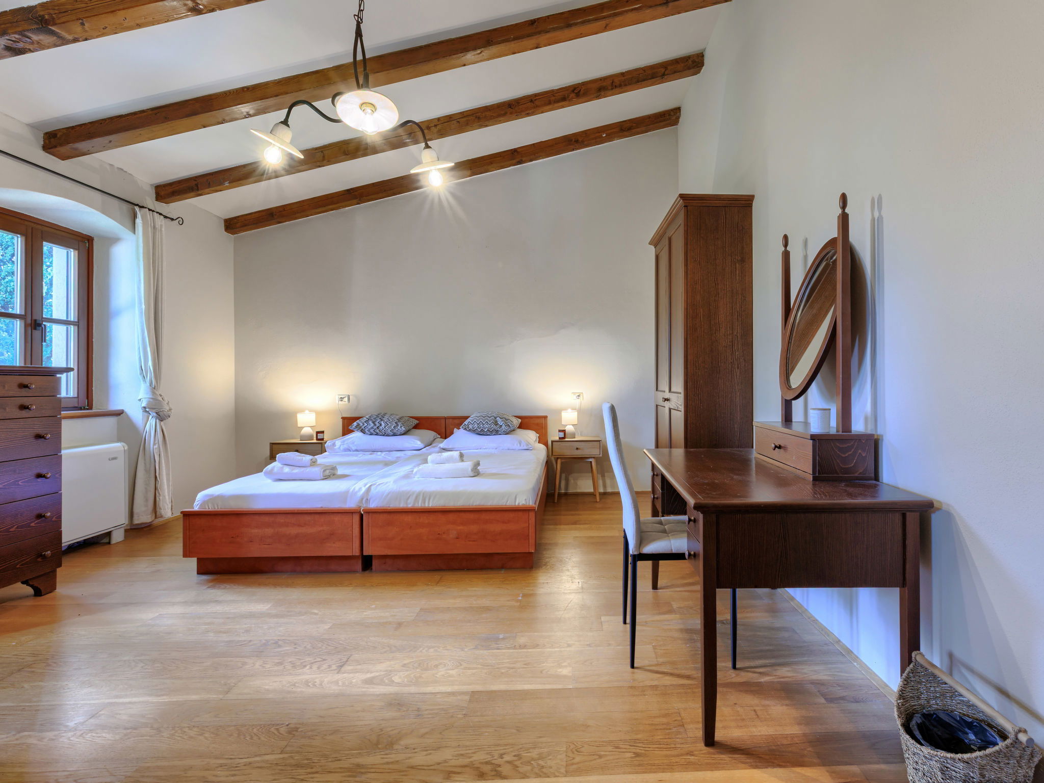6-room villa 200 m2 on 2 levels. Spacious, stylish and cosy furnishings: living/dining room with open-hearth fireplace (only for decoration), TV and air conditioning. Exit to the terrace. 1 room with 1 french bed (160 cm, length 200 cm), shower/WC and air conditioning. Open kitchen (oven, dishwasher, 5 gas rings, toaster, kettle, microwave, freezer, electric coffee machine). Shower/WC. Upper floor: 1 room with 1 french bed (180 cm, length 200 cm), bath/shower/WC and air conditioning. Exit to the terrace. 2 rooms, each room with 2 beds (90 cm, length 200 cm), shower/WC and air conditioning. 1 room with 2 beds (90 cm, length 200 cm), bath/WC, with corner bath and air conditioning. Terrace 30 m2. Terrace furniture, deck chairs. Beautiful view of the countryside. Facilities: iron, hair dryer. Internet (WiFi, free). Maximum 2 pets/ dogs allowed.