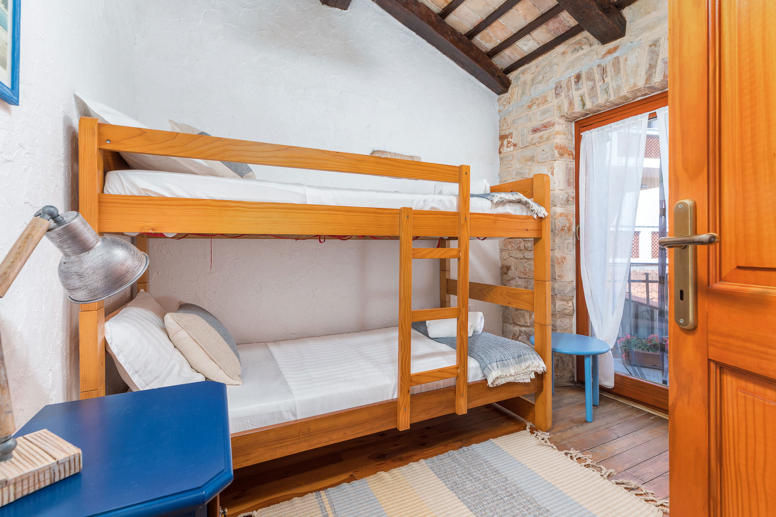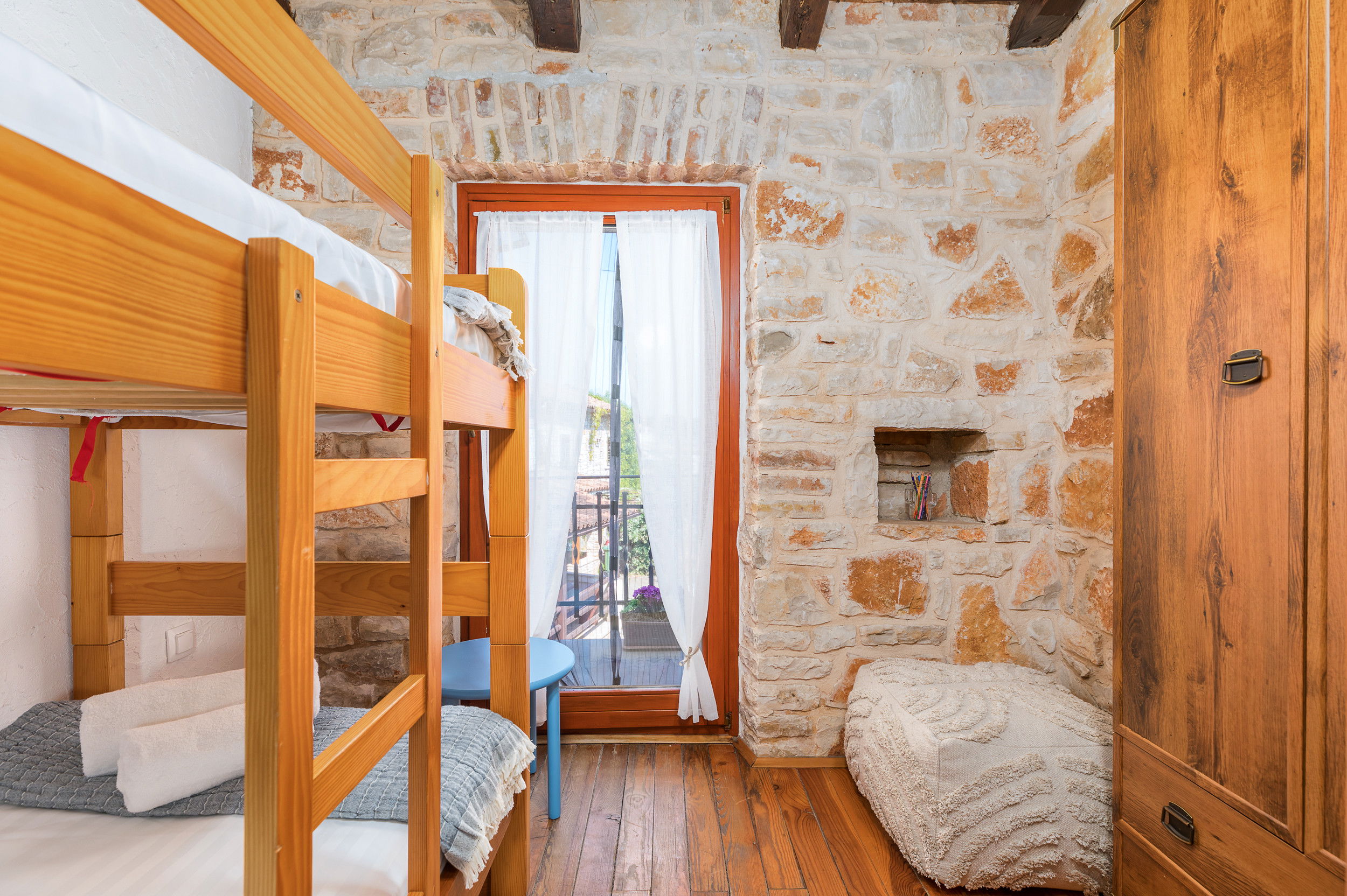 The house comfortably accommodates up to 8 guests. It features three spacious double bedrooms and a cosy children's room with a balcony and a bunk bed.