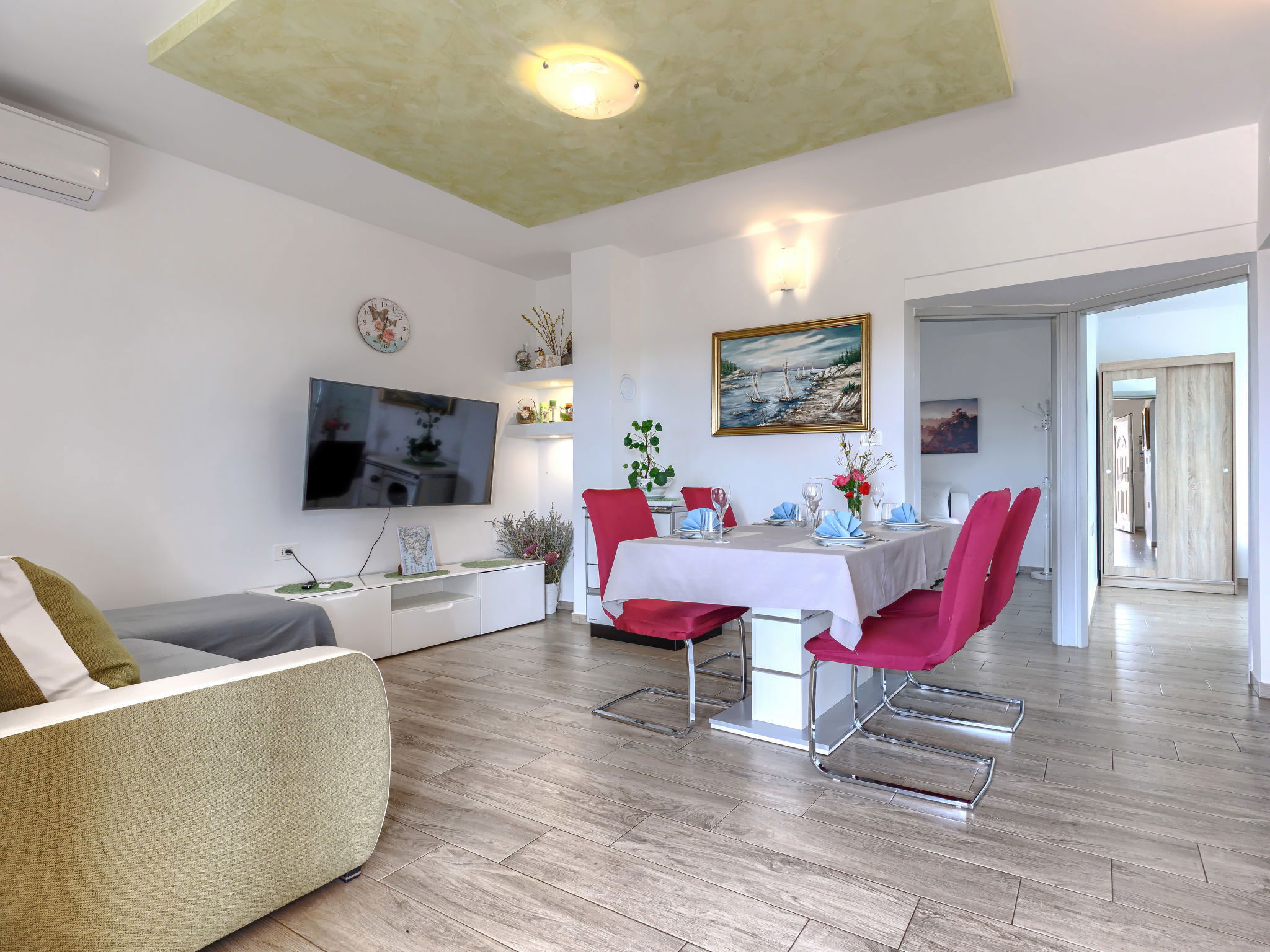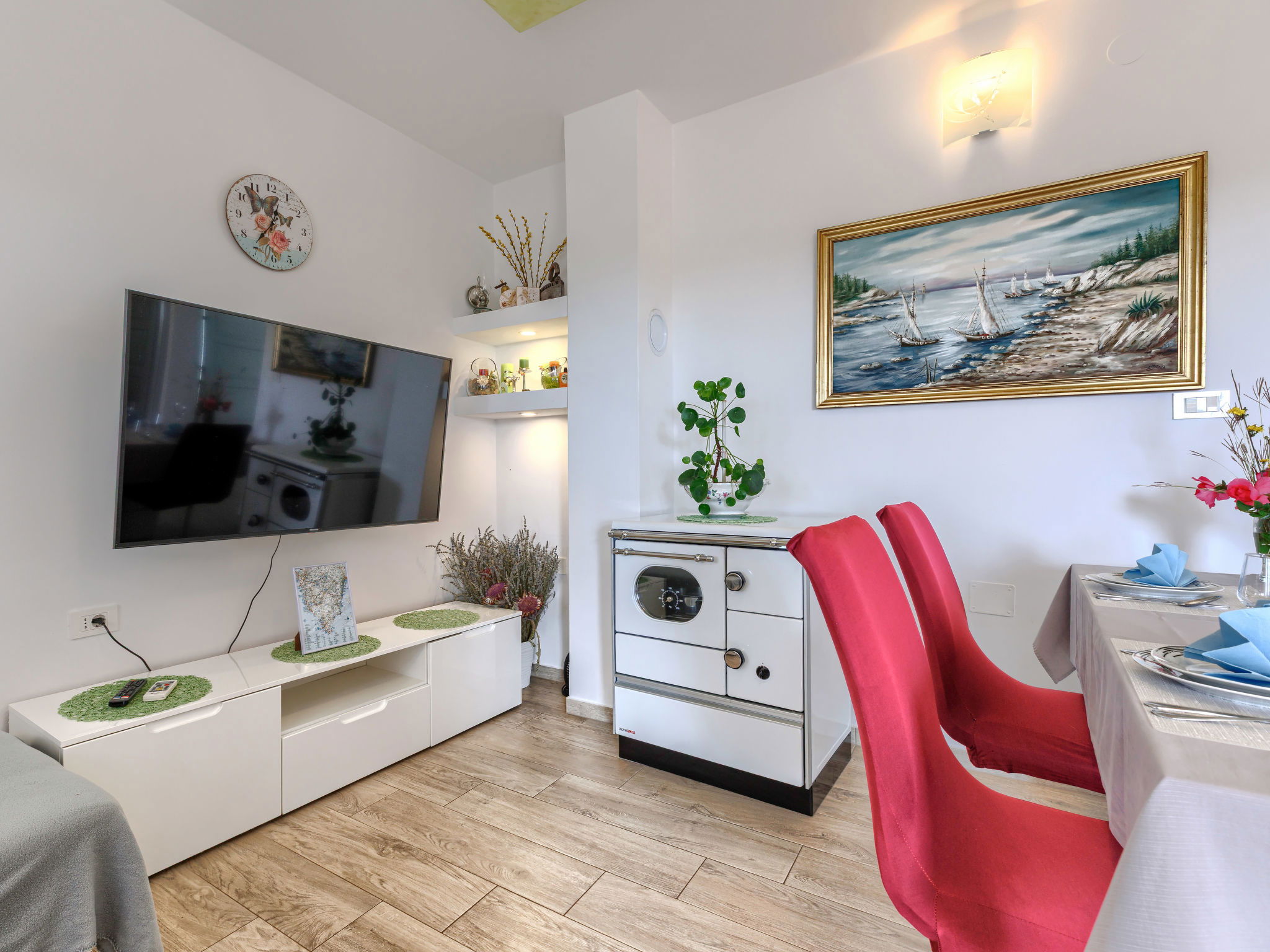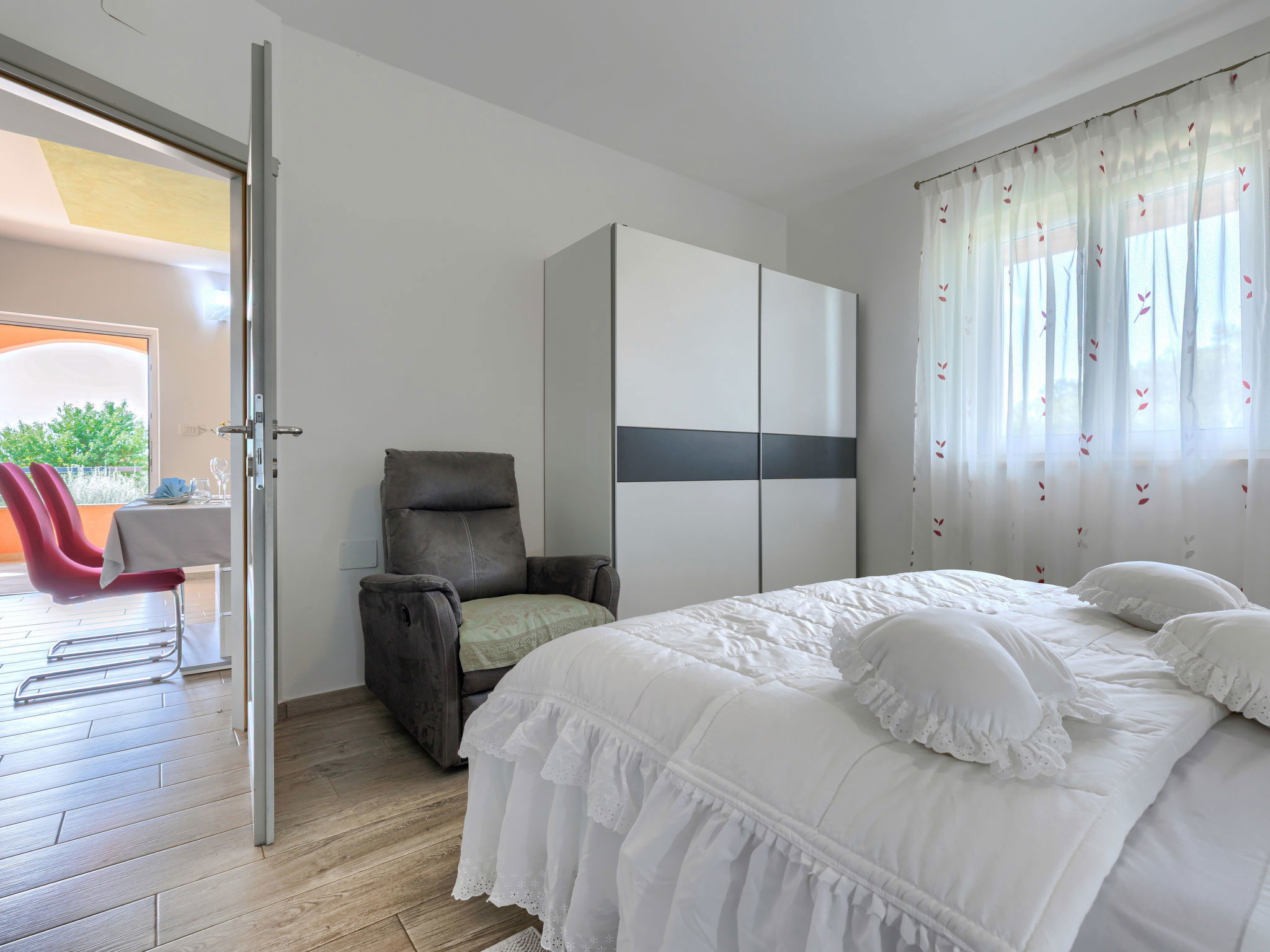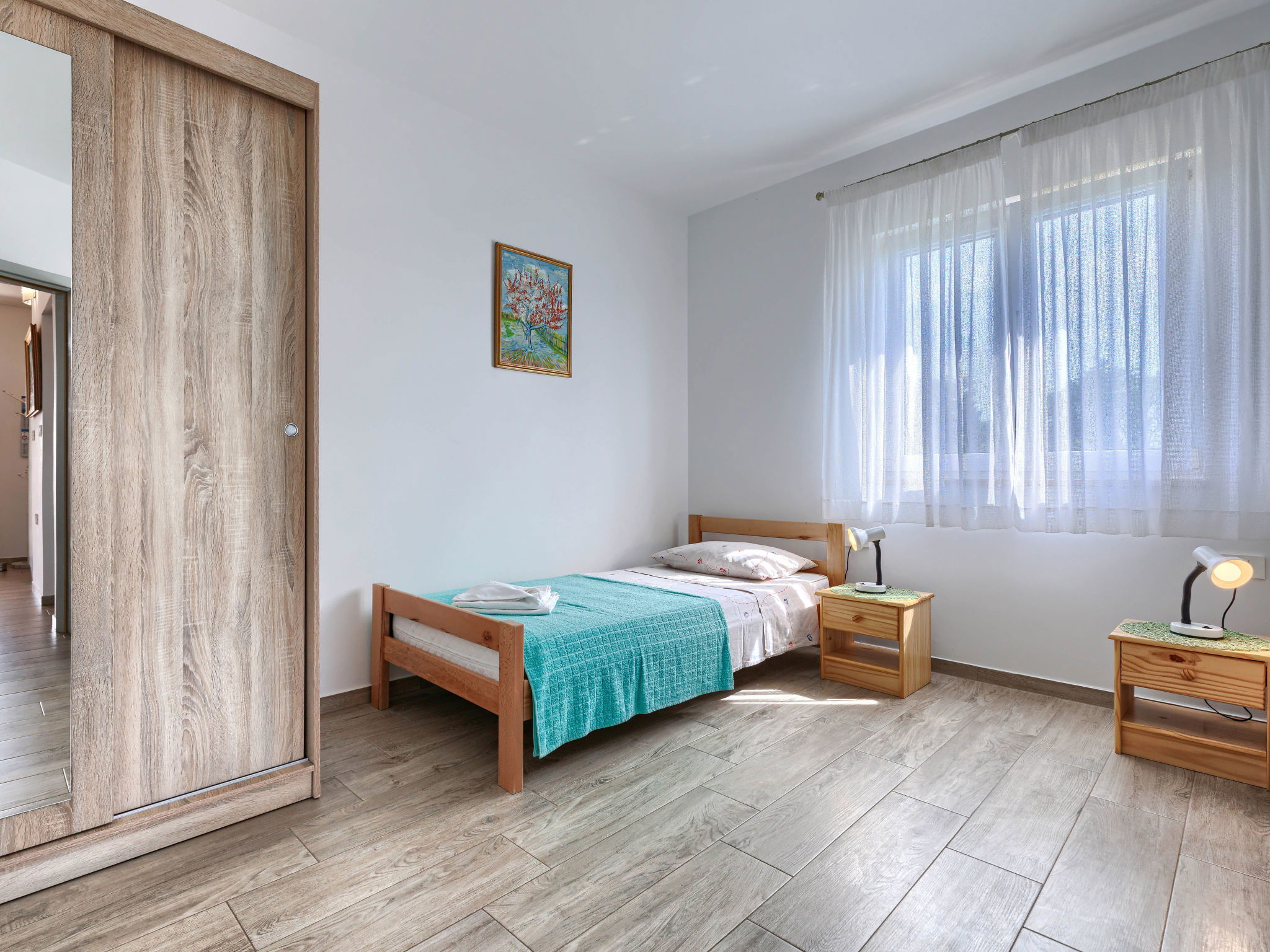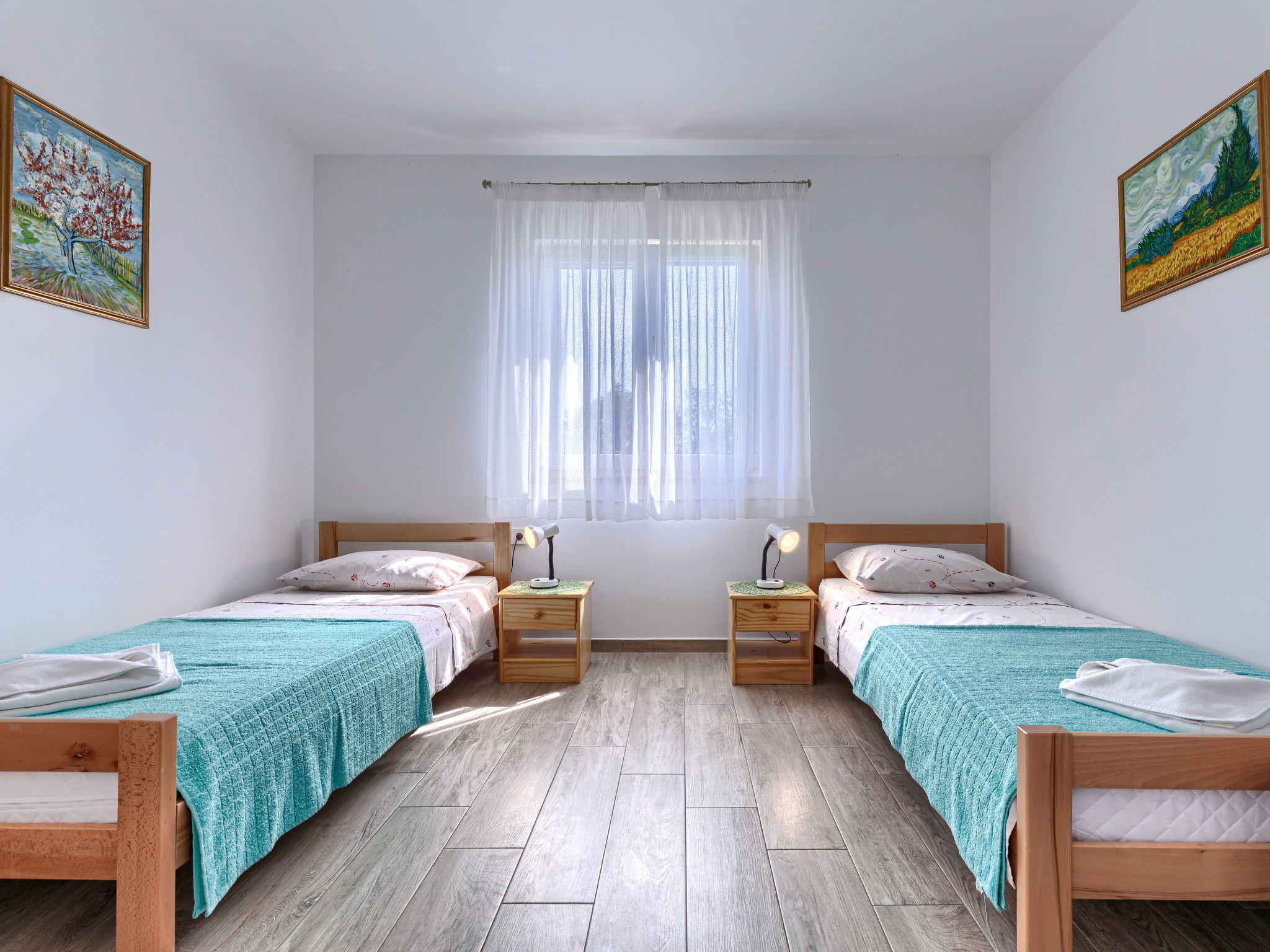 3-room house 65 m2. Cosy furnishings: living/dining room with 1 sofabed and satellite TV (flat screen), air conditioning. Exit to the terrace. 1 room with 2 beds (90 cm, length 200 cm). 1 room with 1 french bed (160 cm, length 200 cm). Open kitchen (oven, dishwasher, 4 gas rings, toaster, kettle, freezer, electric coffee machine). Shower/bidet/WC. Forced-air heating. Terrace furniture, deck chairs (2). Facilities: Internet (WiFi, free). Please note: 2 pets/ dogs allowed. Fire extinguisher.