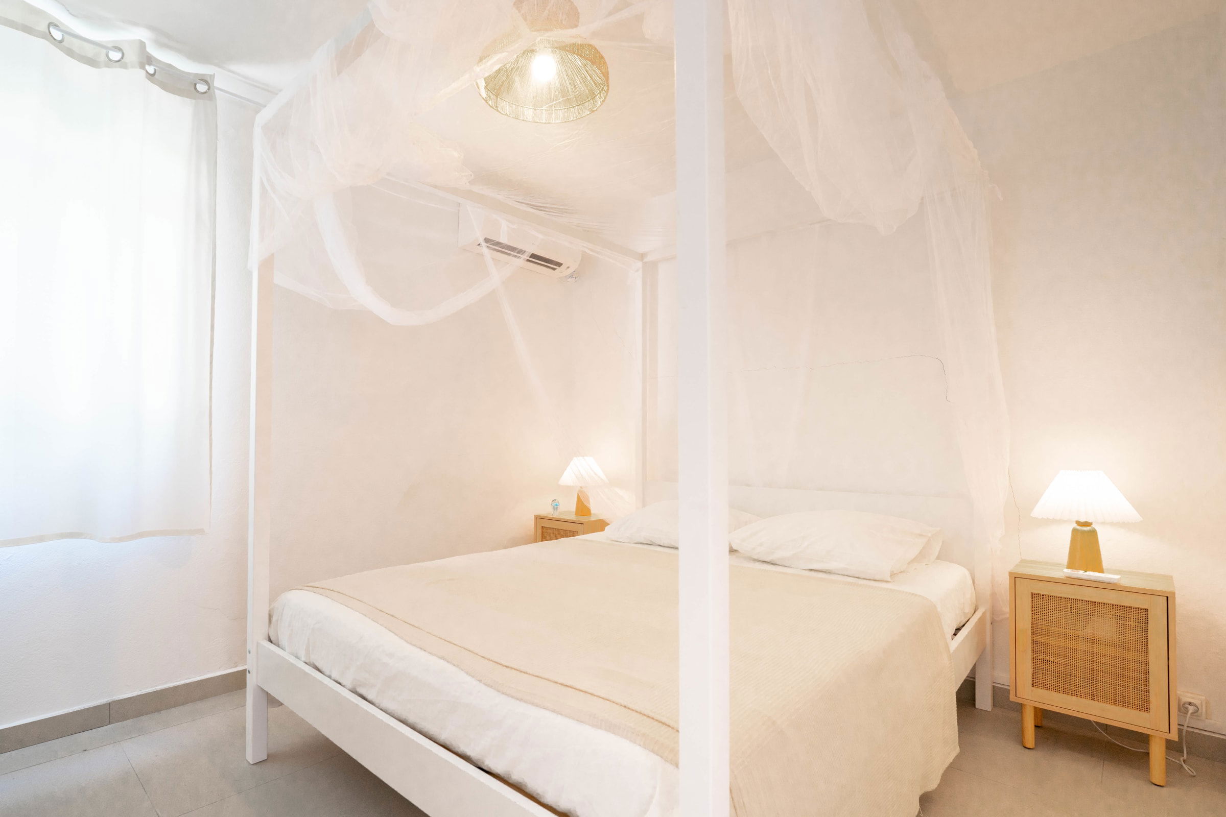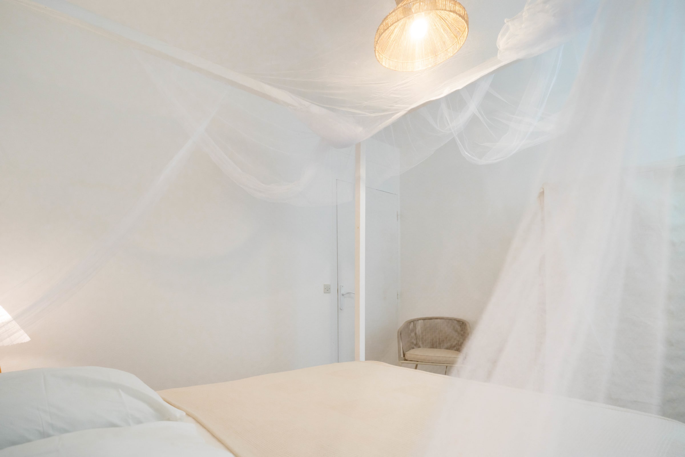 Measuring 125 m² on one level, the villa has four air-conditioned bedrooms, all equipped with mosquito nets. Three have comfortable 160 cm beds, while the fourth has bunk beds perfect for younger guests. The two contemporary bathrooms and two toilets guarantee every comfort. The fibre-optic internet connection is of exceptional quality, guaranteeing fast, stable browsing.