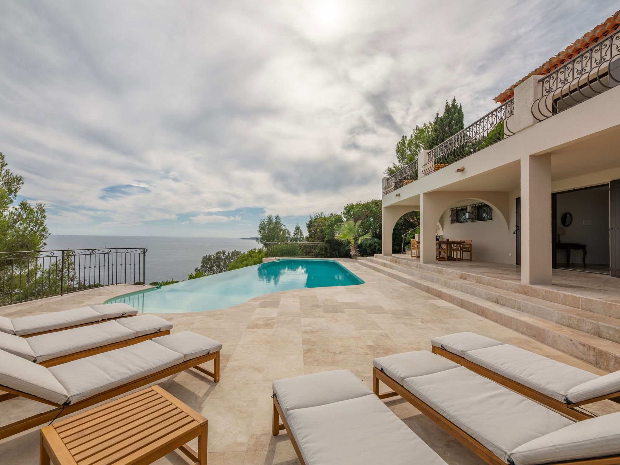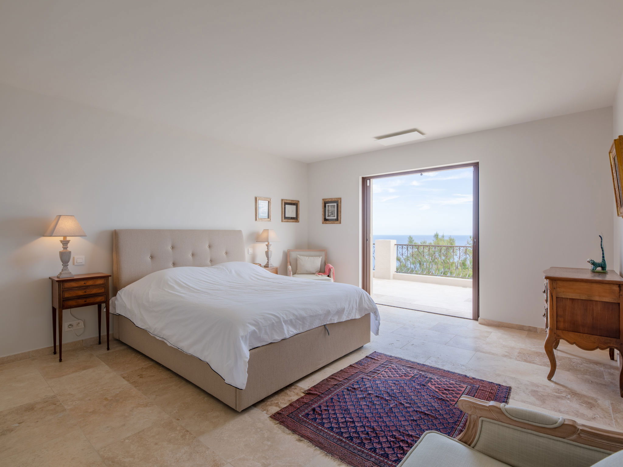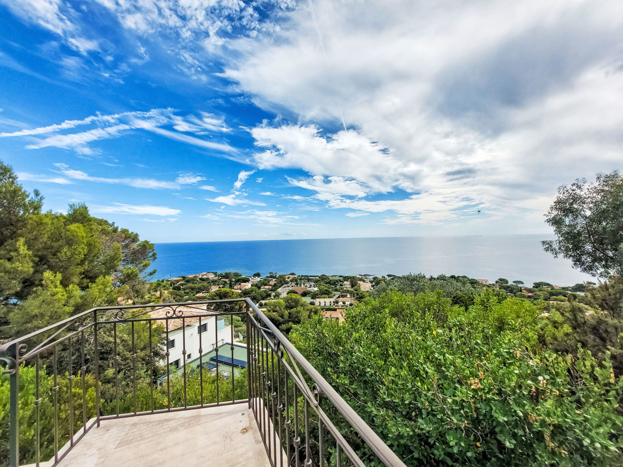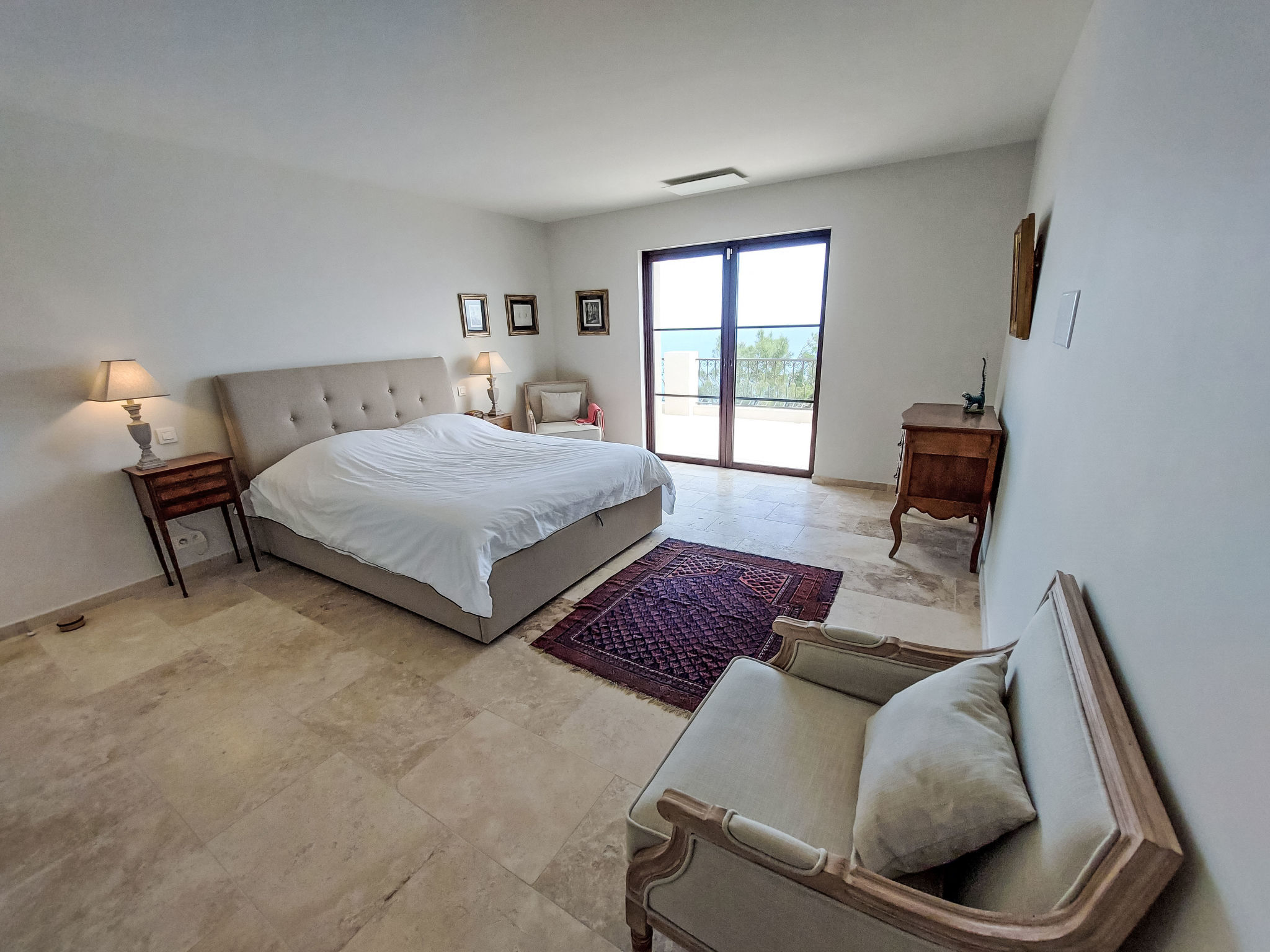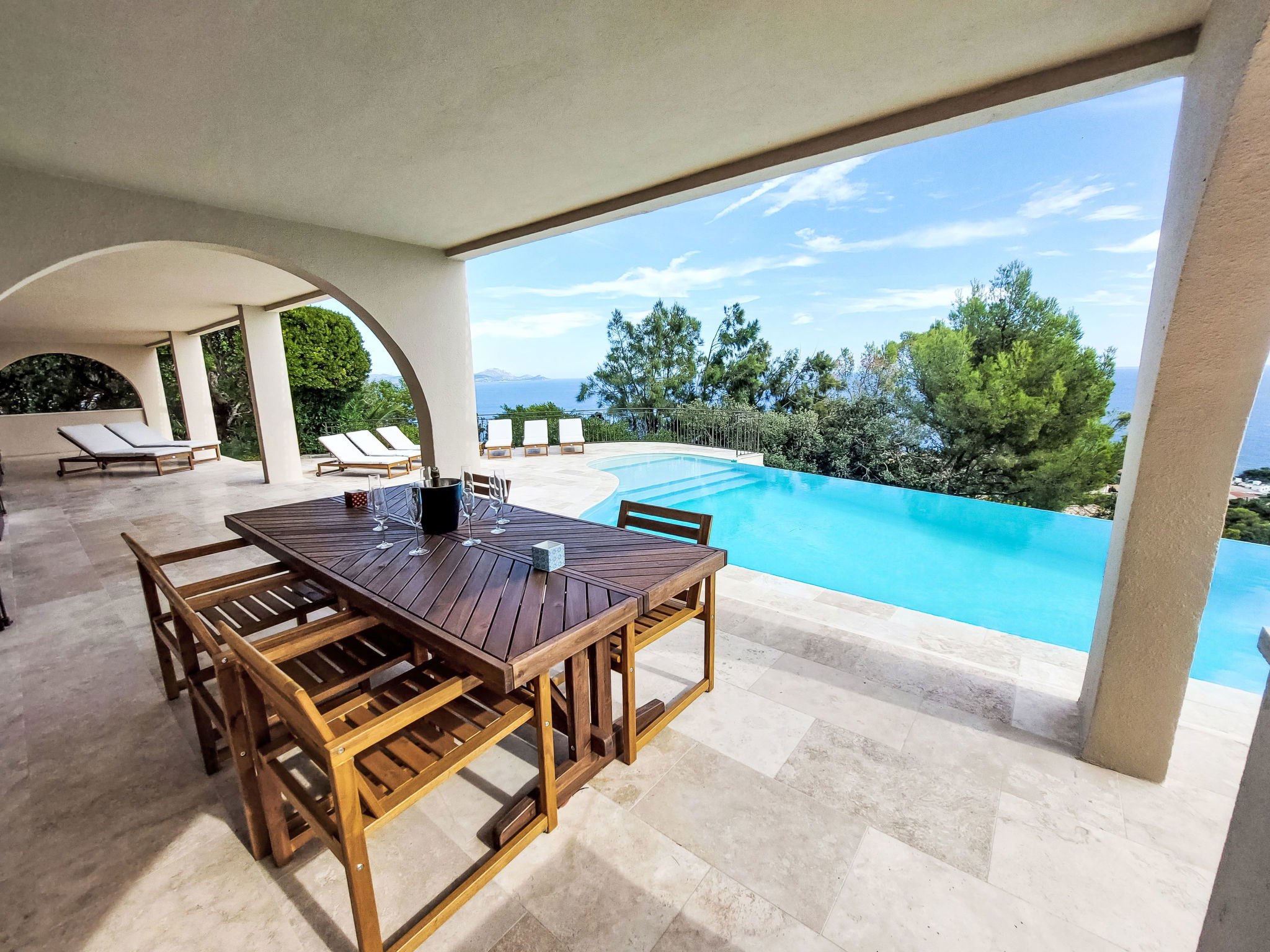 5-room villa 220 m2 on 2 levels. Modern furnishings: large living/dining room with panoramic window with TV (flat screen). Exit to the terrace. 1 large room with 1 french bed (160 cm, length 200 cm), bath/shower/WC and double hand-basin. Exit to the terrace. Large, open kitchen (oven, dishwasher, 4 induction hot plates, toaster, kettle, microwave, freezer, electric coffee machine, Capsules for coffee machine (Nespresso) extra) with bar. Sep. WC. Electric heating. On the lower ground floor: 1 large room with 1 french bed (160 cm, length 200 cm). Exit to the terrace, to the swimming pool. 1 large room with 1 french bed (1 x 160 cm, length 200 cm), hand-basin. Exit to the terrace, to the swimming pool. 1 large room with 1 french bed (1 x 160 cm, length 200 cm), bath/shower. Exit to the terrace, to the swimming pool. Shower/WC. Electric heating. Large terrace 300 m2, south facing position. Terrace furniture, balcony furniture, deck chairs (8). Panoramic view of the sea. Facilities: washing machine, iron, children's high chair, baby cot (extra), hair dryer. Internet (WiFi, free). Parking (1 car). Please note: non-smoking house. Smoke alarm. Offer by a private individual according to Art. 155, IV of CGI. 83107002726FM