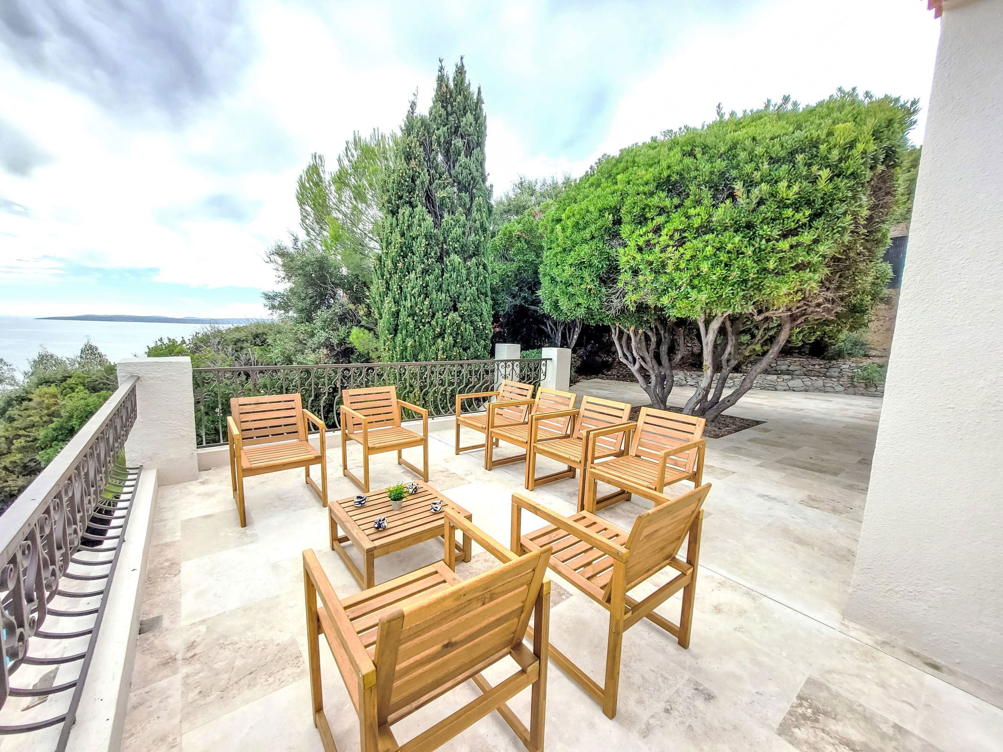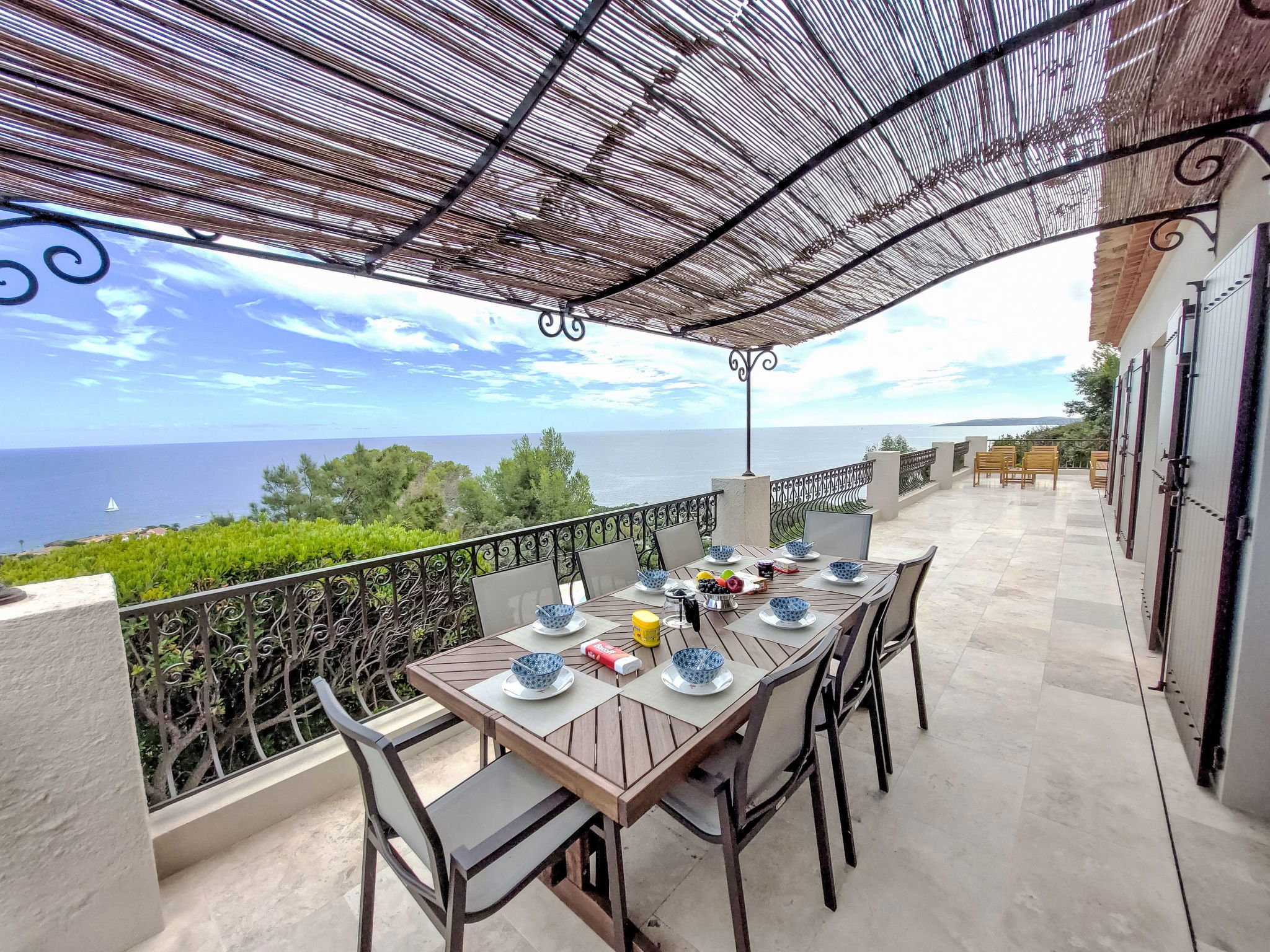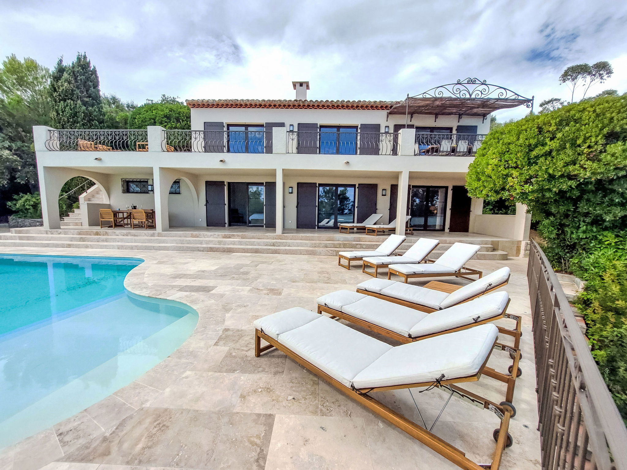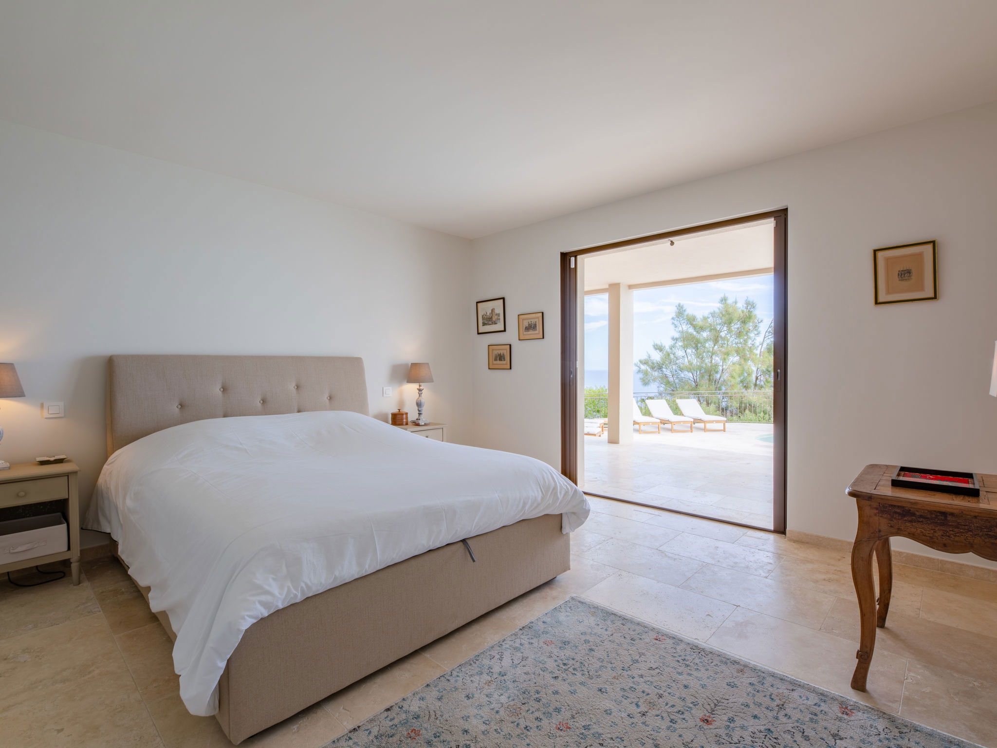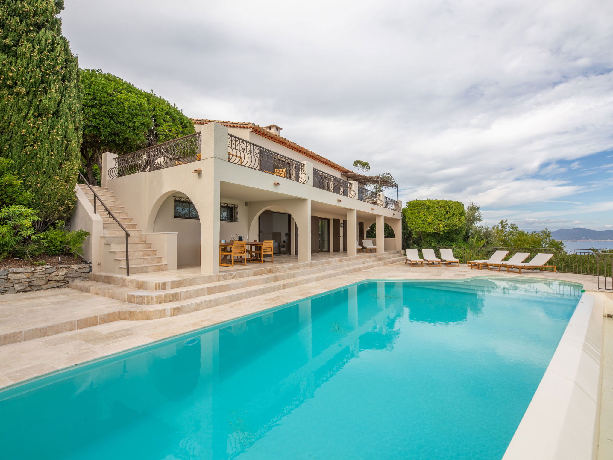 5-room villa 220 m2 on 2 levels. Modern furnishings: large living/dining room with panoramic window with TV (flat screen). Exit to the terrace. 1 large room with 1 french bed (160 cm, length 200 cm), bath/shower/WC and double hand-basin. Exit to the terrace. Large, open kitchen (oven, dishwasher, 4 induction hot plates, toaster, kettle, microwave, freezer, electric coffee machine, Capsules for coffee machine (Nespresso) extra) with bar. Sep. WC. Electric heating. On the lower ground floor: 1 large room with 1 french bed (160 cm, length 200 cm). Exit to the terrace, to the swimming pool. 1 large room with 1 french bed (1 x 160 cm, length 200 cm), hand-basin. Exit to the terrace, to the swimming pool. 1 large room with 1 french bed (1 x 160 cm, length 200 cm), bath/shower. Exit to the terrace, to the swimming pool. Shower/WC. Electric heating. Large terrace 300 m2, south facing position. Terrace furniture, balcony furniture, deck chairs (8). Panoramic view of the sea. Facilities: washing machine, iron, children's high chair, baby cot (extra), hair dryer. Internet (WiFi, free). Parking (1 car). Please note: non-smoking house. Smoke alarm. Offer by a private individual according to Art. 155, IV of CGI. 83107002726FM