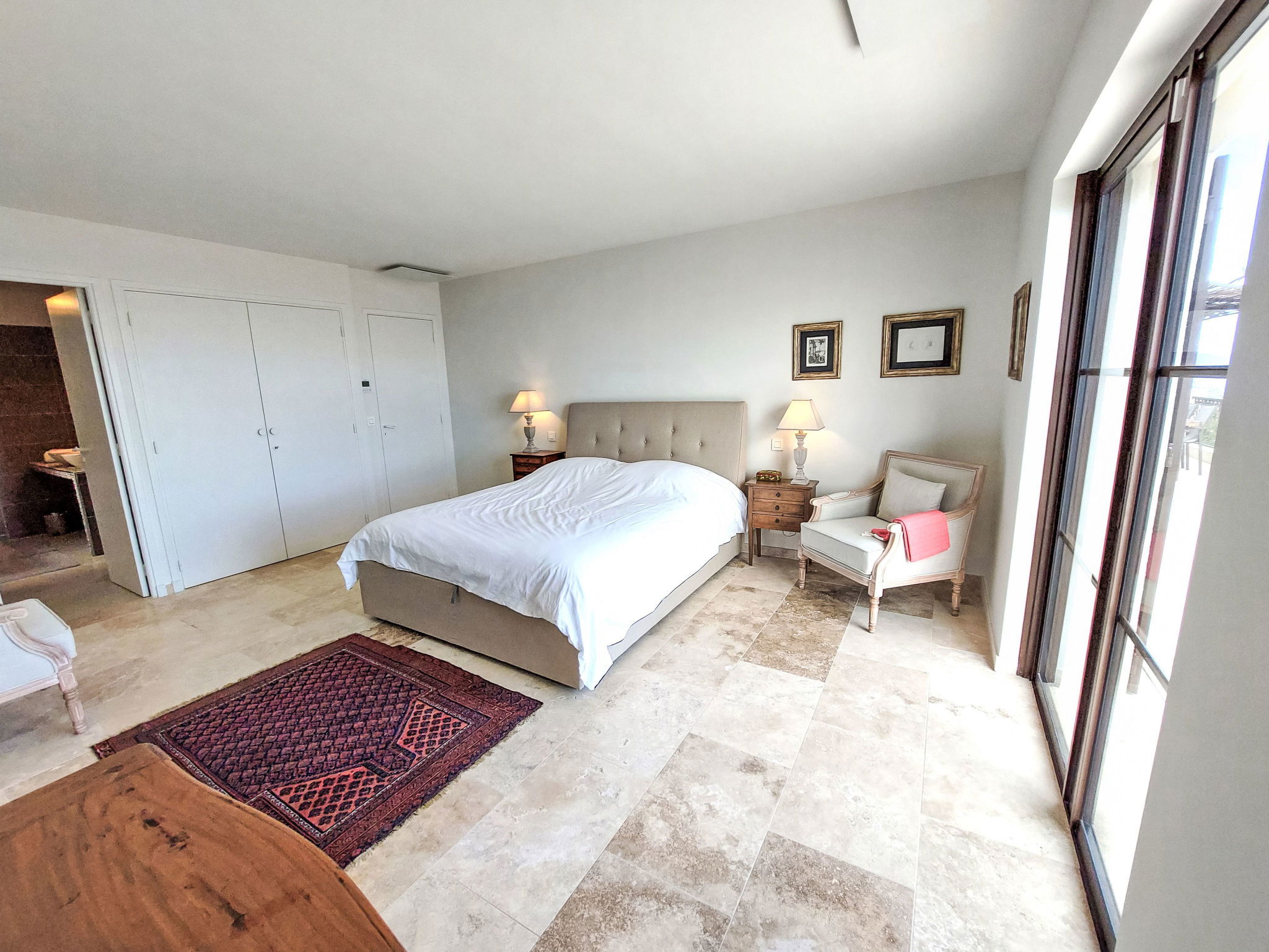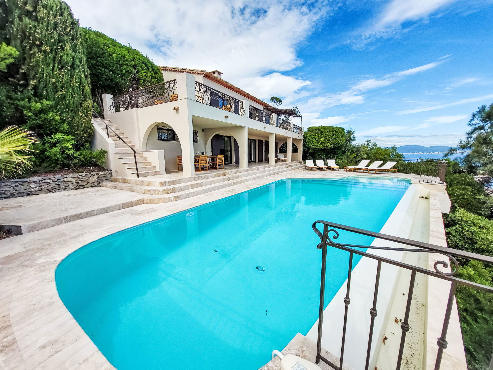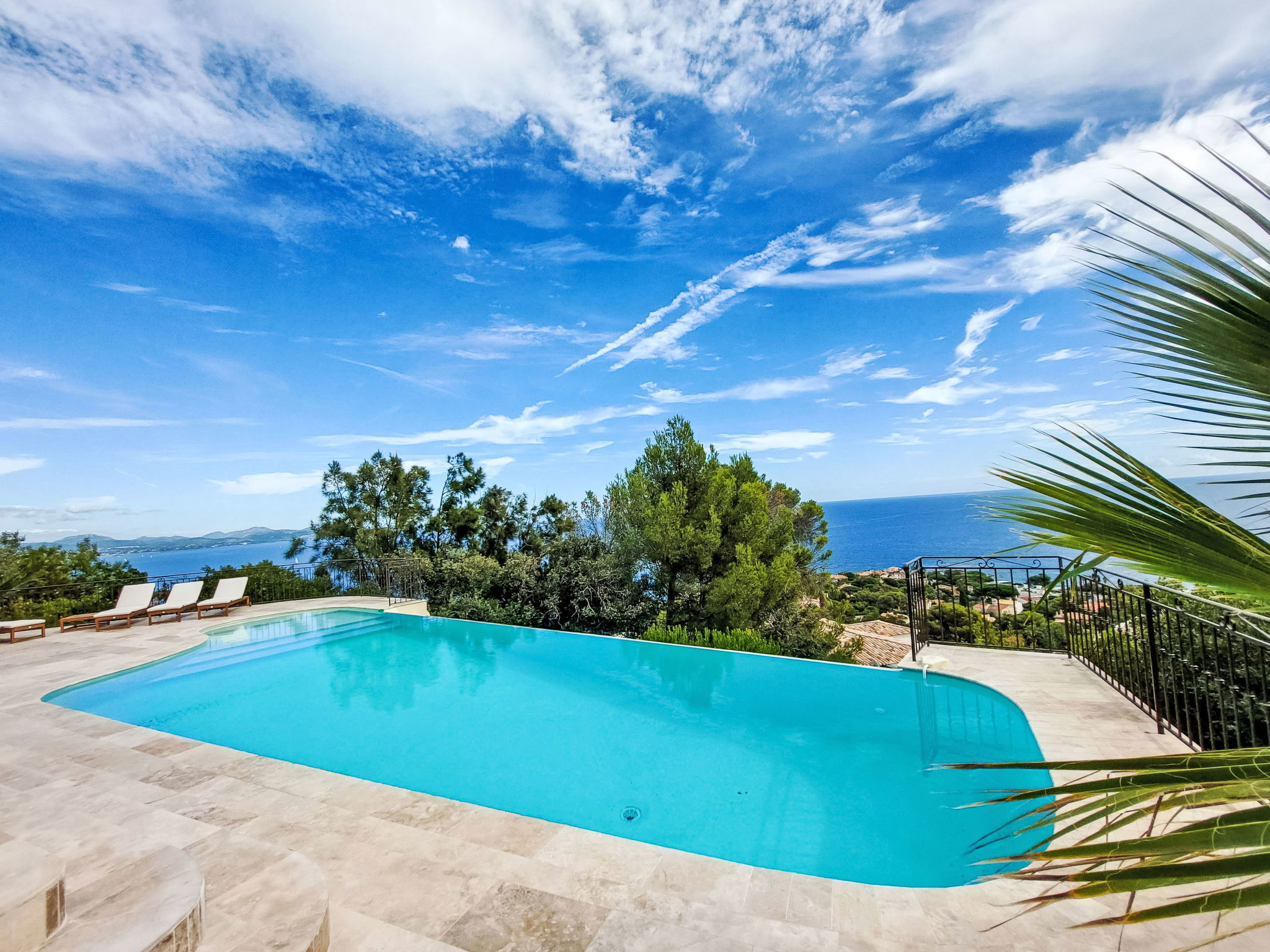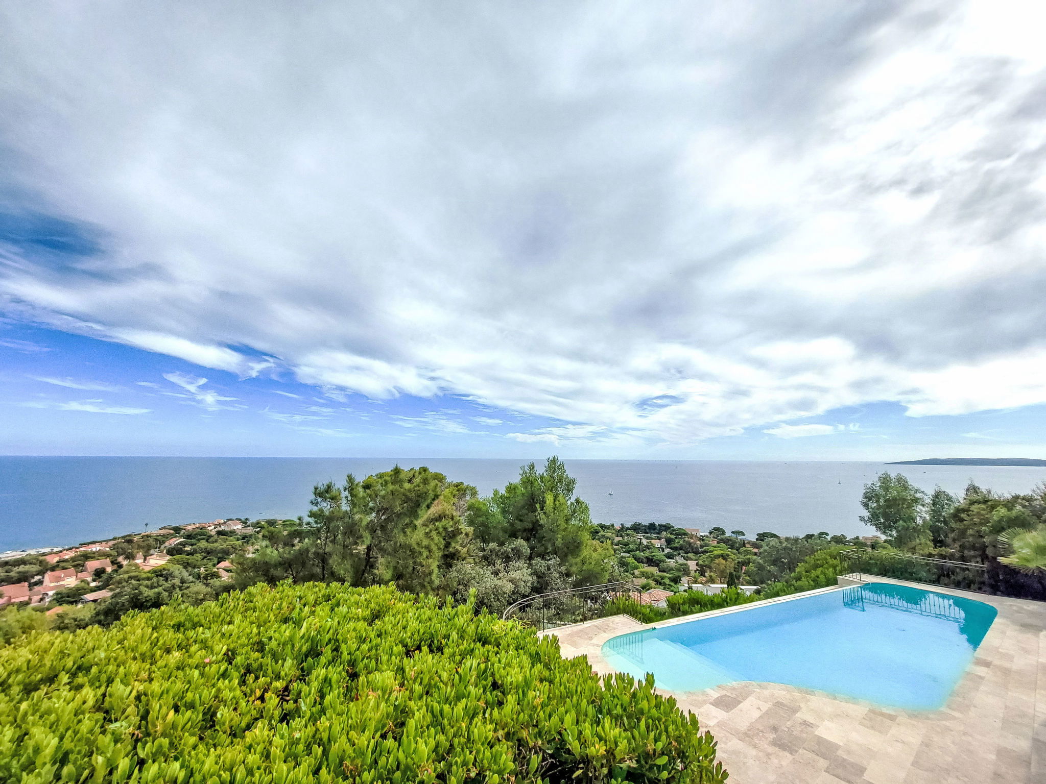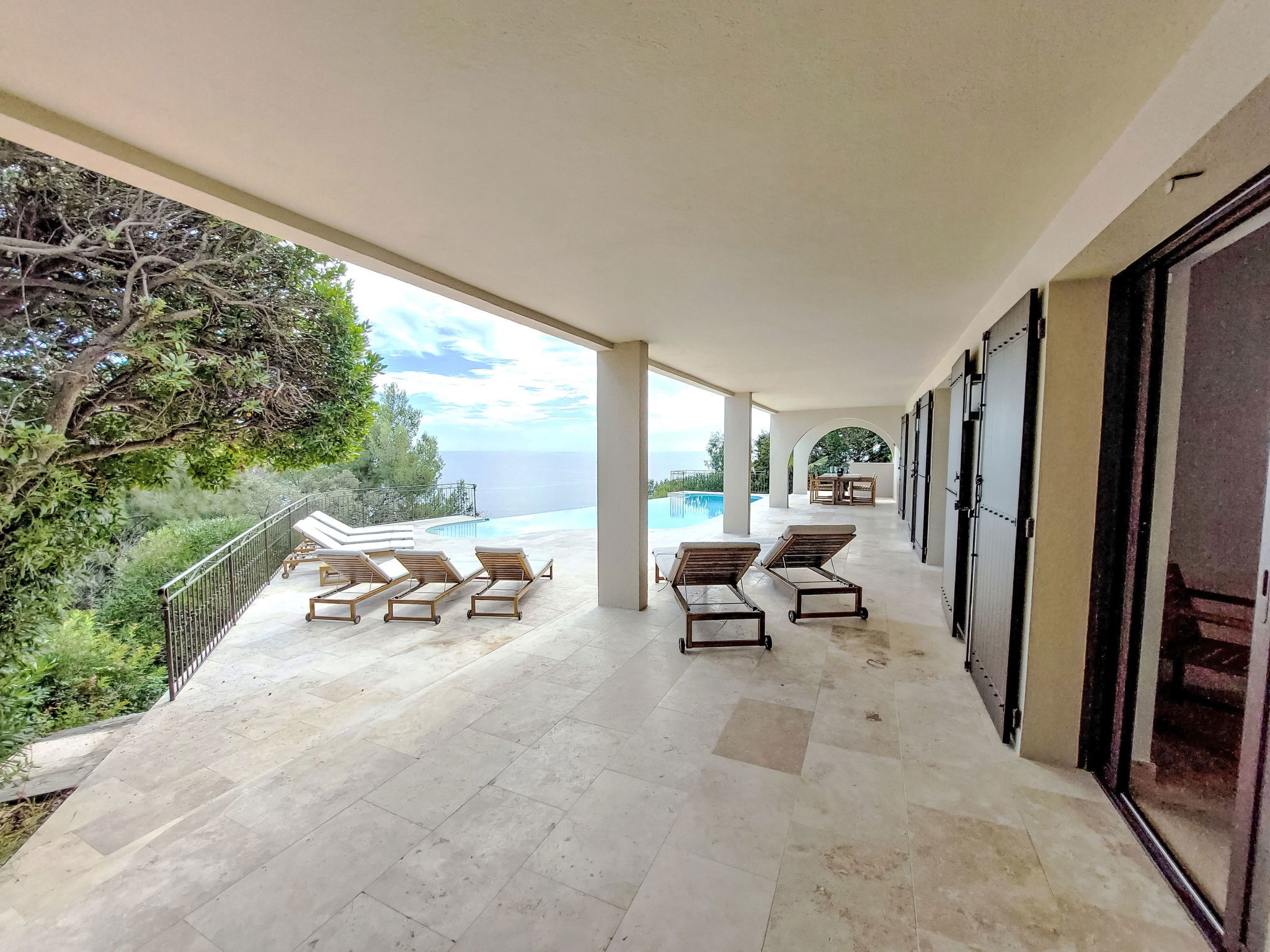 5-room villa 220 m2 on 2 levels. Modern furnishings: large living/dining room with panoramic window with TV (flat screen). Exit to the terrace. 1 large room with 1 french bed (160 cm, length 200 cm), bath/shower/WC and double hand-basin. Exit to the terrace. Large, open kitchen (oven, dishwasher, 4 induction hot plates, toaster, kettle, microwave, freezer, electric coffee machine, Capsules for coffee machine (Nespresso) extra) with bar. Sep. WC. Electric heating. On the lower ground floor: 1 large room with 1 french bed (160 cm, length 200 cm). Exit to the terrace, to the swimming pool. 1 large room with 1 french bed (1 x 160 cm, length 200 cm), hand-basin. Exit to the terrace, to the swimming pool. 1 large room with 1 french bed (1 x 160 cm, length 200 cm), bath/shower. Exit to the terrace, to the swimming pool. Shower/WC. Electric heating. Large terrace 300 m2, south facing position. Terrace furniture, balcony furniture, deck chairs (8). Panoramic view of the sea. Facilities: washing machine, iron, children's high chair, baby cot (extra), hair dryer. Internet (WiFi, free). Parking (1 car). Please note: non-smoking house. Smoke alarm. Offer by a private individual according to Art. 155, IV of CGI. 83107002726FM