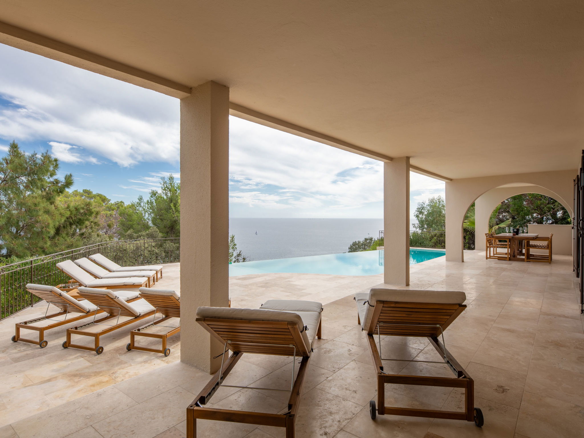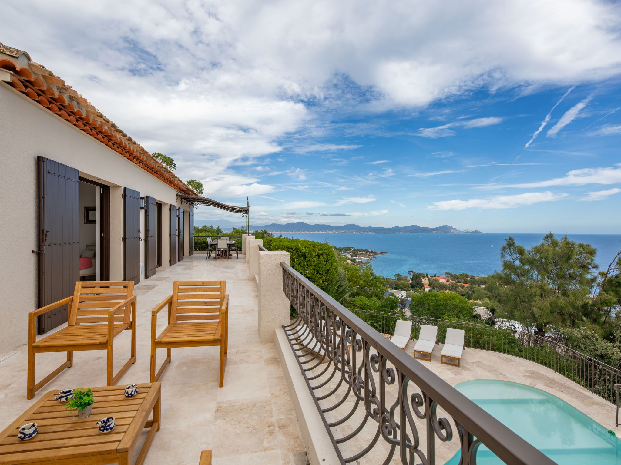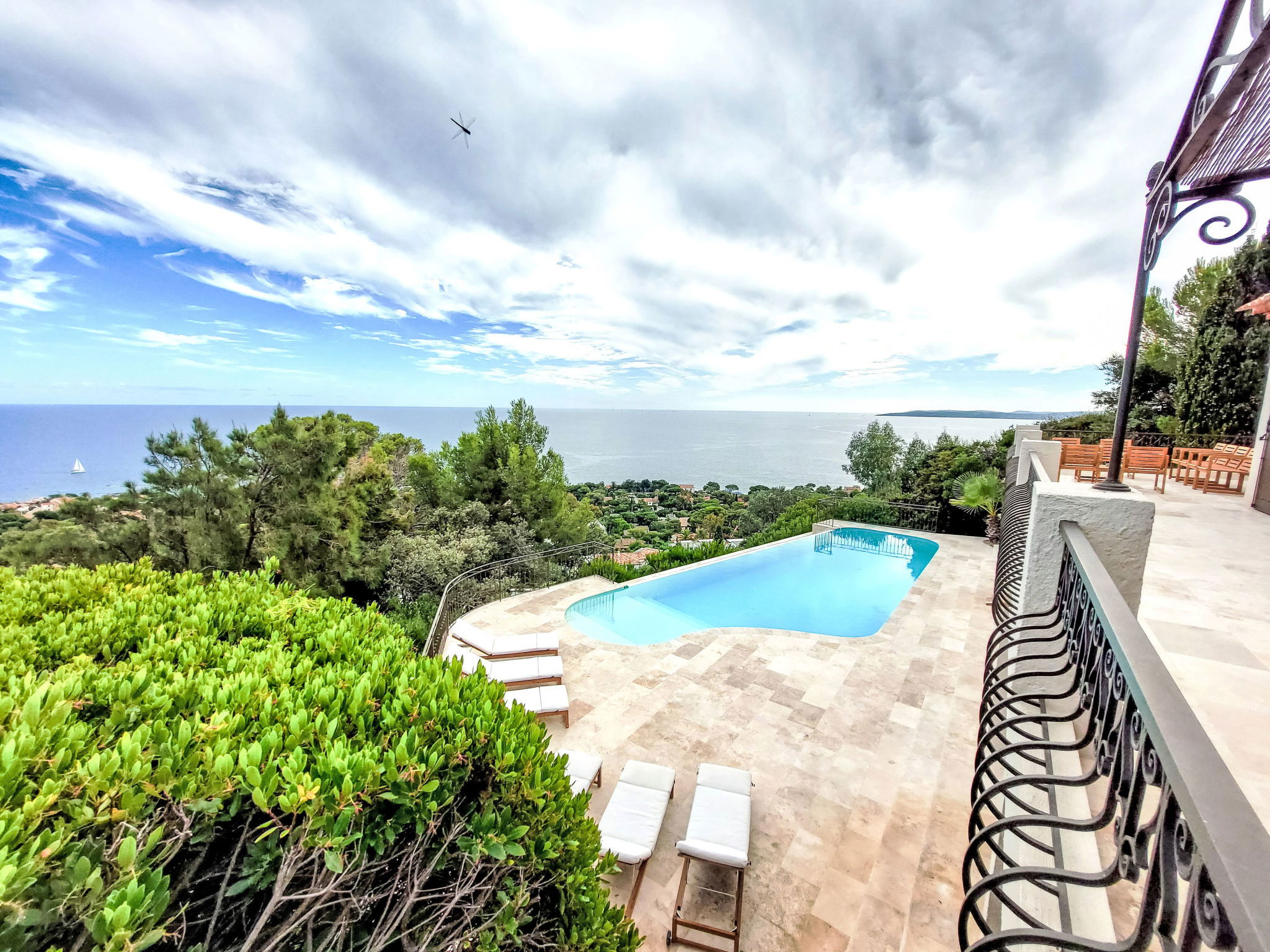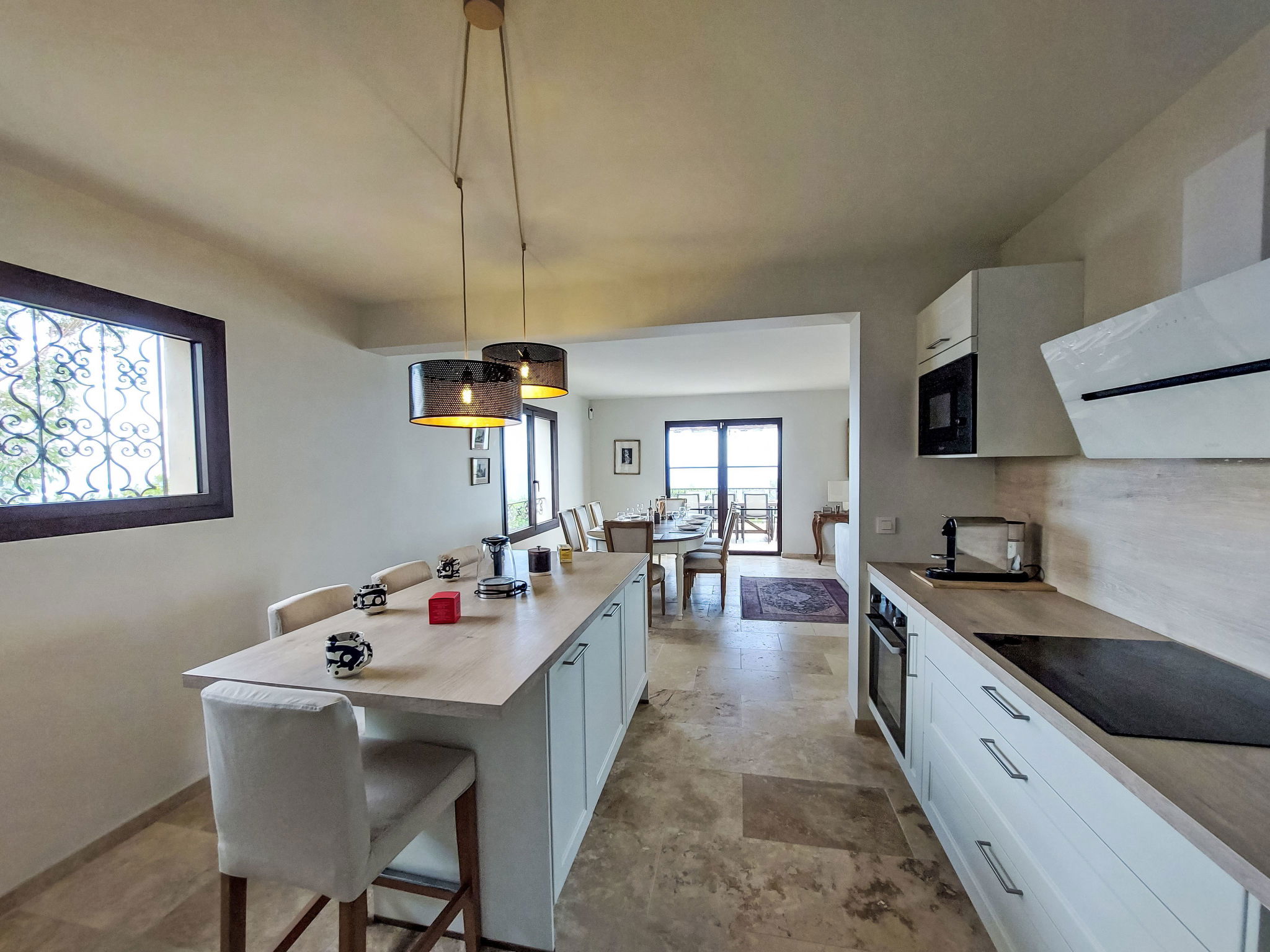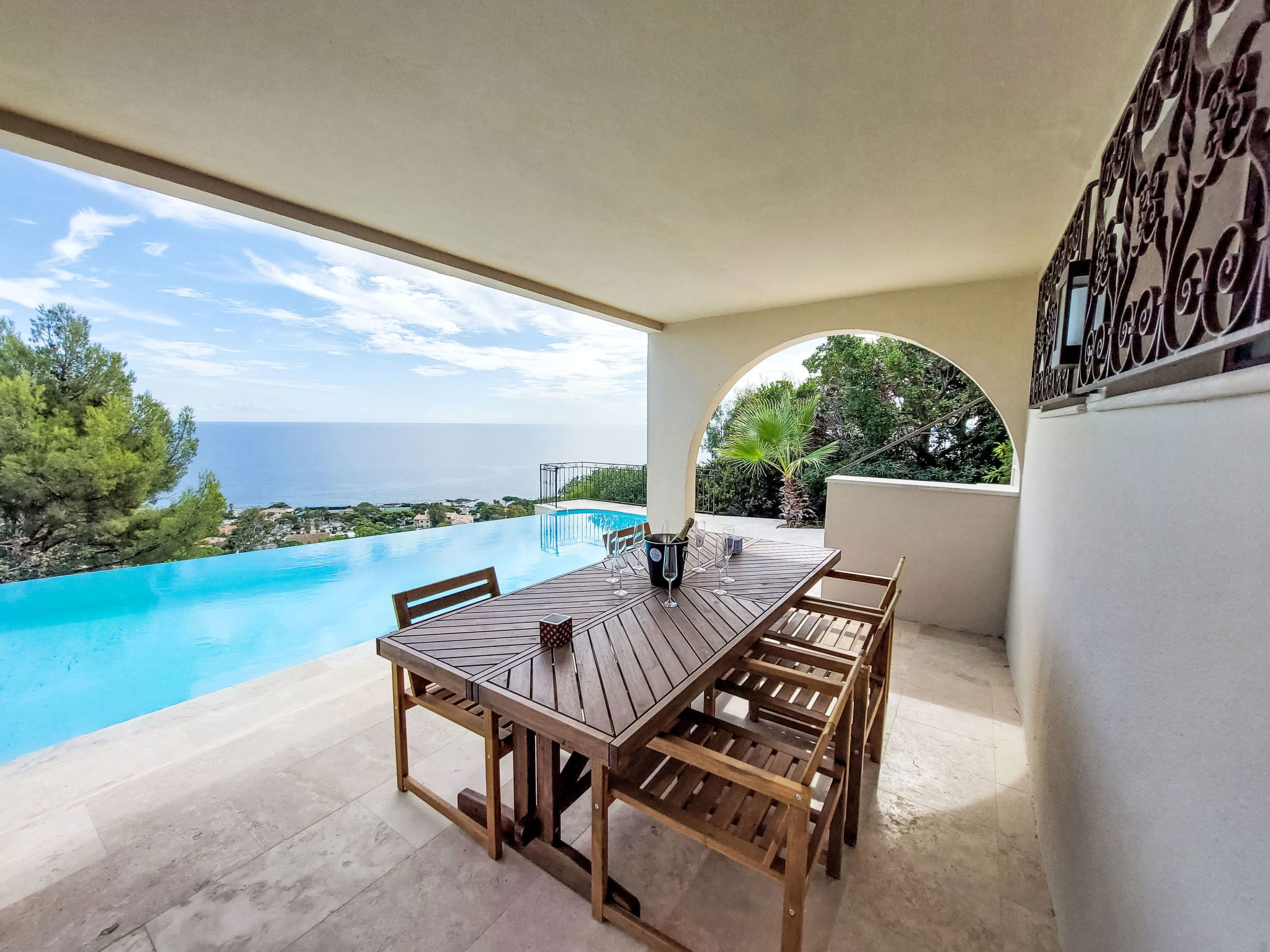 5-room villa 220 m2 on 2 levels. Modern furnishings: large living/dining room with panoramic window with TV (flat screen). Exit to the terrace. 1 large room with 1 french bed (160 cm, length 200 cm), bath/shower/WC and double hand-basin. Exit to the terrace. Large, open kitchen (oven, dishwasher, 4 induction hot plates, toaster, kettle, microwave, freezer, electric coffee machine, Capsules for coffee machine (Nespresso) extra) with bar. Sep. WC. Electric heating. On the lower ground floor: 1 large room with 1 french bed (160 cm, length 200 cm). Exit to the terrace, to the swimming pool. 1 large room with 1 french bed (1 x 160 cm, length 200 cm), hand-basin. Exit to the terrace, to the swimming pool. 1 large room with 1 french bed (1 x 160 cm, length 200 cm), bath/shower. Exit to the terrace, to the swimming pool. Shower/WC. Electric heating. Large terrace 300 m2, south facing position. Terrace furniture, balcony furniture, deck chairs (8). Panoramic view of the sea. Facilities: washing machine, iron, children's high chair, baby cot (extra), hair dryer. Internet (WiFi, free). Parking (1 car). Please note: non-smoking house. Smoke alarm. Offer by a private individual according to Art. 155, IV of CGI. 83107002726FM