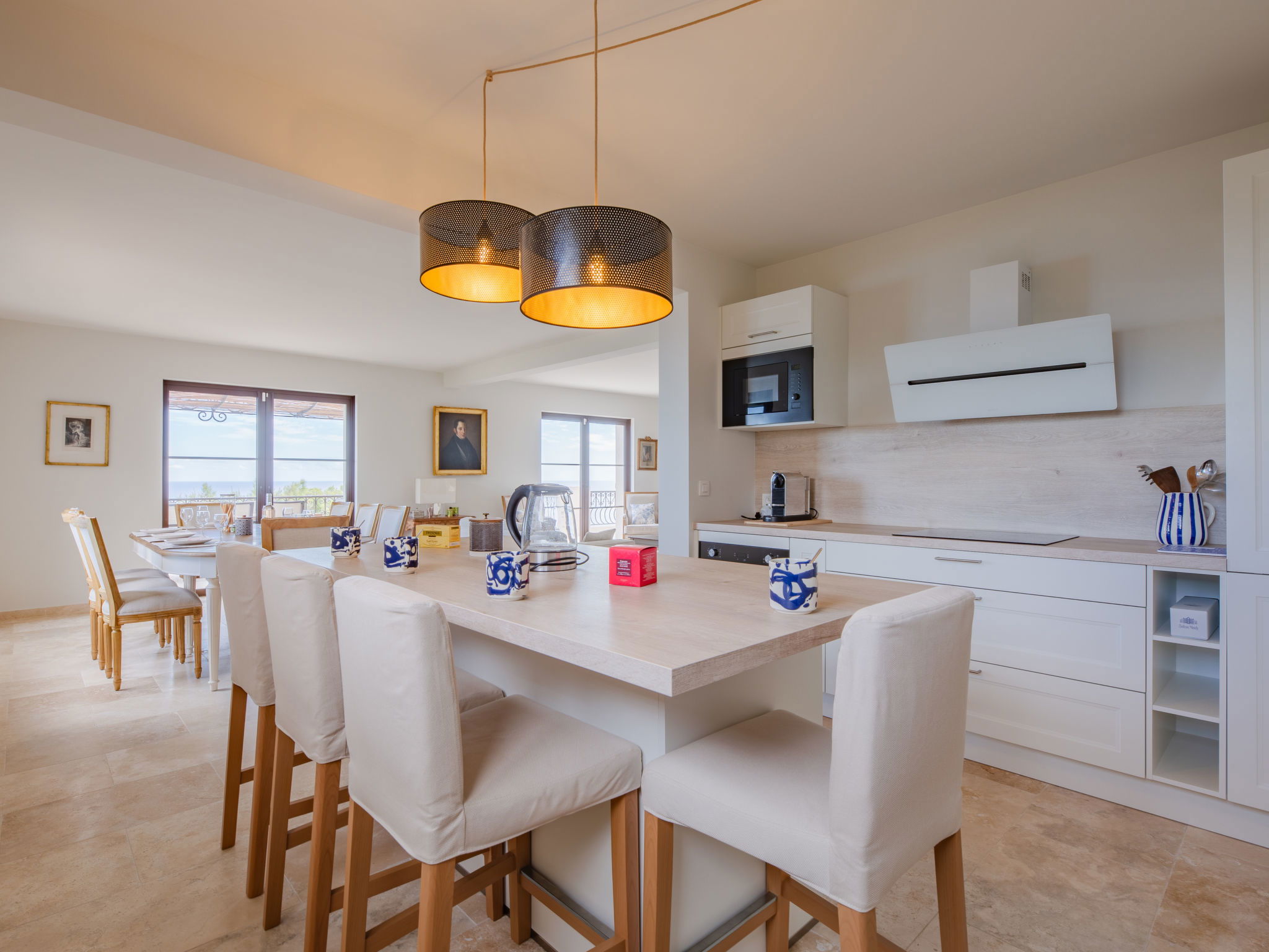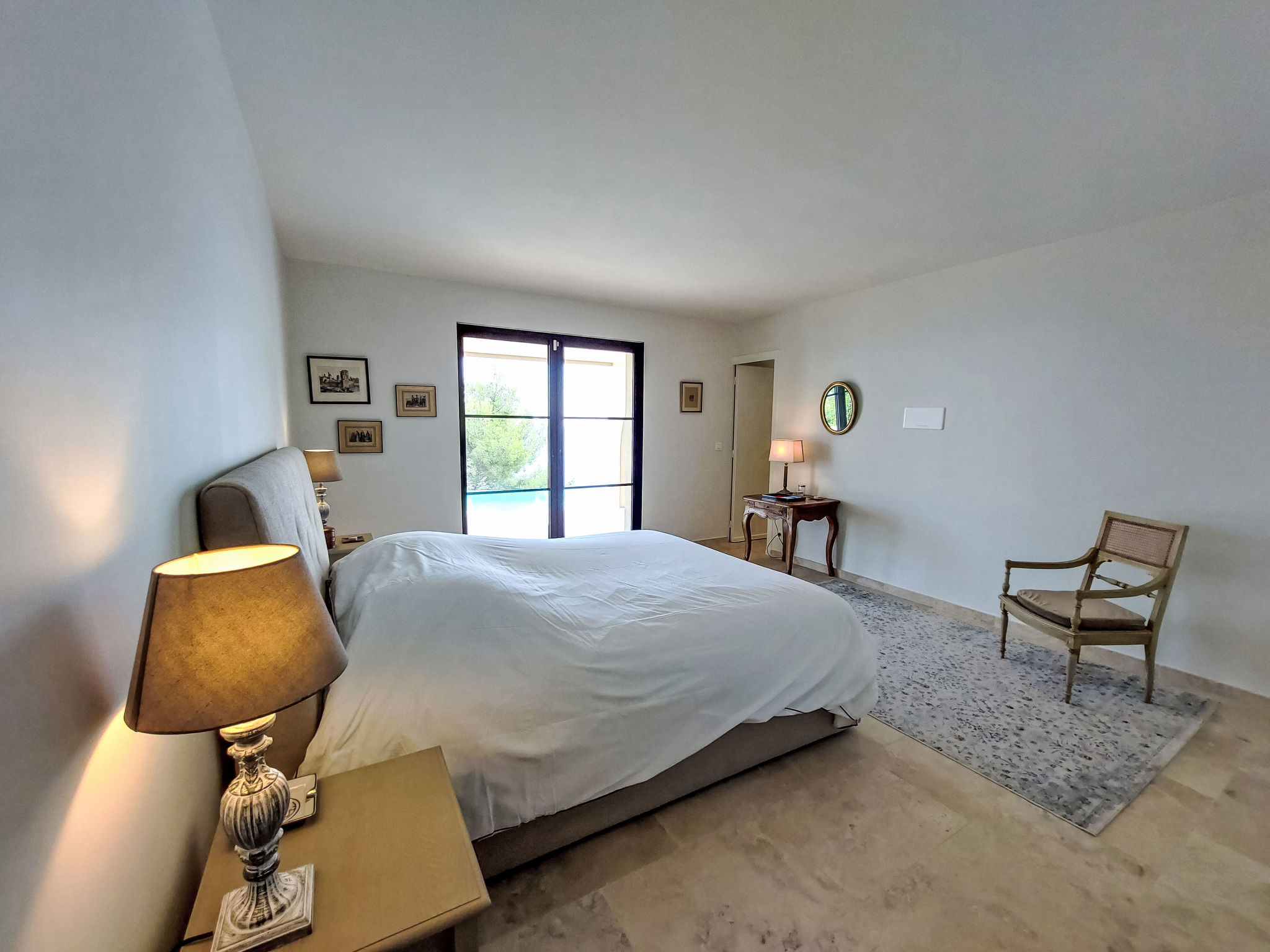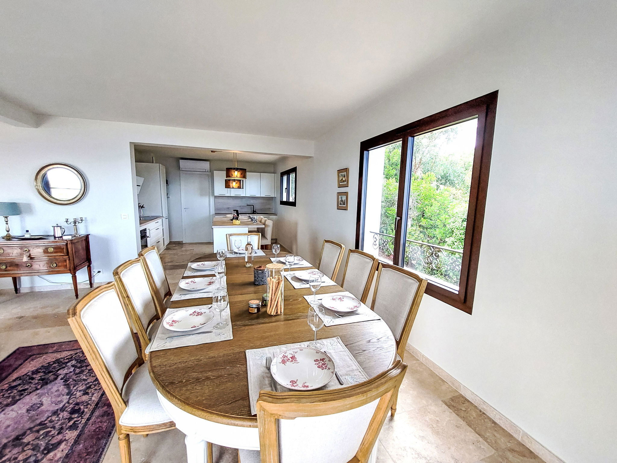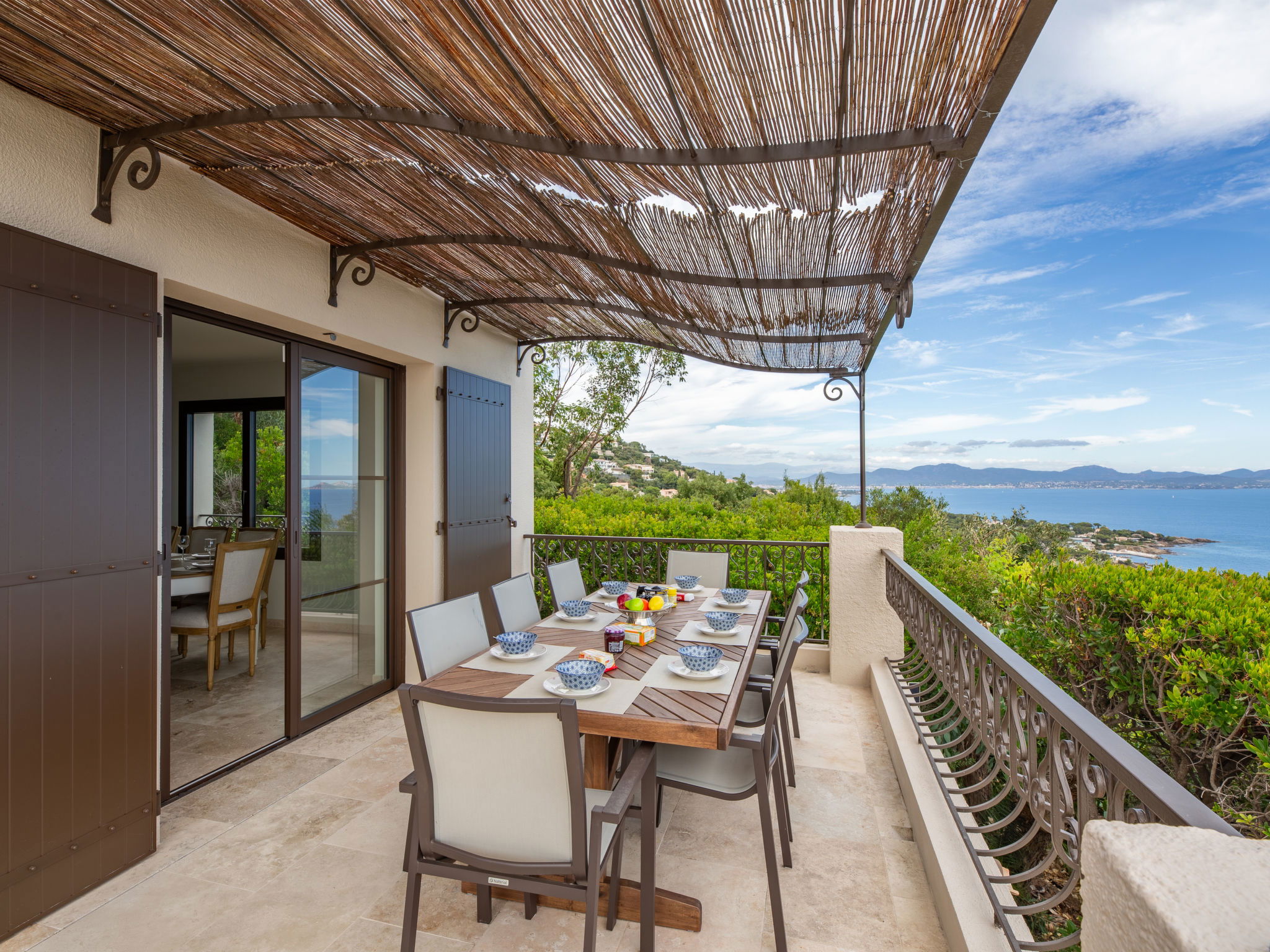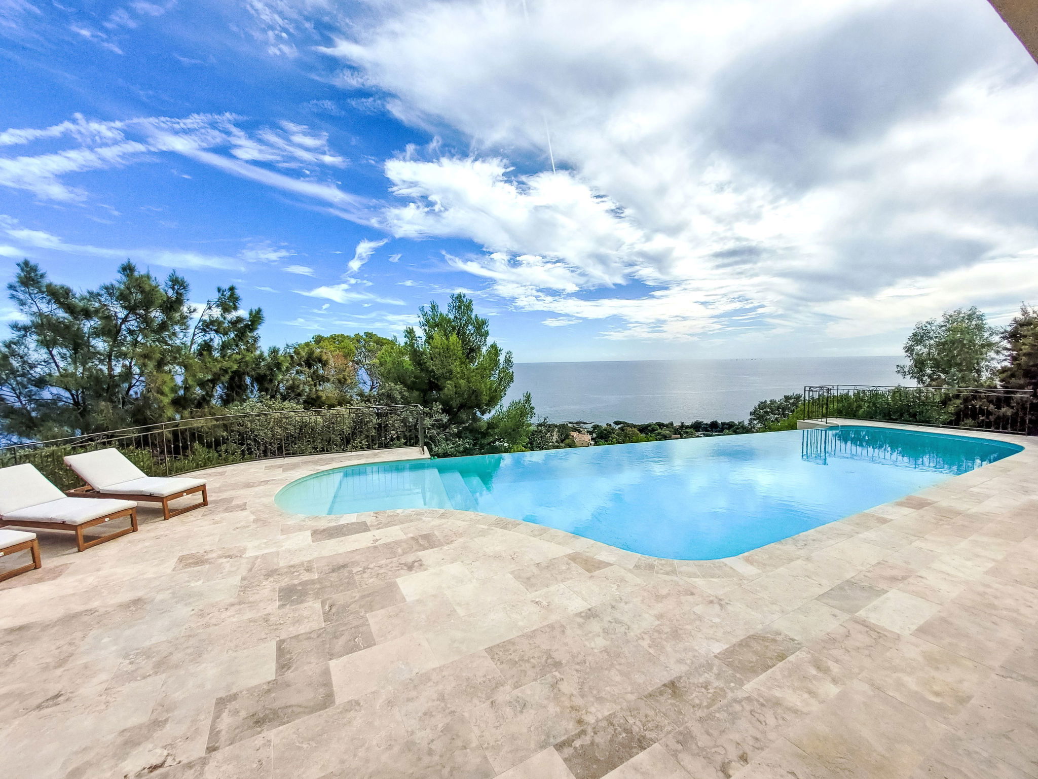 5-room villa 220 m2 on 2 levels. Modern furnishings: large living/dining room with panoramic window with TV (flat screen). Exit to the terrace. 1 large room with 1 french bed (160 cm, length 200 cm), bath/shower/WC and double hand-basin. Exit to the terrace. Large, open kitchen (oven, dishwasher, 4 induction hot plates, toaster, kettle, microwave, freezer, electric coffee machine, Capsules for coffee machine (Nespresso) extra) with bar. Sep. WC. Electric heating. On the lower ground floor: 1 large room with 1 french bed (160 cm, length 200 cm). Exit to the terrace, to the swimming pool. 1 large room with 1 french bed (1 x 160 cm, length 200 cm), hand-basin. Exit to the terrace, to the swimming pool. 1 large room with 1 french bed (1 x 160 cm, length 200 cm), bath/shower. Exit to the terrace, to the swimming pool. Shower/WC. Electric heating. Large terrace 300 m2, south facing position. Terrace furniture, balcony furniture, deck chairs (8). Panoramic view of the sea. Facilities: washing machine, iron, children's high chair, baby cot (extra), hair dryer. Internet (WiFi, free). Parking (1 car). Please note: non-smoking house. Smoke alarm. Offer by a private individual according to Art. 155, IV of CGI. 83107002726FM