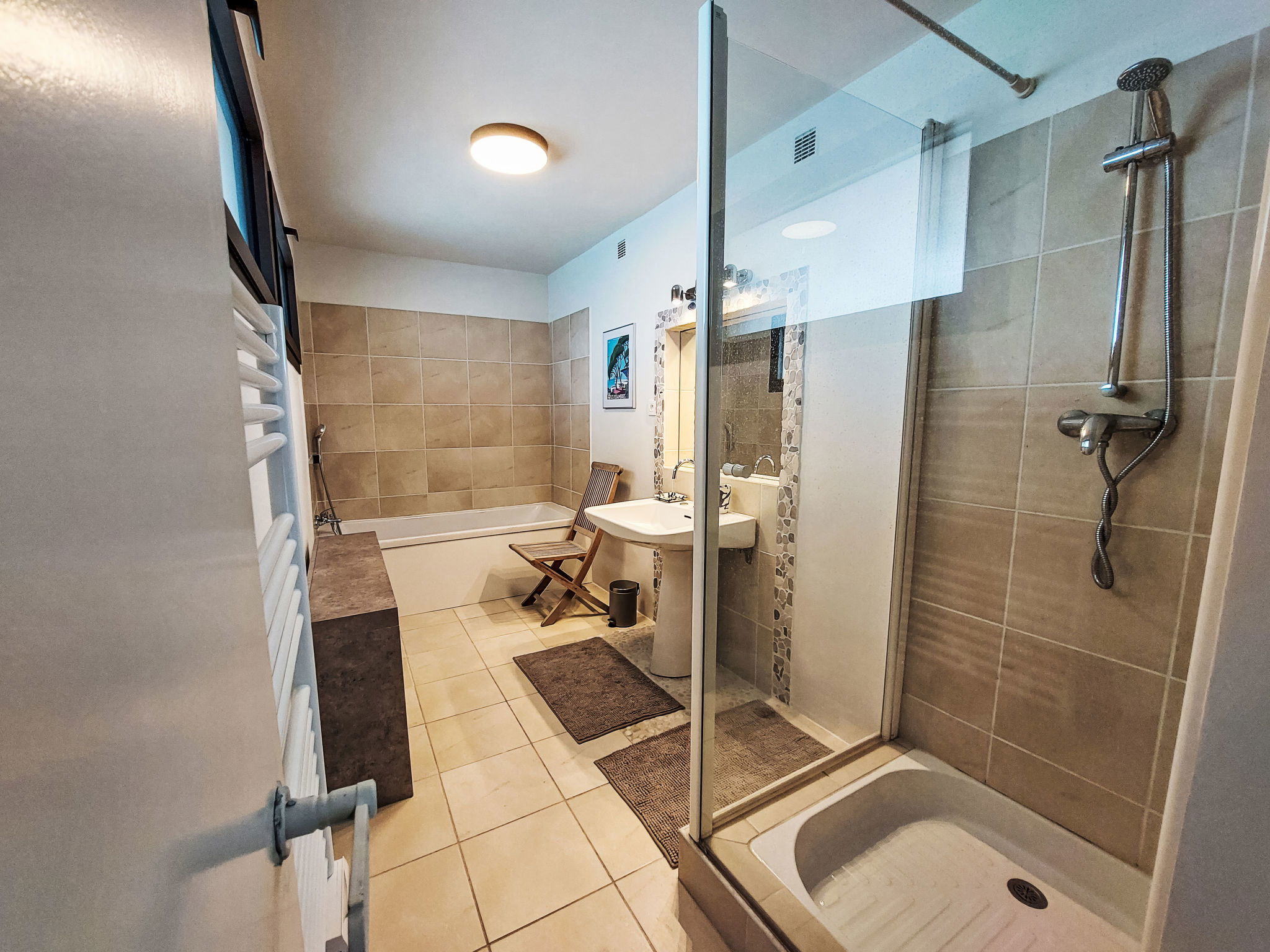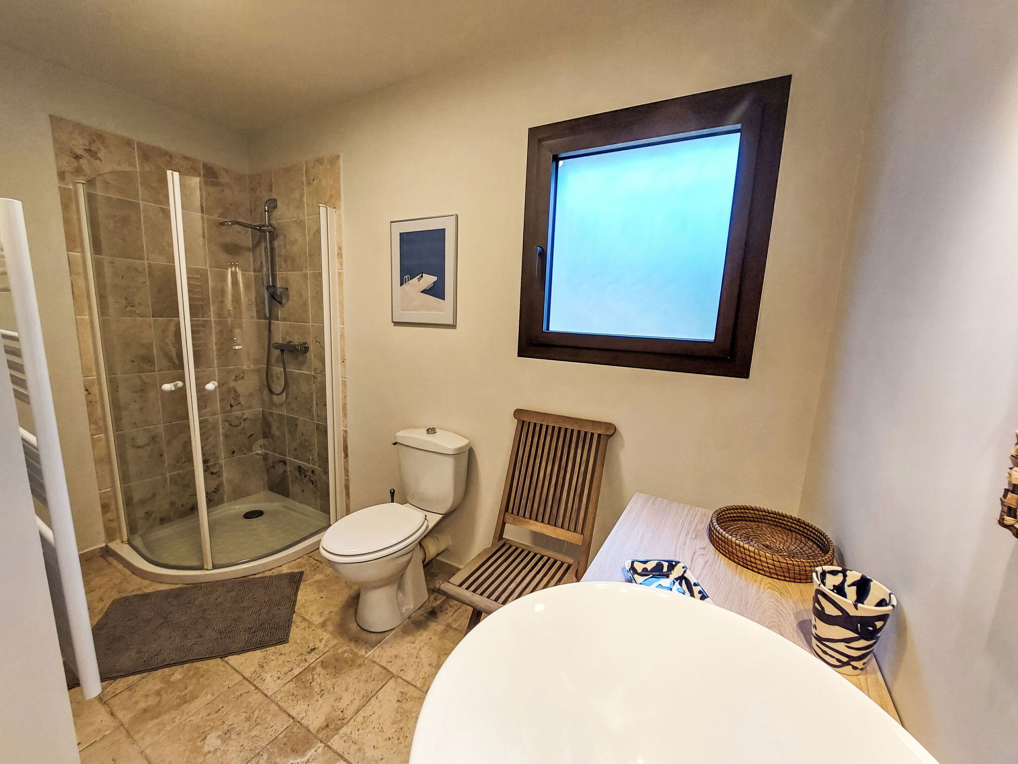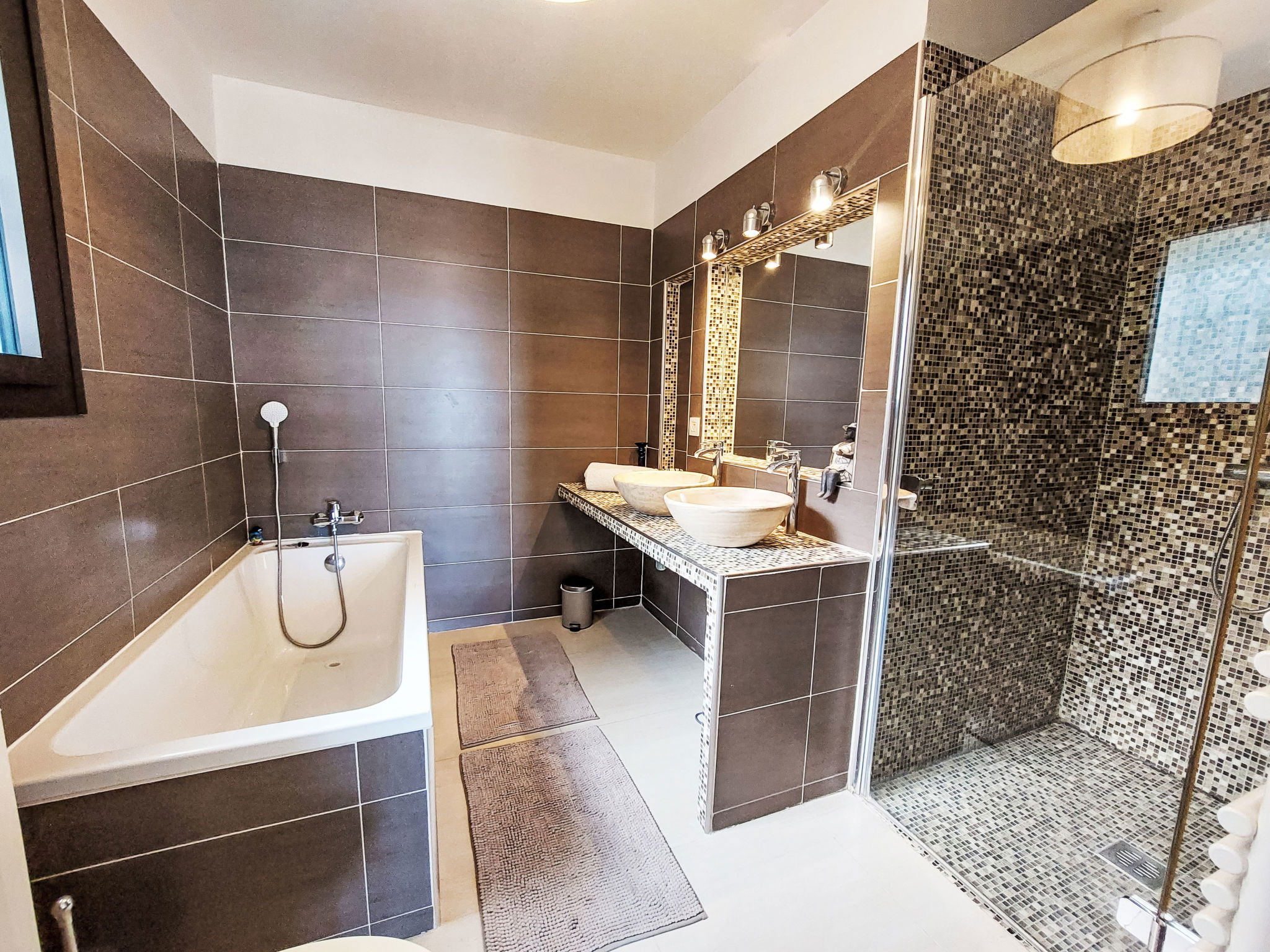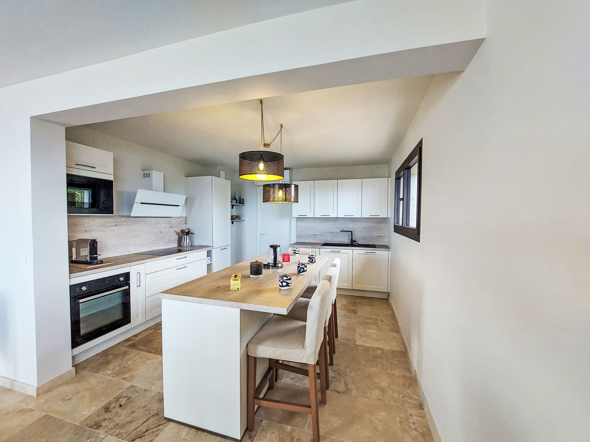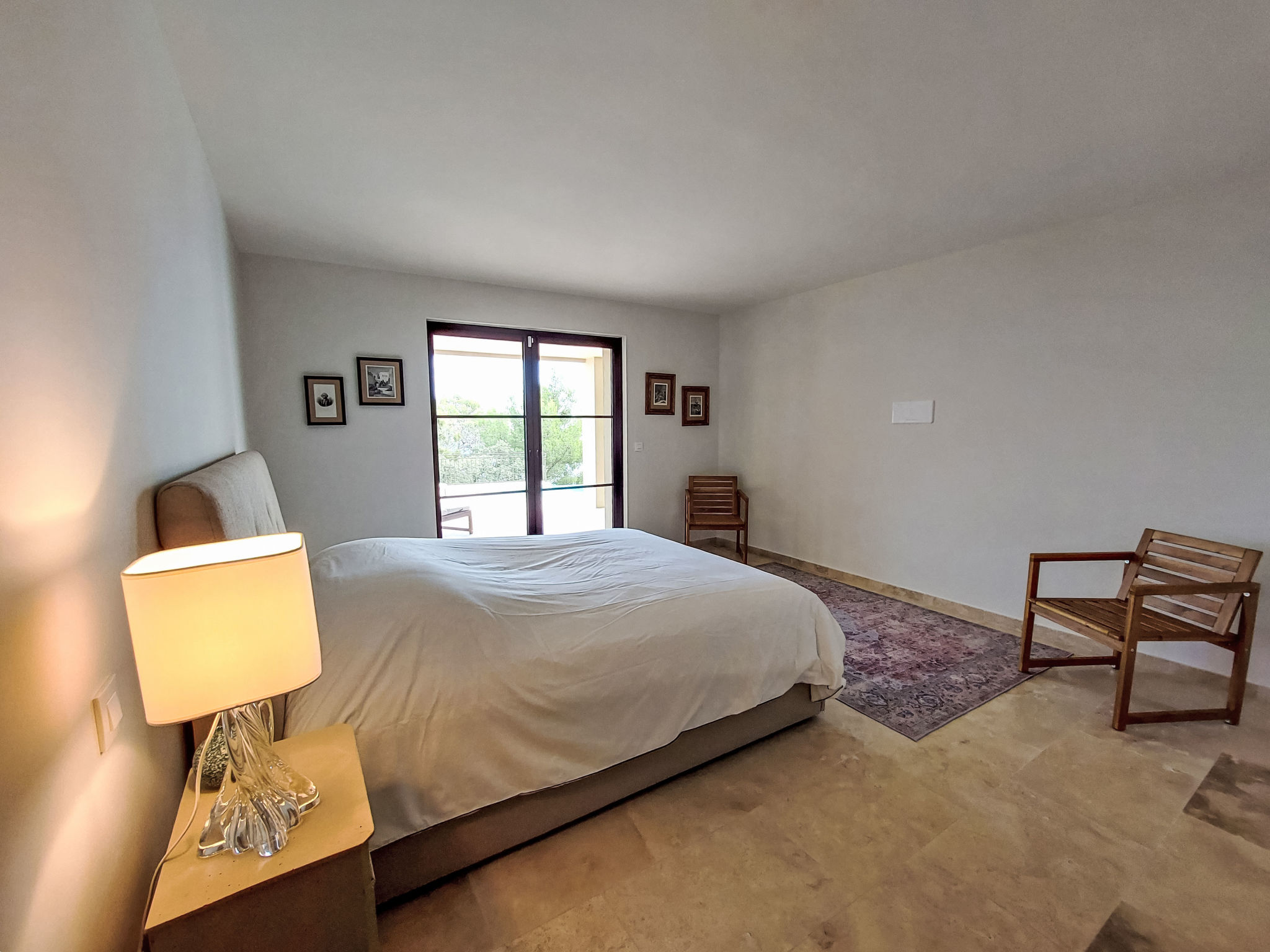 5-room villa 220 m2 on 2 levels. Modern furnishings: large living/dining room with panoramic window with TV (flat screen). Exit to the terrace. 1 large room with 1 french bed (160 cm, length 200 cm), bath/shower/WC and double hand-basin. Exit to the terrace. Large, open kitchen (oven, dishwasher, 4 induction hot plates, toaster, kettle, microwave, freezer, electric coffee machine, Capsules for coffee machine (Nespresso) extra) with bar. Sep. WC. Electric heating. On the lower ground floor: 1 large room with 1 french bed (160 cm, length 200 cm). Exit to the terrace, to the swimming pool. 1 large room with 1 french bed (1 x 160 cm, length 200 cm), hand-basin. Exit to the terrace, to the swimming pool. 1 large room with 1 french bed (1 x 160 cm, length 200 cm), bath/shower. Exit to the terrace, to the swimming pool. Shower/WC. Electric heating. Large terrace 300 m2, south facing position. Terrace furniture, balcony furniture, deck chairs (8). Panoramic view of the sea. Facilities: washing machine, iron, children's high chair, baby cot (extra), hair dryer. Internet (WiFi, free). Parking (1 car). Please note: non-smoking house. Smoke alarm. Offer by a private individual according to Art. 155, IV of CGI. 83107002726FM