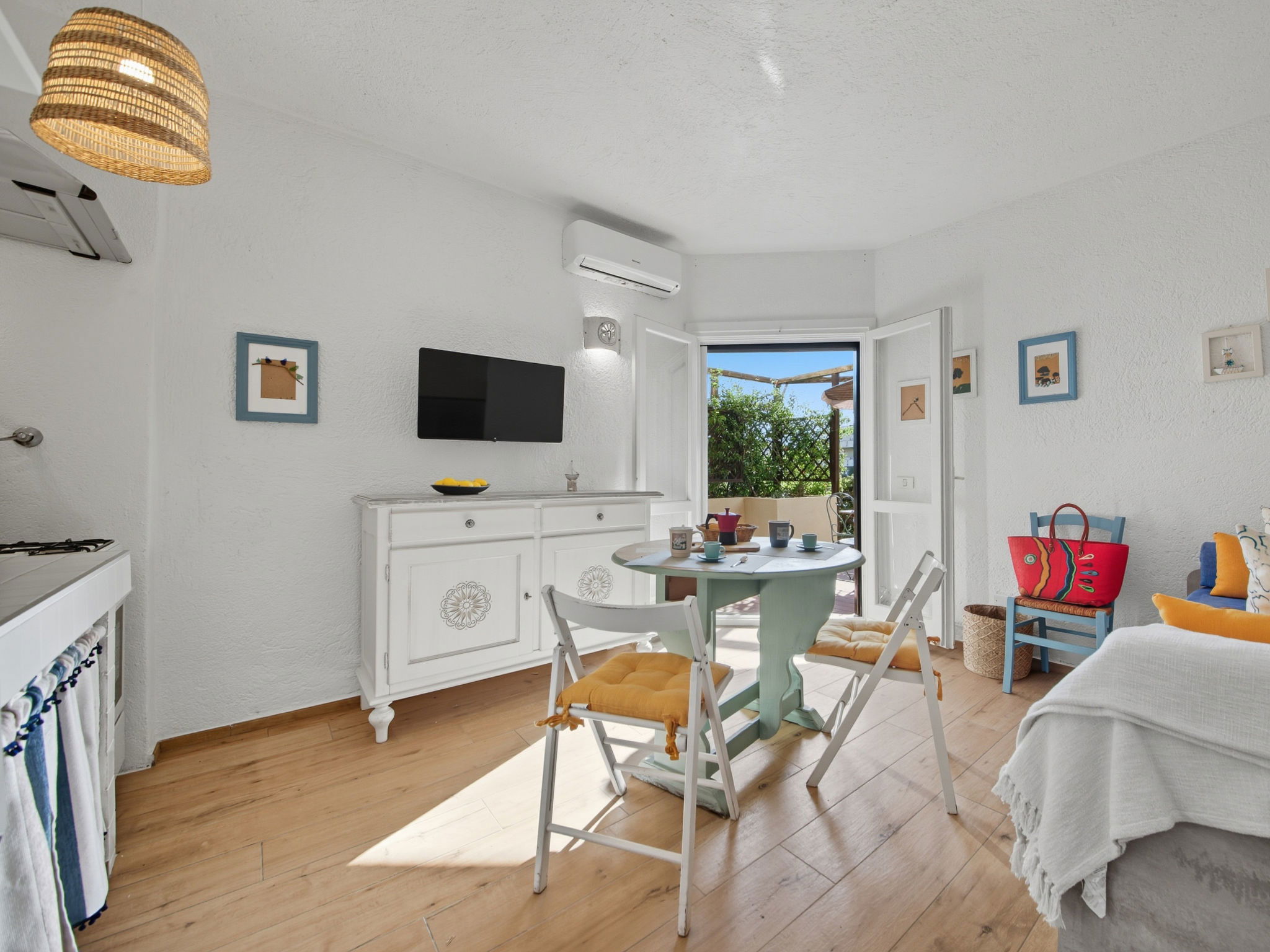 "Iris 5, Terza Spiaggia", 2-room apartment 42 m2, on the ground floor. Simple and practical furnishings: living/dining room with 1 sofabed, 1 pull-out bed and TV (flat screen). Exit to the terrace. 1 double bedroom. Small, open kitchen (4 hot plates, oven, dishwasher, toaster, kettle). Shower/bidet/WC. Air-conditioning, forced-air heating. Terrace 8 m2. Terrace furniture. Partial view of the sea and the garden. Facilities: washing machine, iron, mosquito net, hair dryer. Internet (WiFi). Parking space n 5 (fenced). Maximum 1 pet/ dog allowed. IT090083C2000T7864