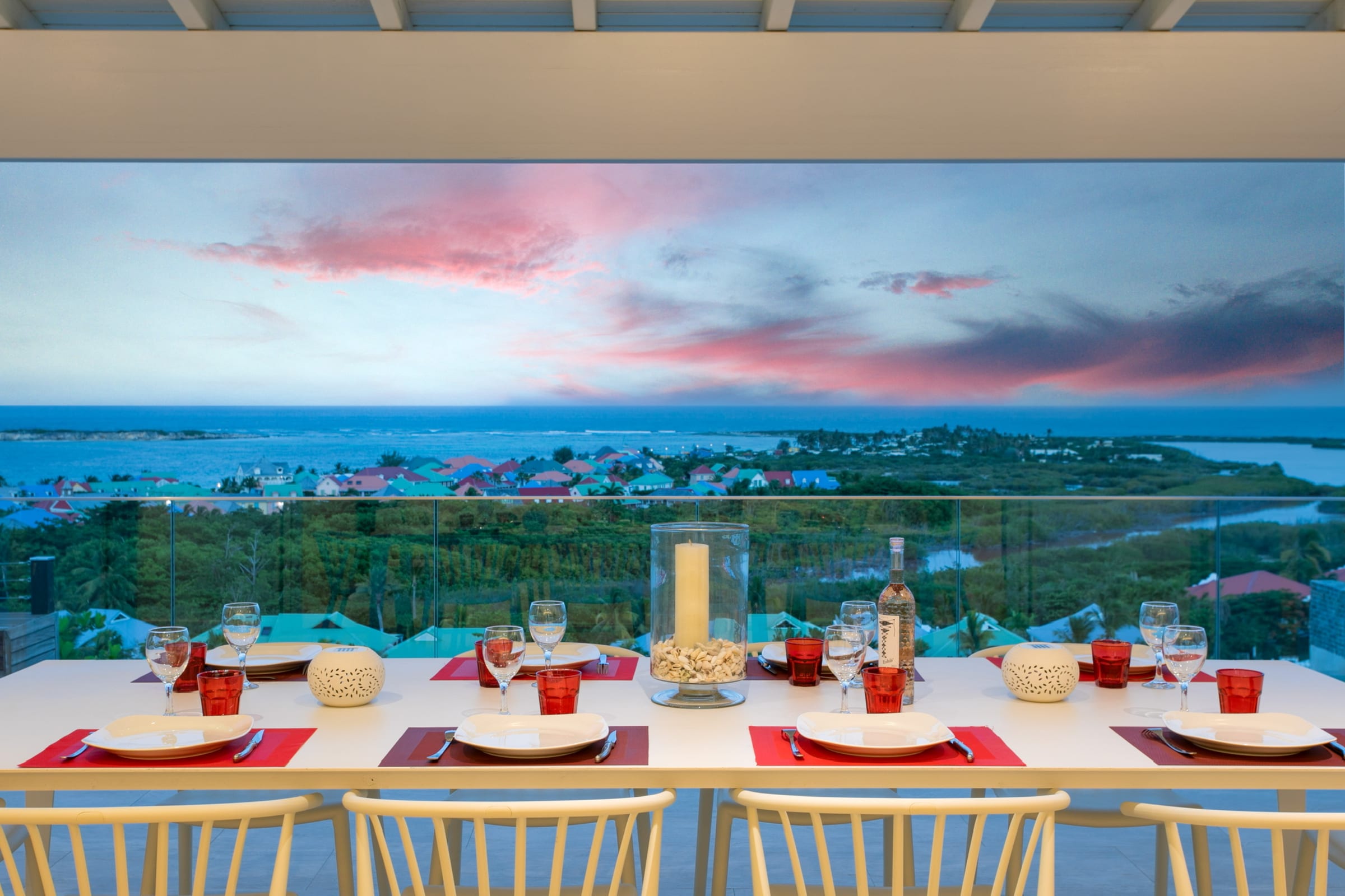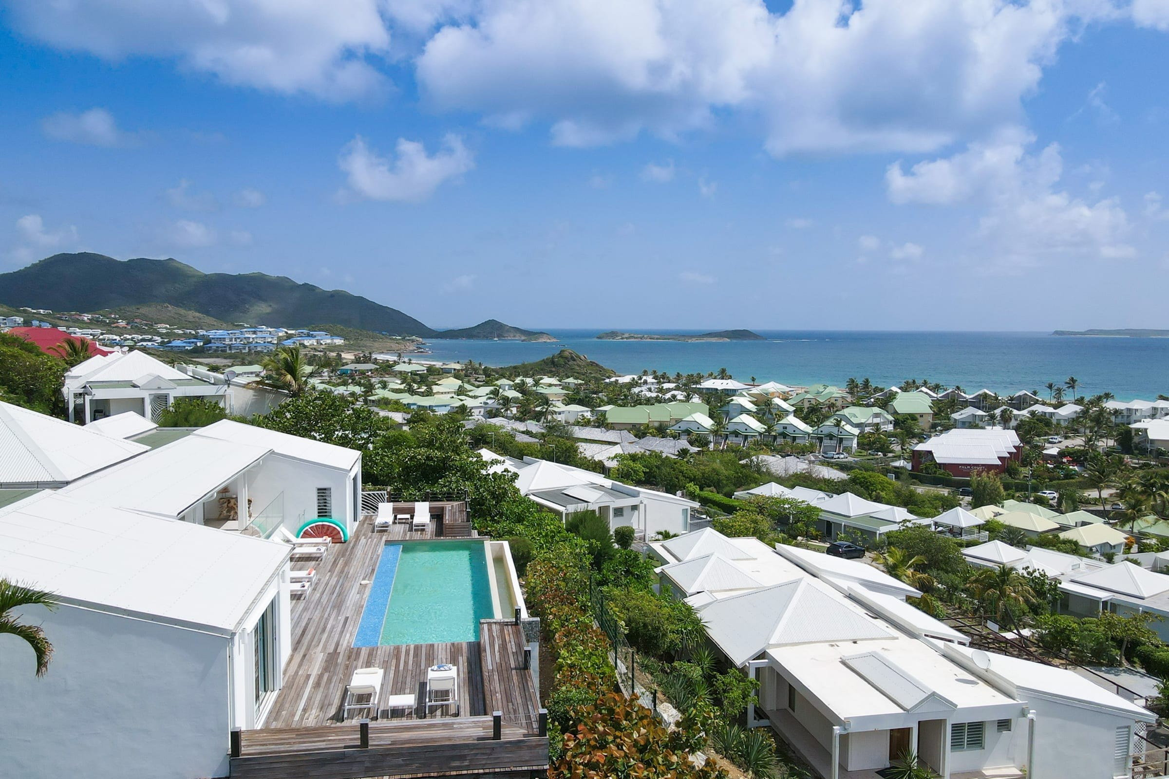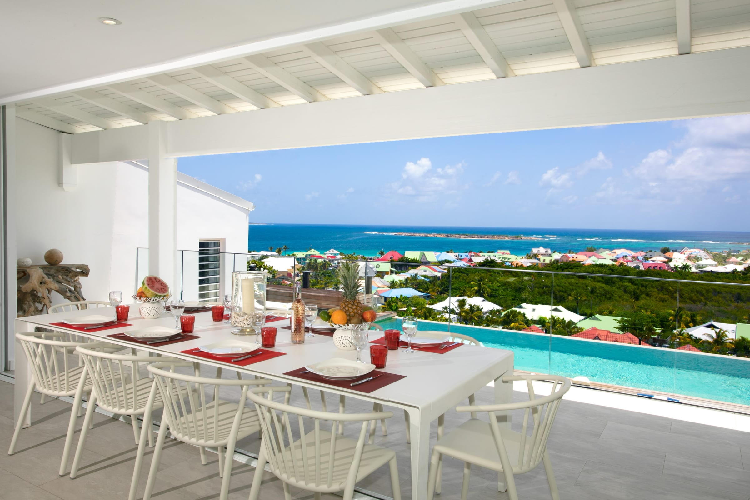The villa's outdoor space is a real highlight, with an infinity pool and a large terrace offering breathtaking views of Orient Bay. This serene setting offers both privacy and the perfect opportunity to sunbathe, relax and enjoy the Caribbean ambience in an atmosphere of calm.