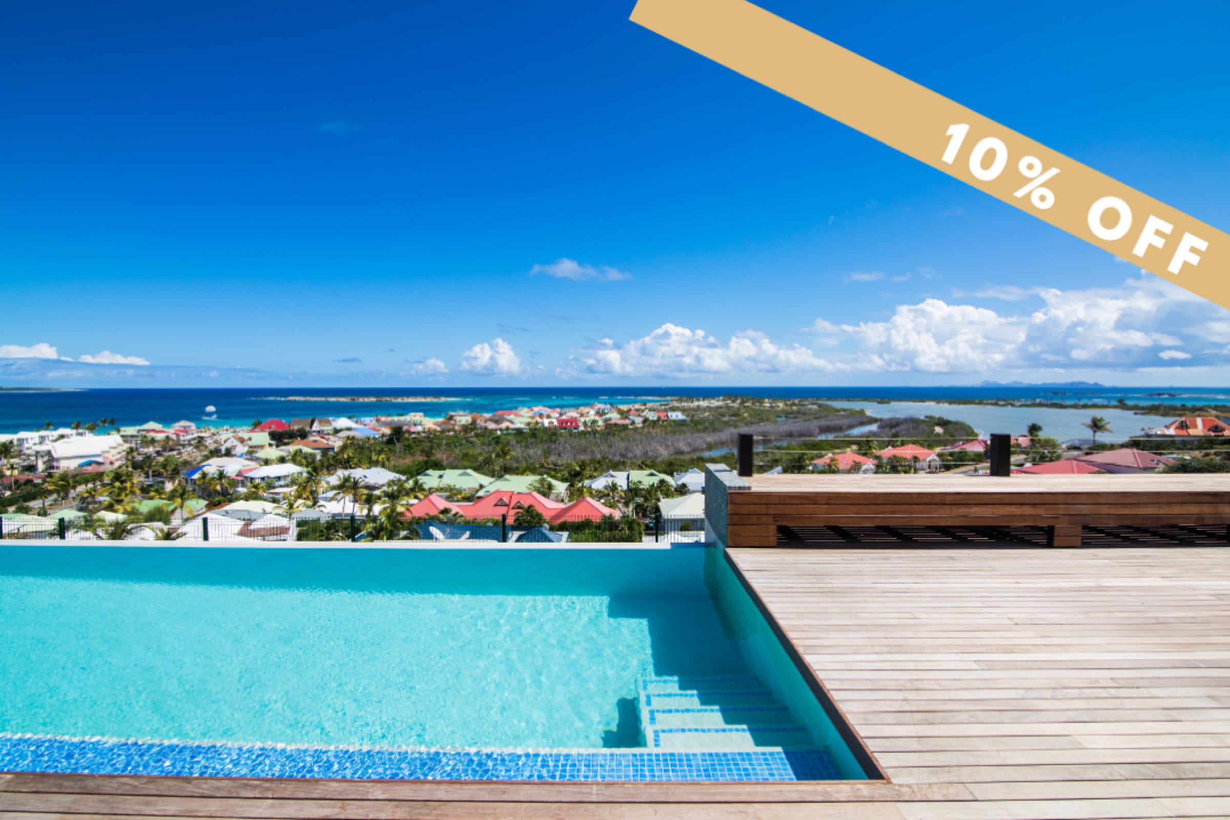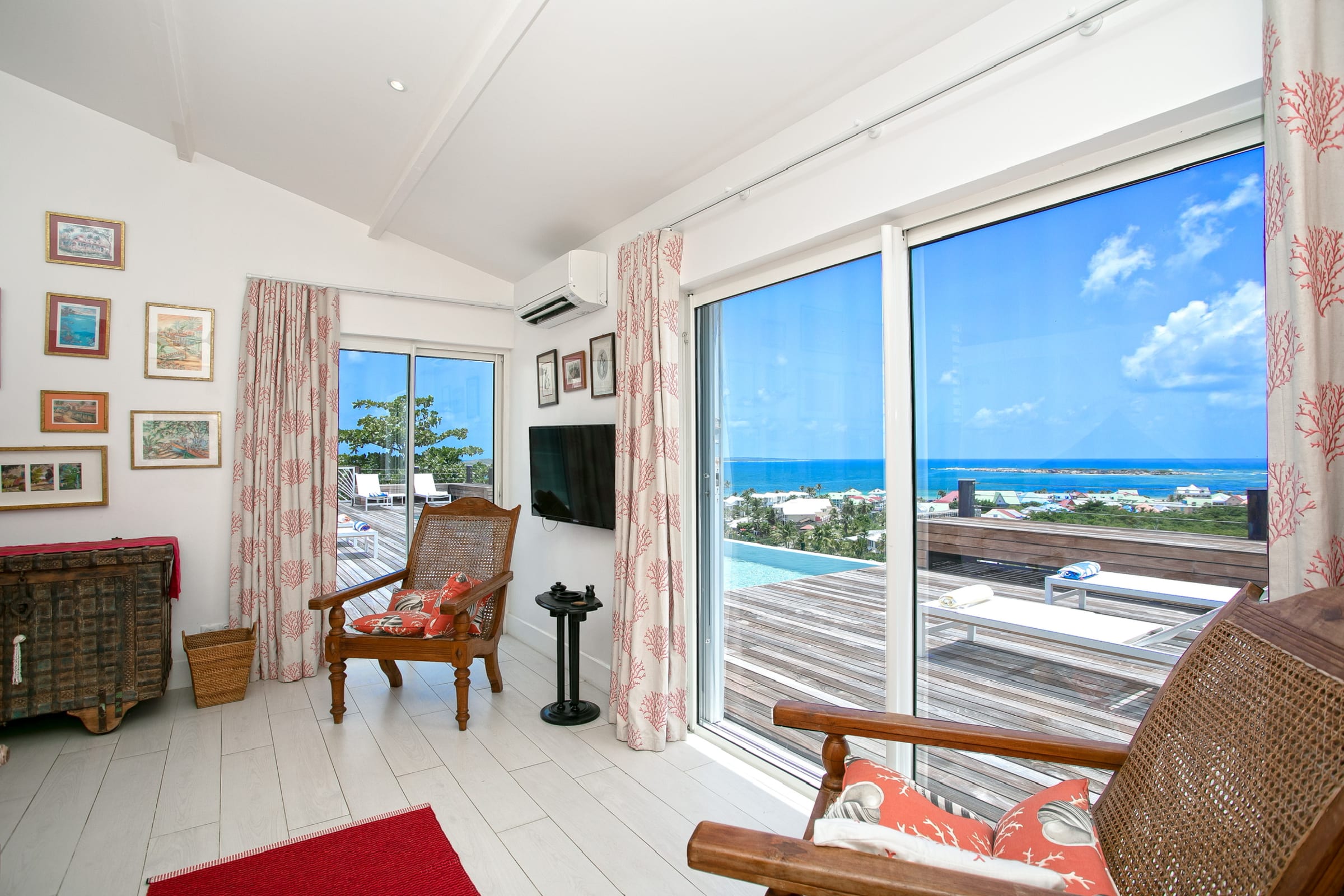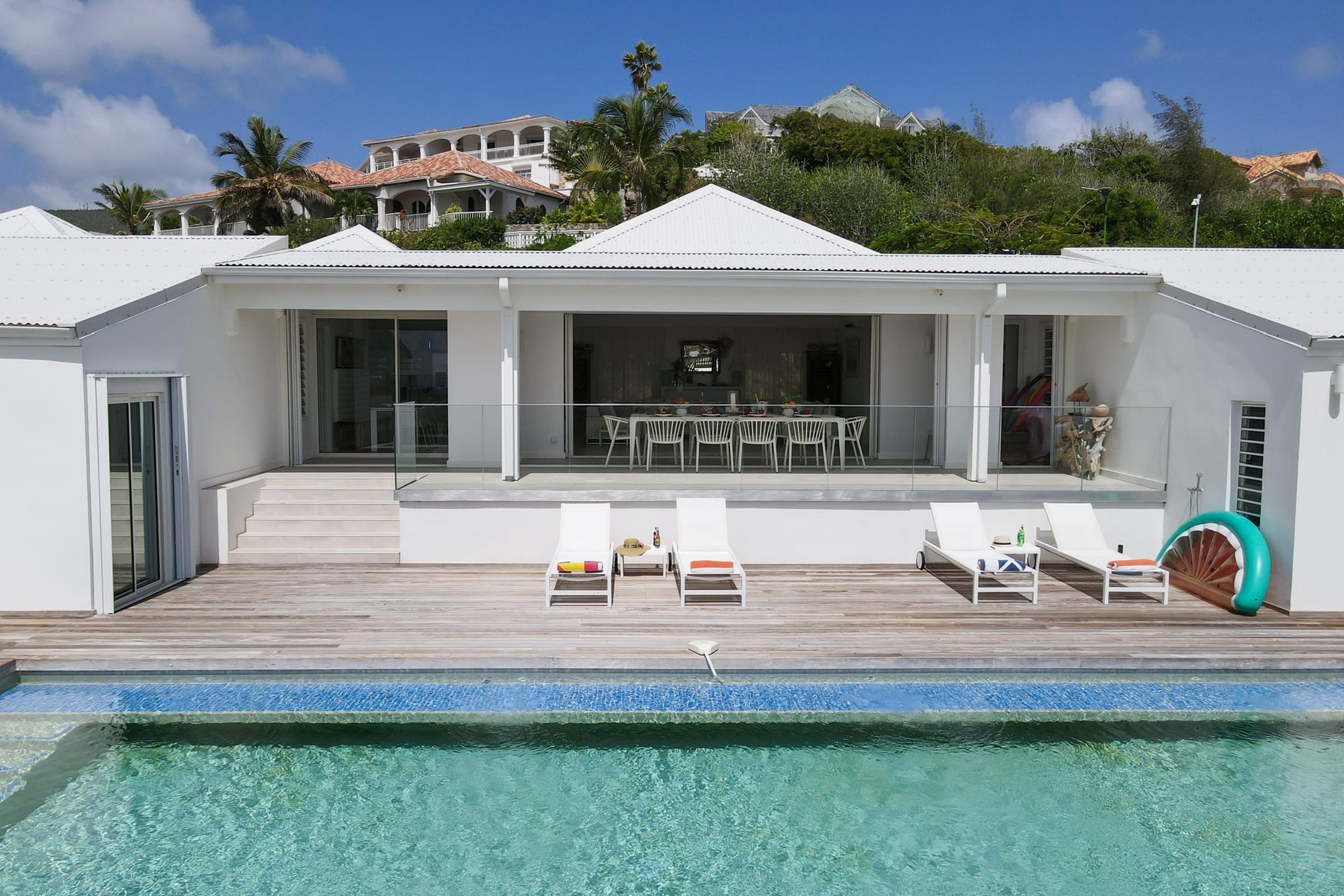 The villa's outdoor space is a real highlight, with an infinity pool and a large terrace offering breathtaking views of Orient Bay. This serene setting offers both privacy and the perfect opportunity to sunbathe, relax and enjoy the Caribbean ambience in an atmosphere of calm.