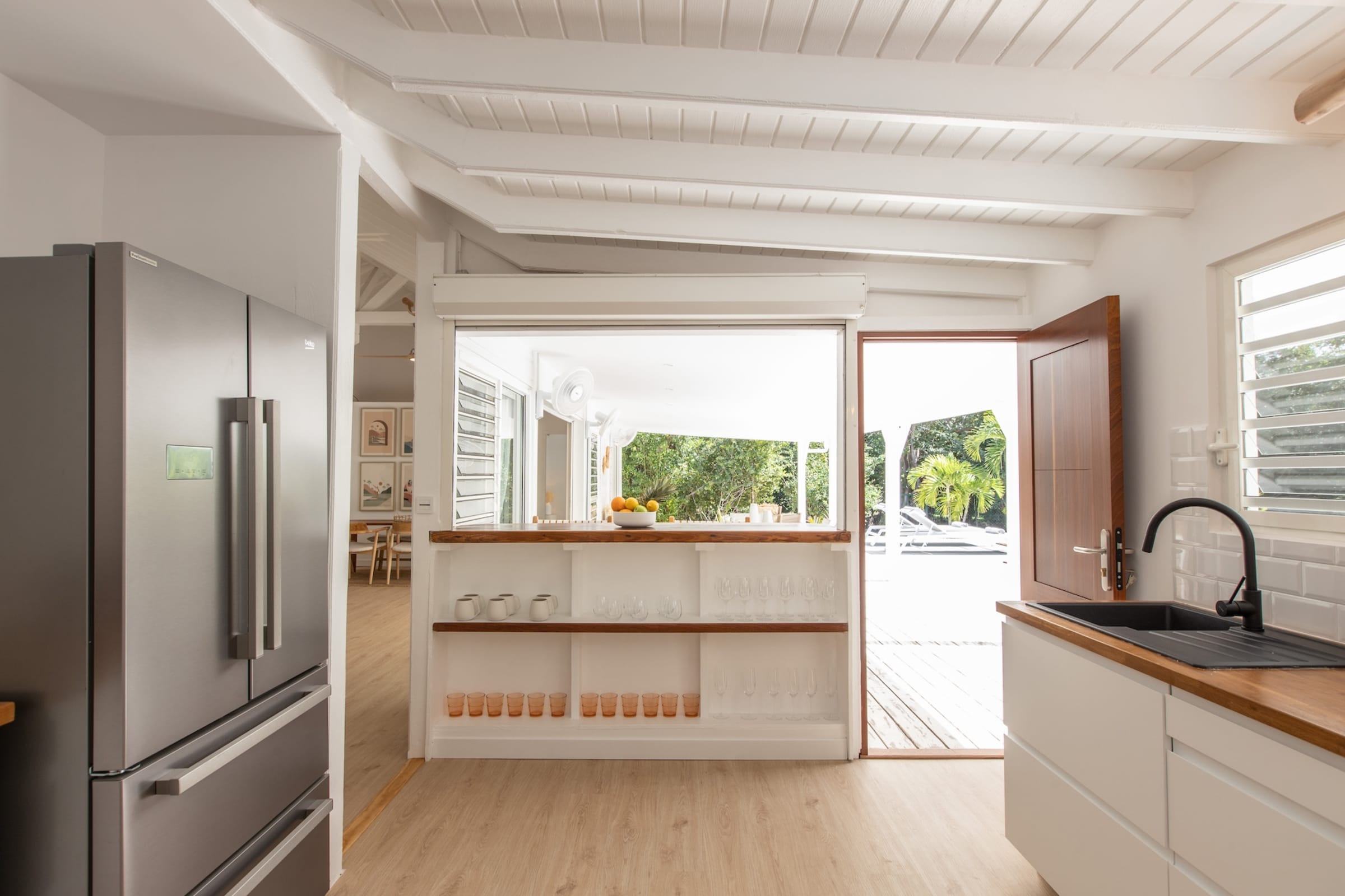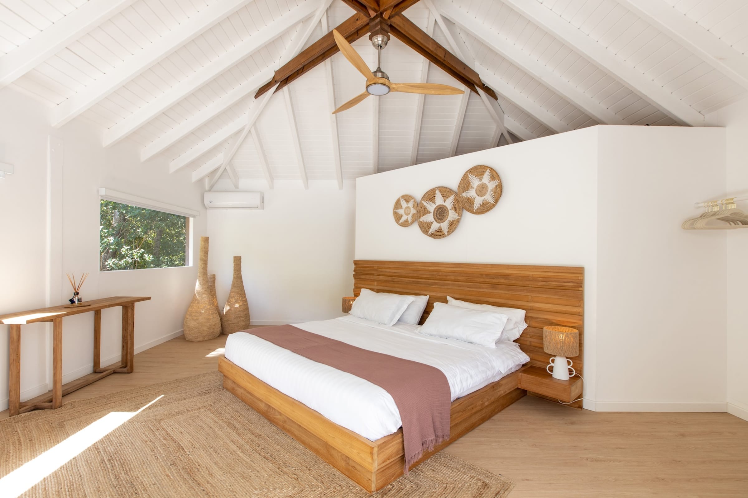 The villa features two master bedrooms, each adorned with an ensuite bathroom. The master bedroom resides within the main house, seamlessly blending modern elegance with tropical charm. Here, large windows frame panoramic views of the lush surroundings, inviting in the warm Caribbean sunlight. The ensuite bathroom boasts contemporary amenities, offering a private oasis for relaxation.