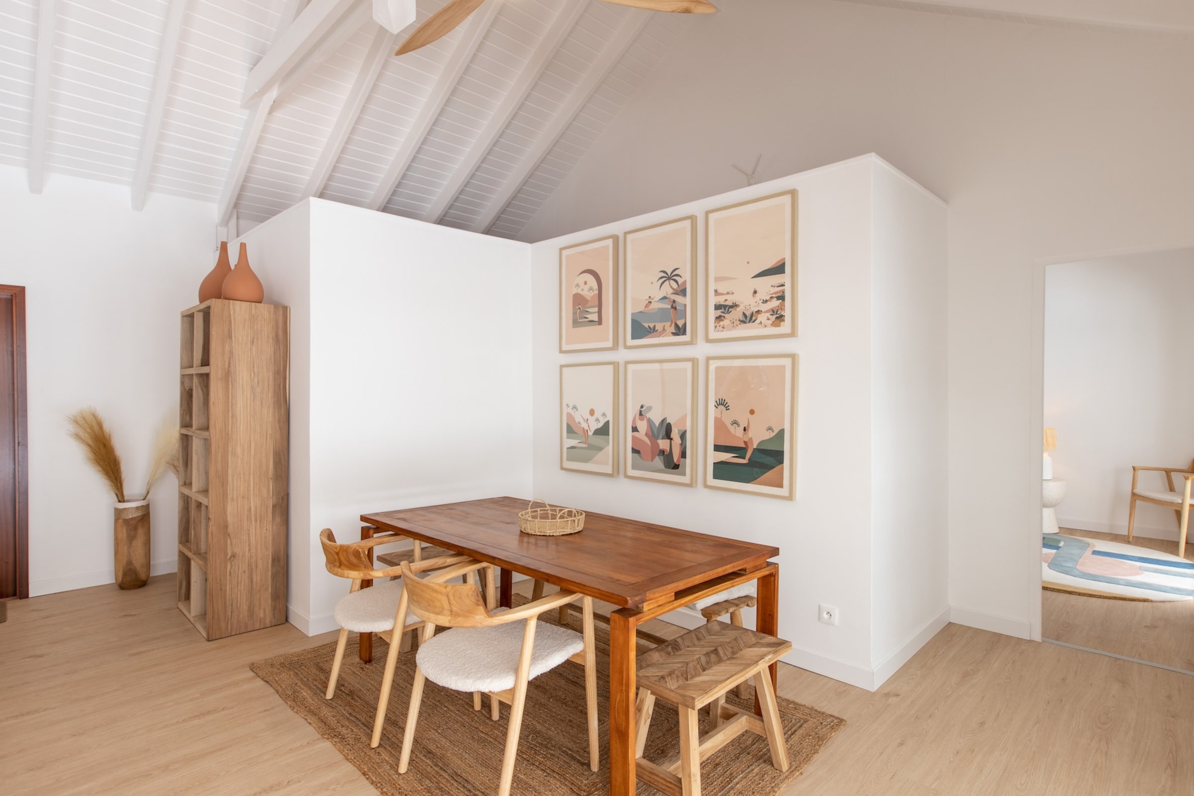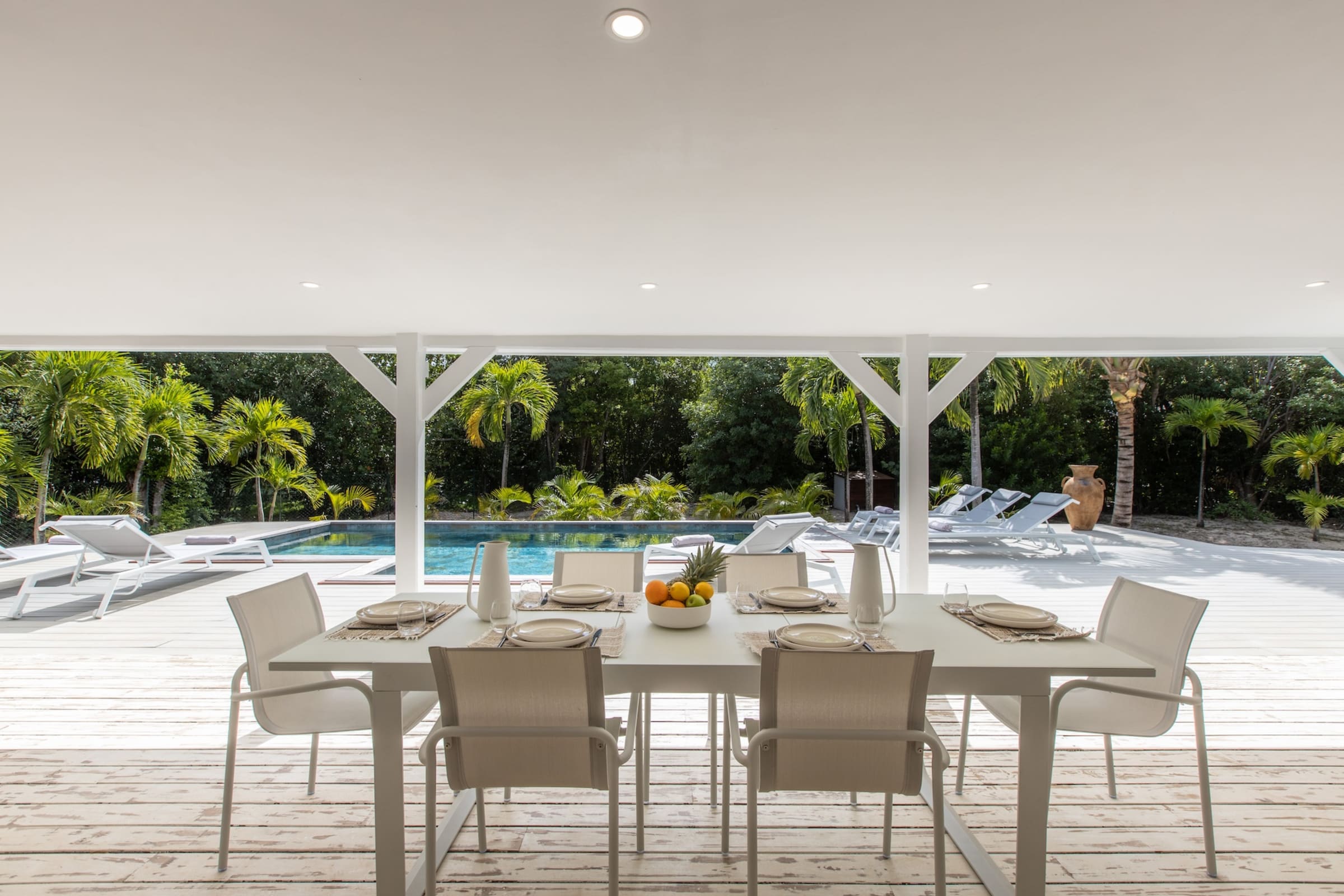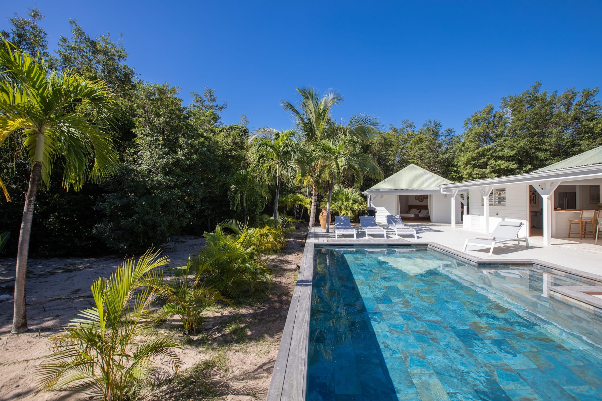 The villa's interior spaces are thoughtfully designed, with an open-concept layout that seamlessly connects the living, dining, and kitchen areas. The decor exudes a sophisticated tropical aesthetic, combining neutral tones with vibrant pops of Caribbean-inspired colors. High ceilings and large windows enhance the sense of spaciousness, creating an airy ambiance that complements the tropical surroundings.