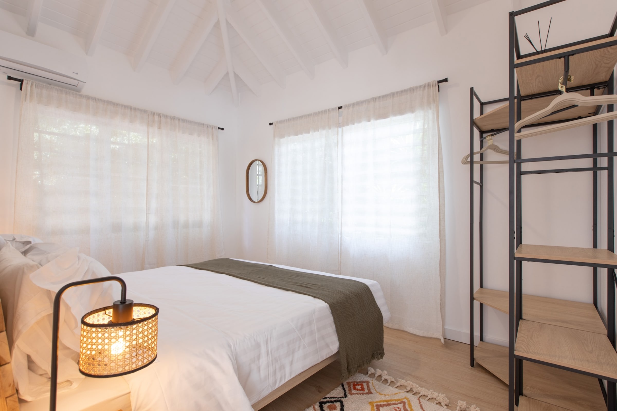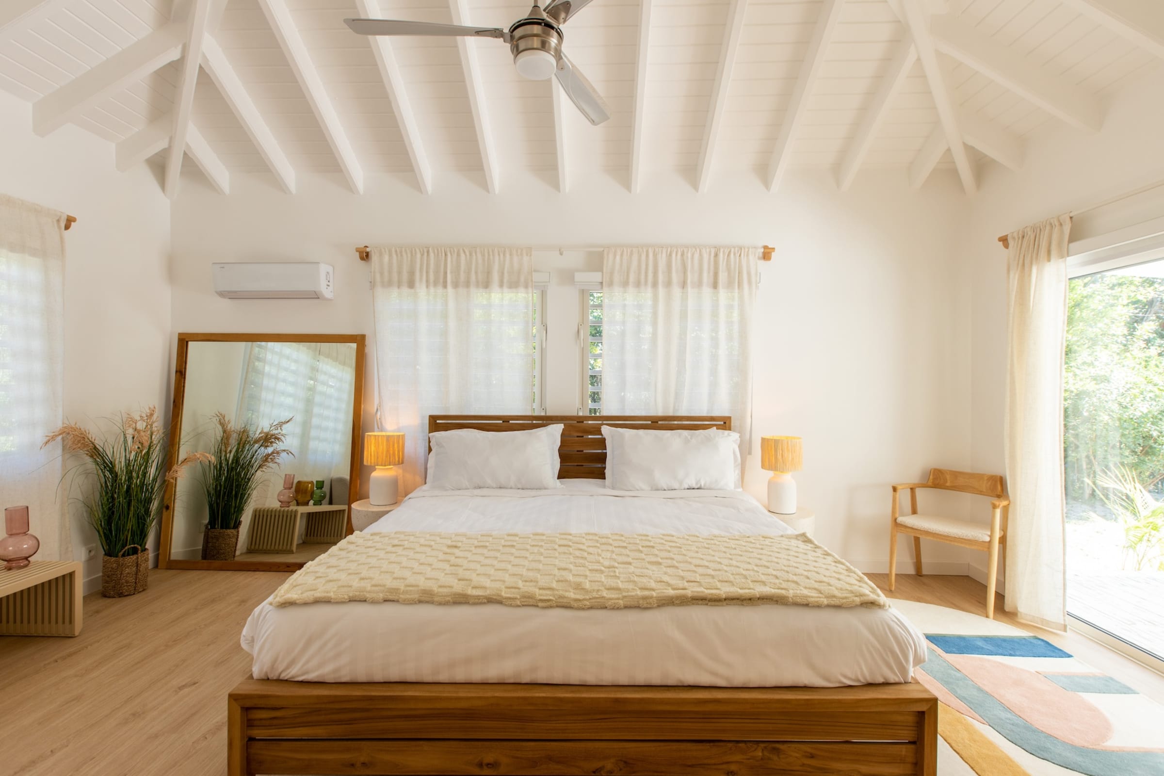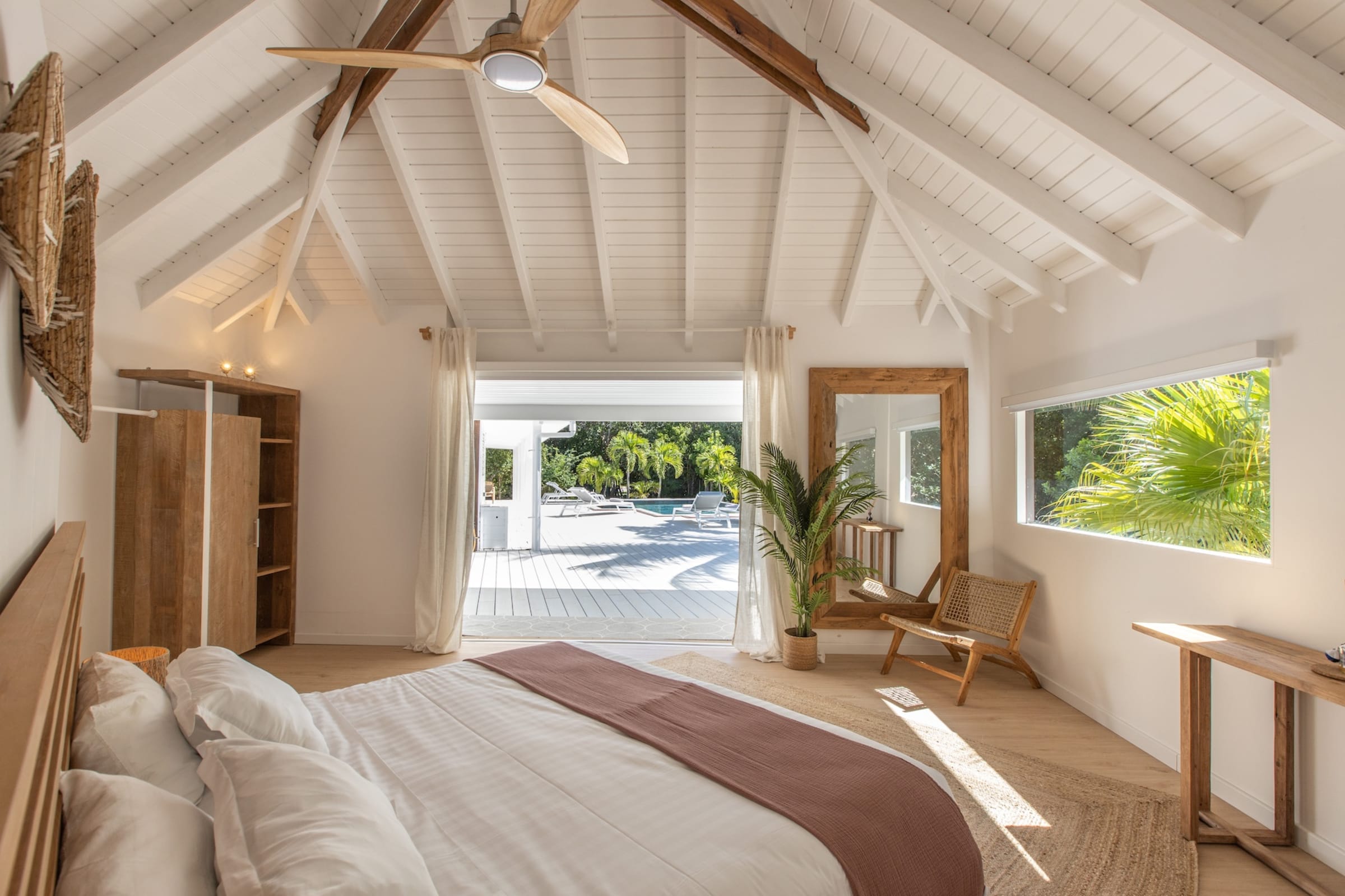The villa features two master bedrooms, each adorned with an ensuite bathroom. The master bedroom resides within the main house, seamlessly blending modern elegance with tropical charm. Here, large windows frame panoramic views of the lush surroundings, inviting in the warm Caribbean sunlight. The ensuite bathroom boasts contemporary amenities, offering a private oasis for relaxation.