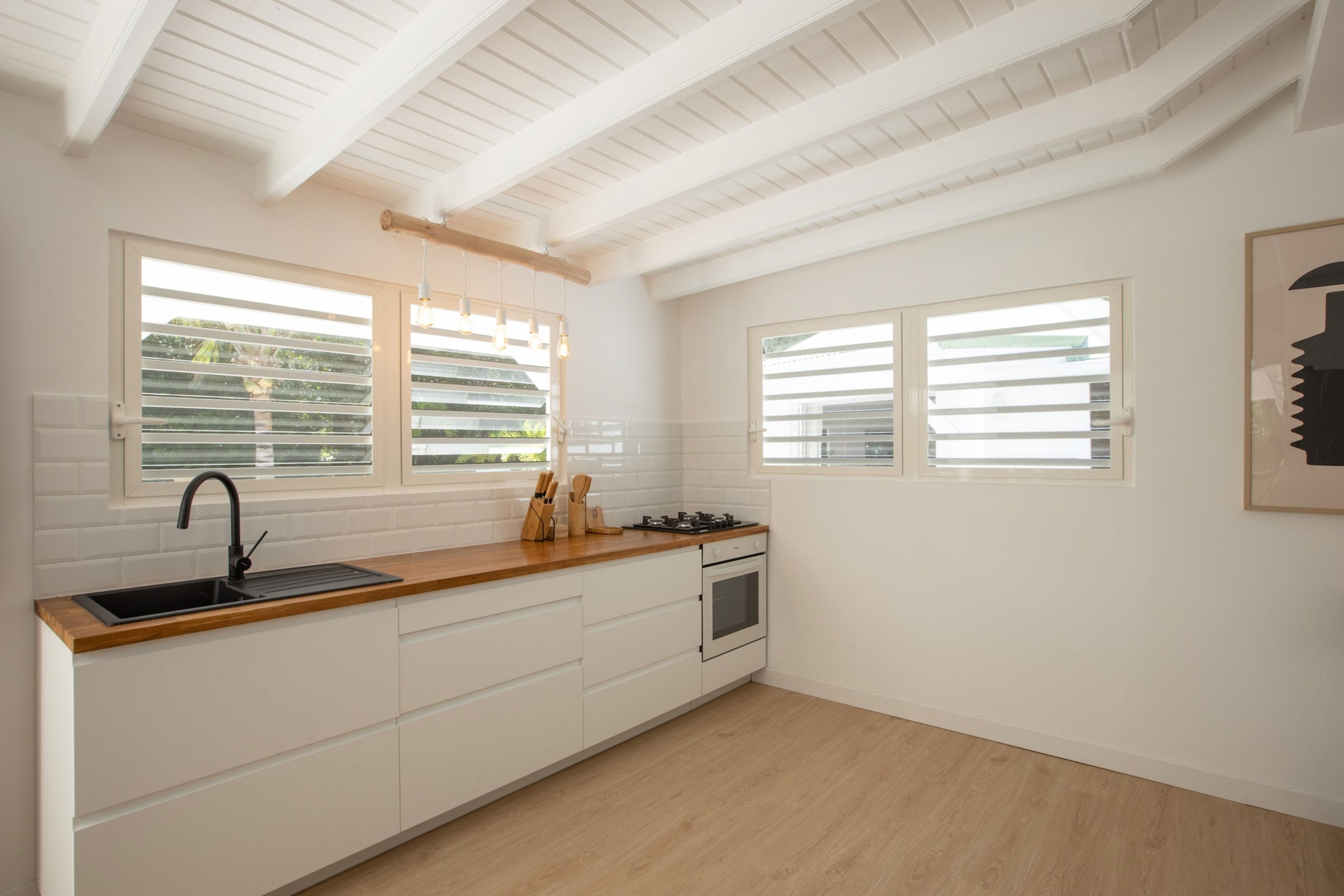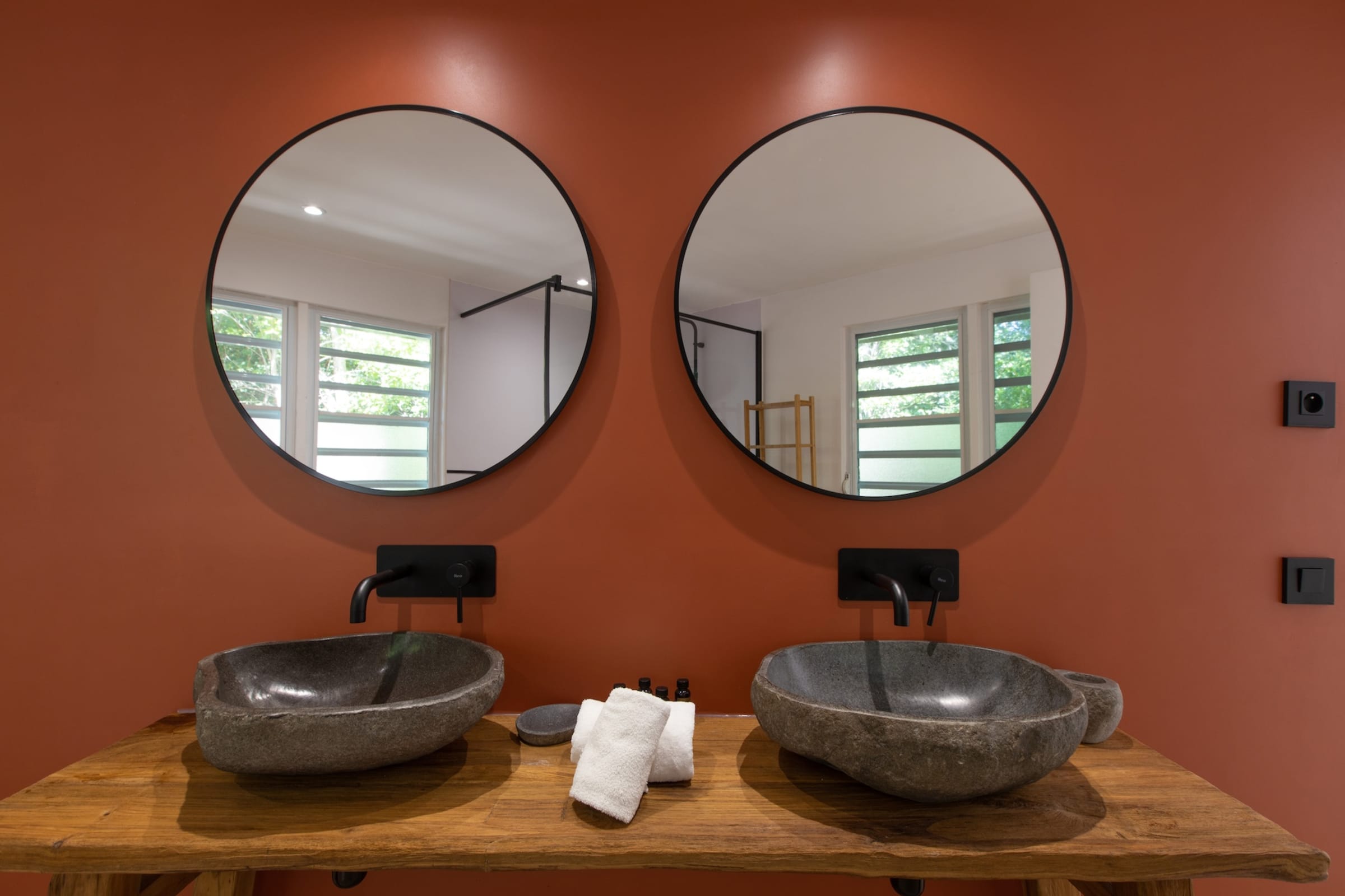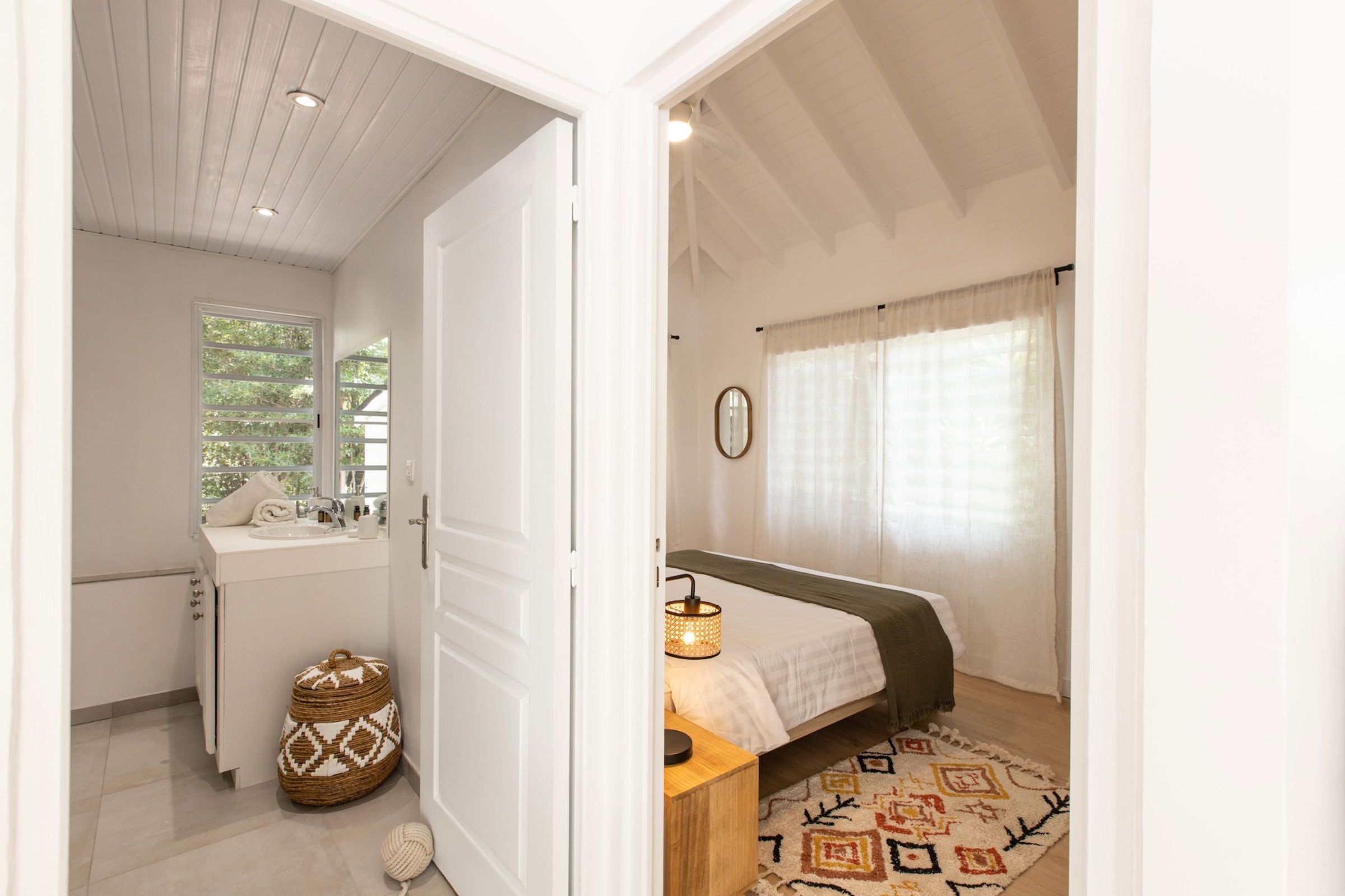 The villa features two master bedrooms, each adorned with an ensuite bathroom. The master bedroom resides within the main house, seamlessly blending modern elegance with tropical charm. Here, large windows frame panoramic views of the lush surroundings, inviting in the warm Caribbean sunlight. The ensuite bathroom boasts contemporary amenities, offering a private oasis for relaxation.