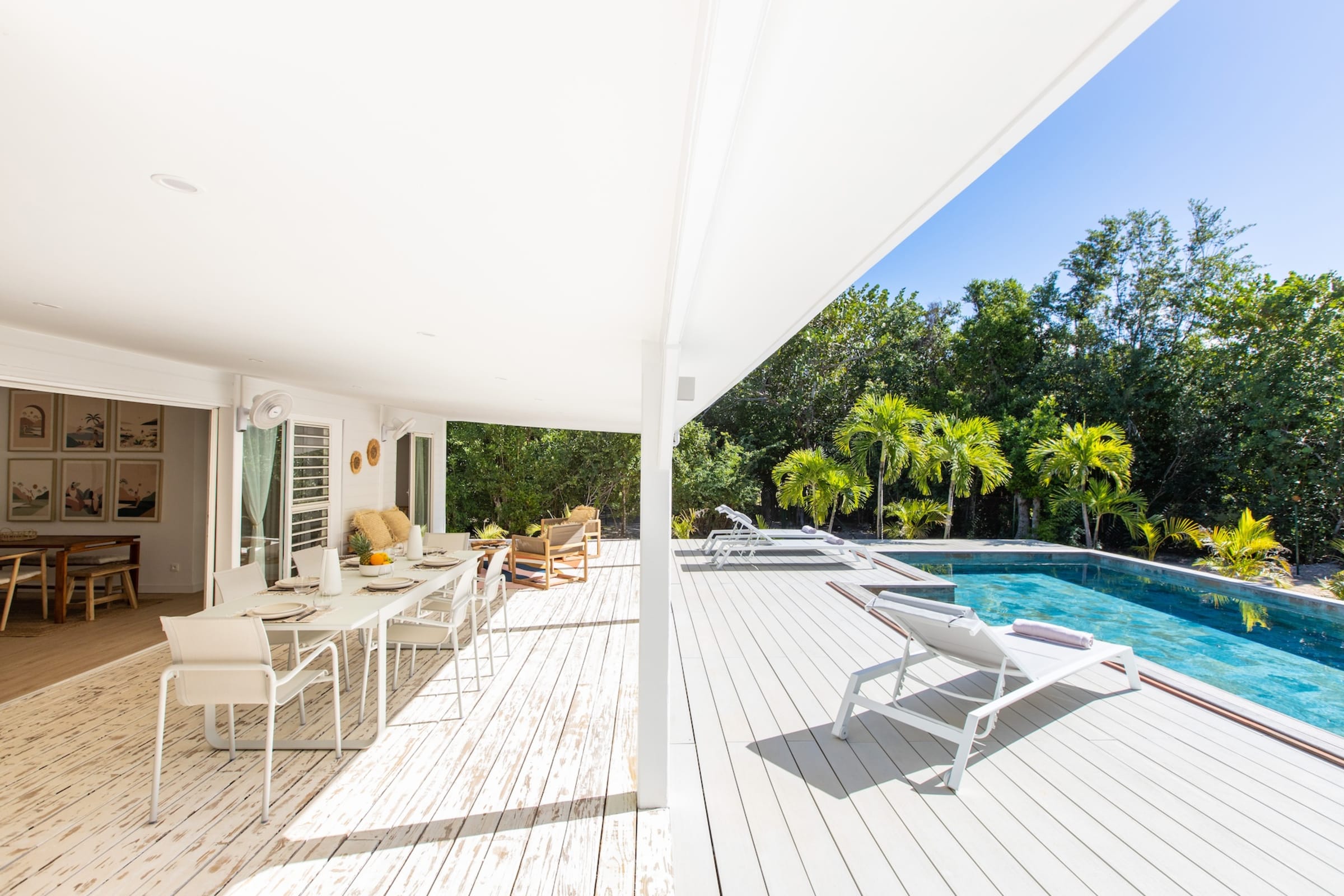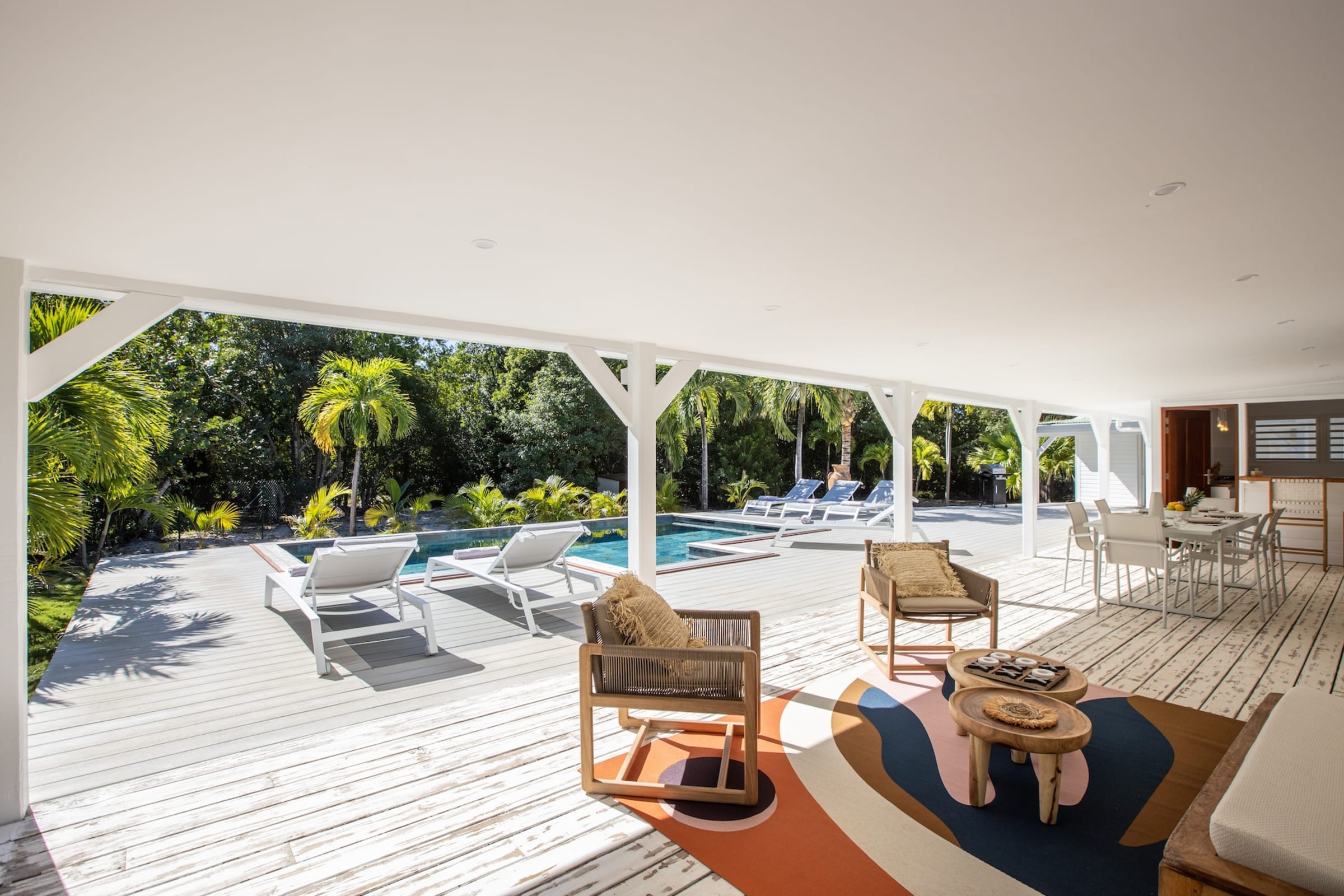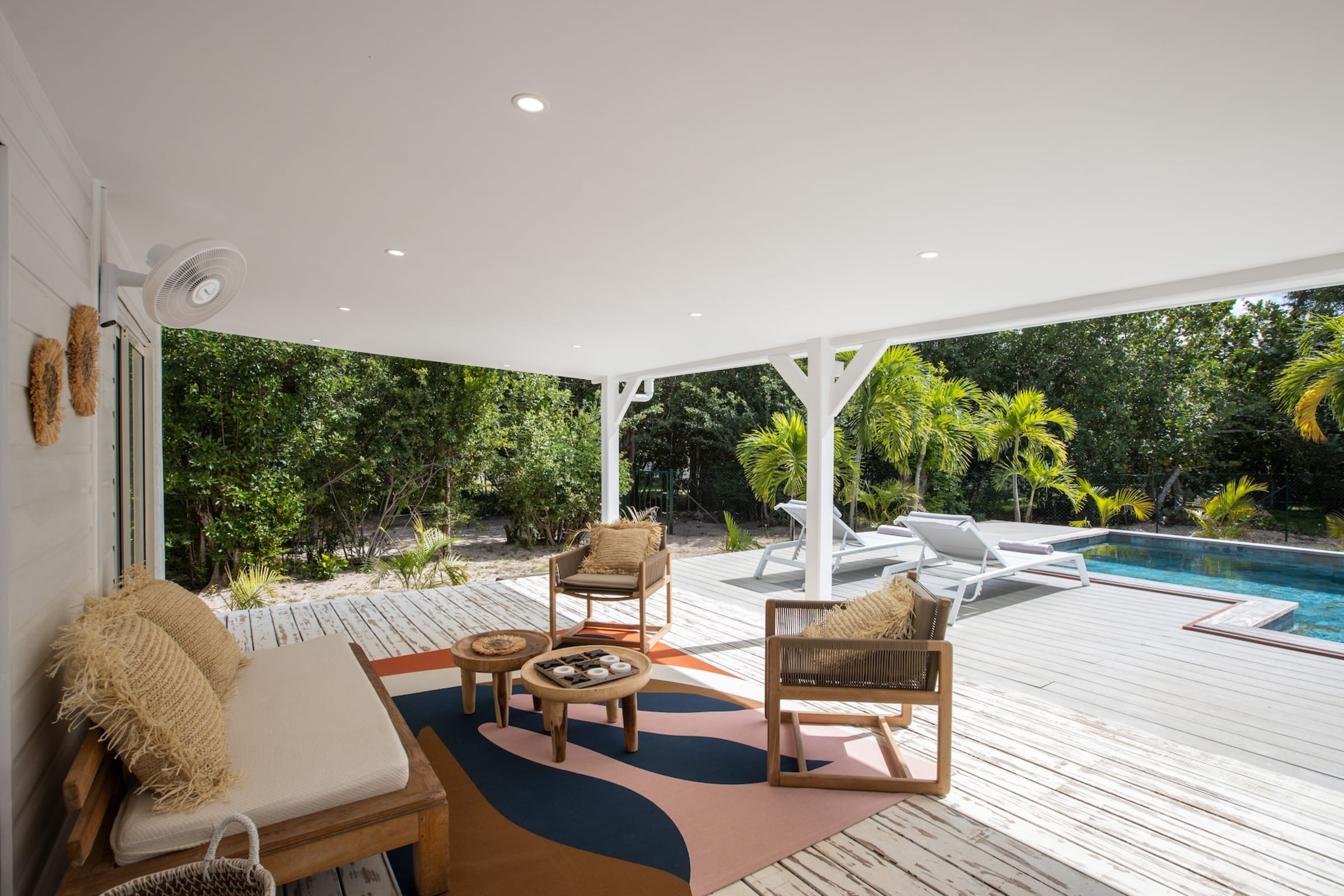 The villa's interior spaces are thoughtfully designed, with an open-concept layout that seamlessly connects the living, dining, and kitchen areas. The decor exudes a sophisticated tropical aesthetic, combining neutral tones with vibrant pops of Caribbean-inspired colors. High ceilings and large windows enhance the sense of spaciousness, creating an airy ambiance that complements the tropical surroundings.