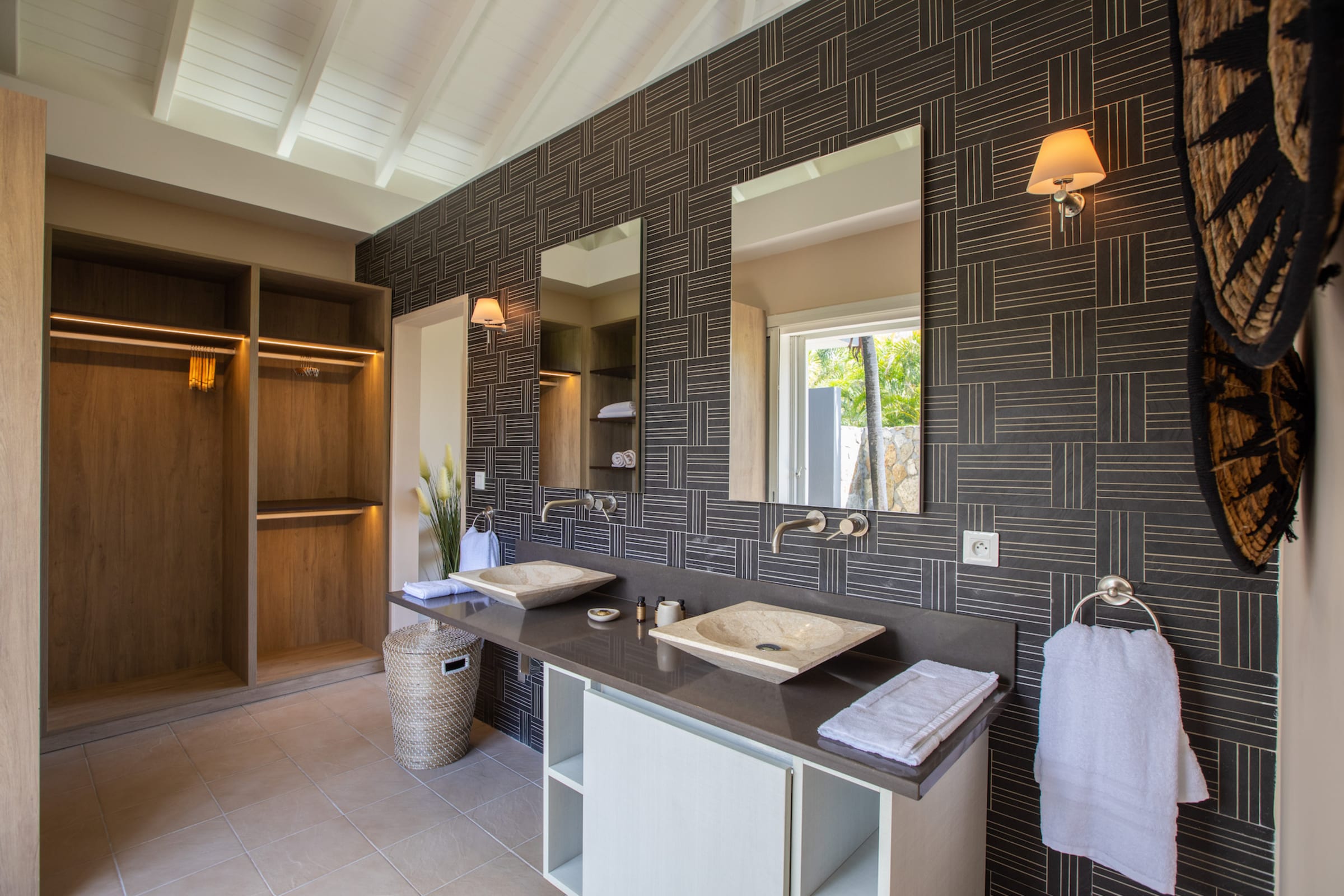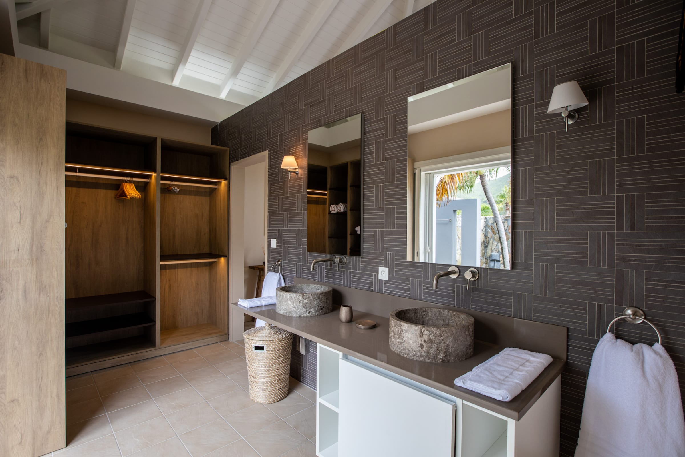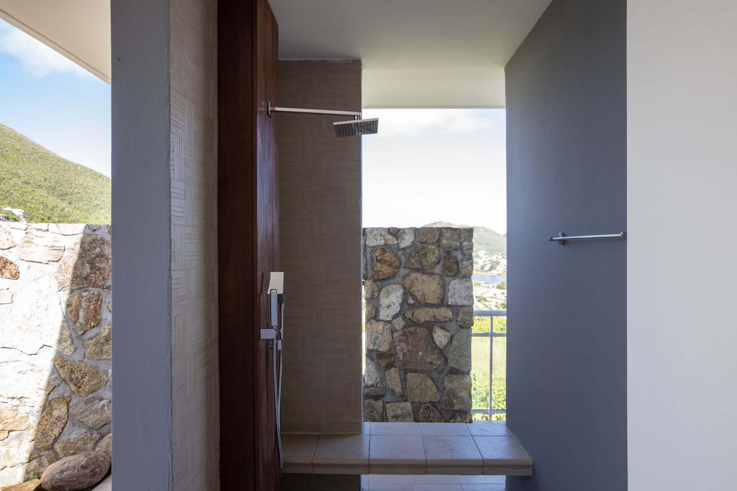 The villa’s beautiful outdoor spaces open to a free-form infinity pool, a large open deck with plenty of room for poolside sunbathing, and a gazebo with a sitting area to enjoy the cool island breeze and views of our smaller neighboring islands, Green Cay, Pinel and Tintamarre.