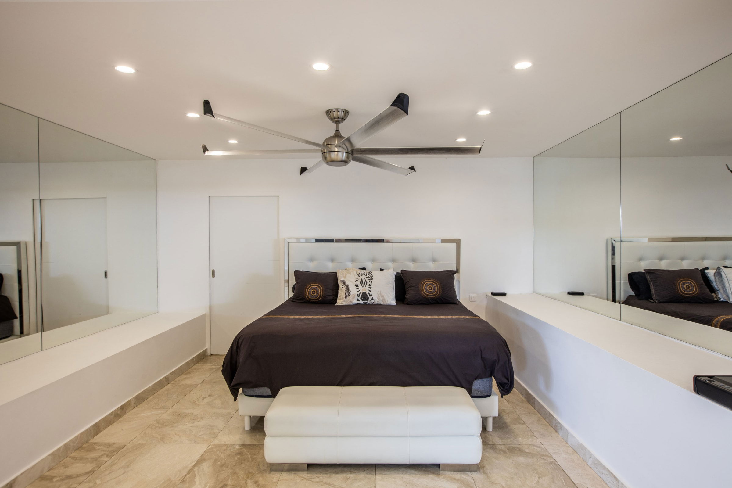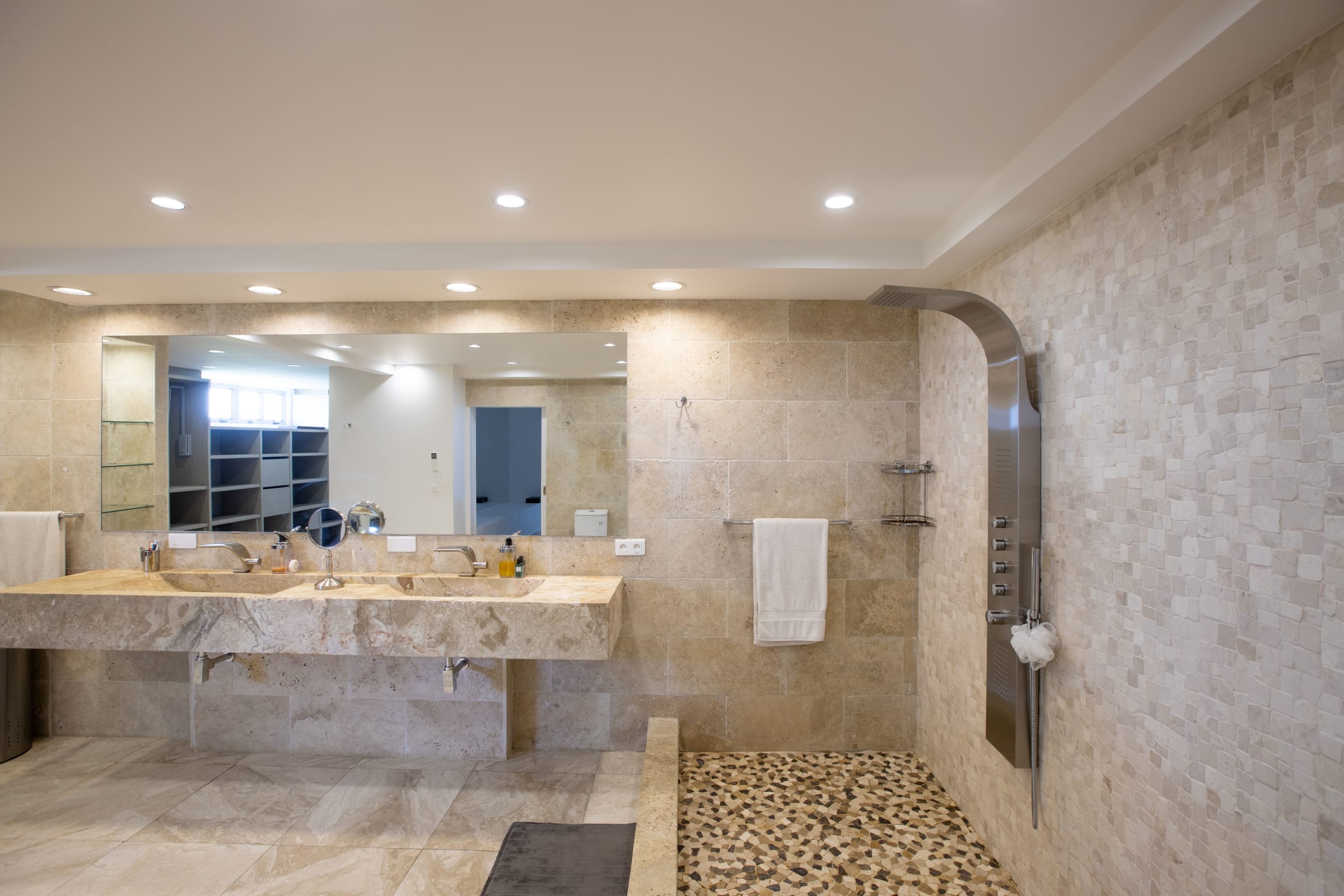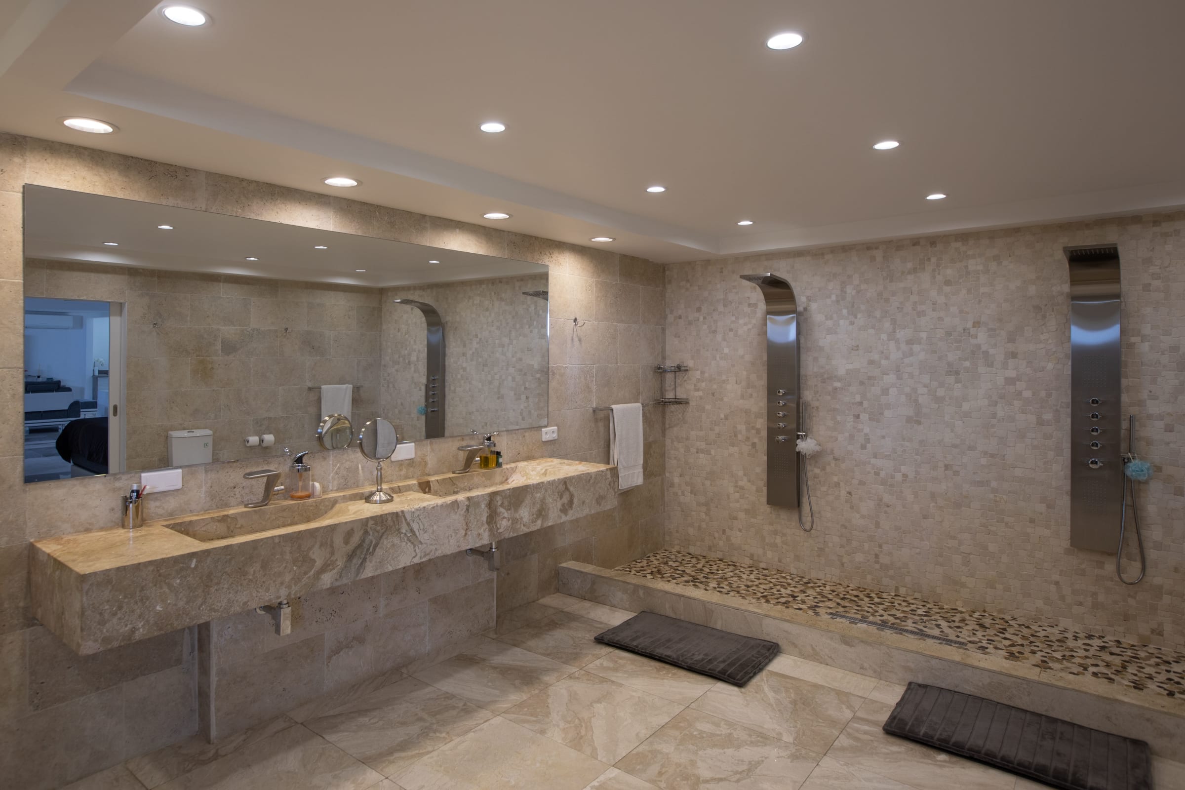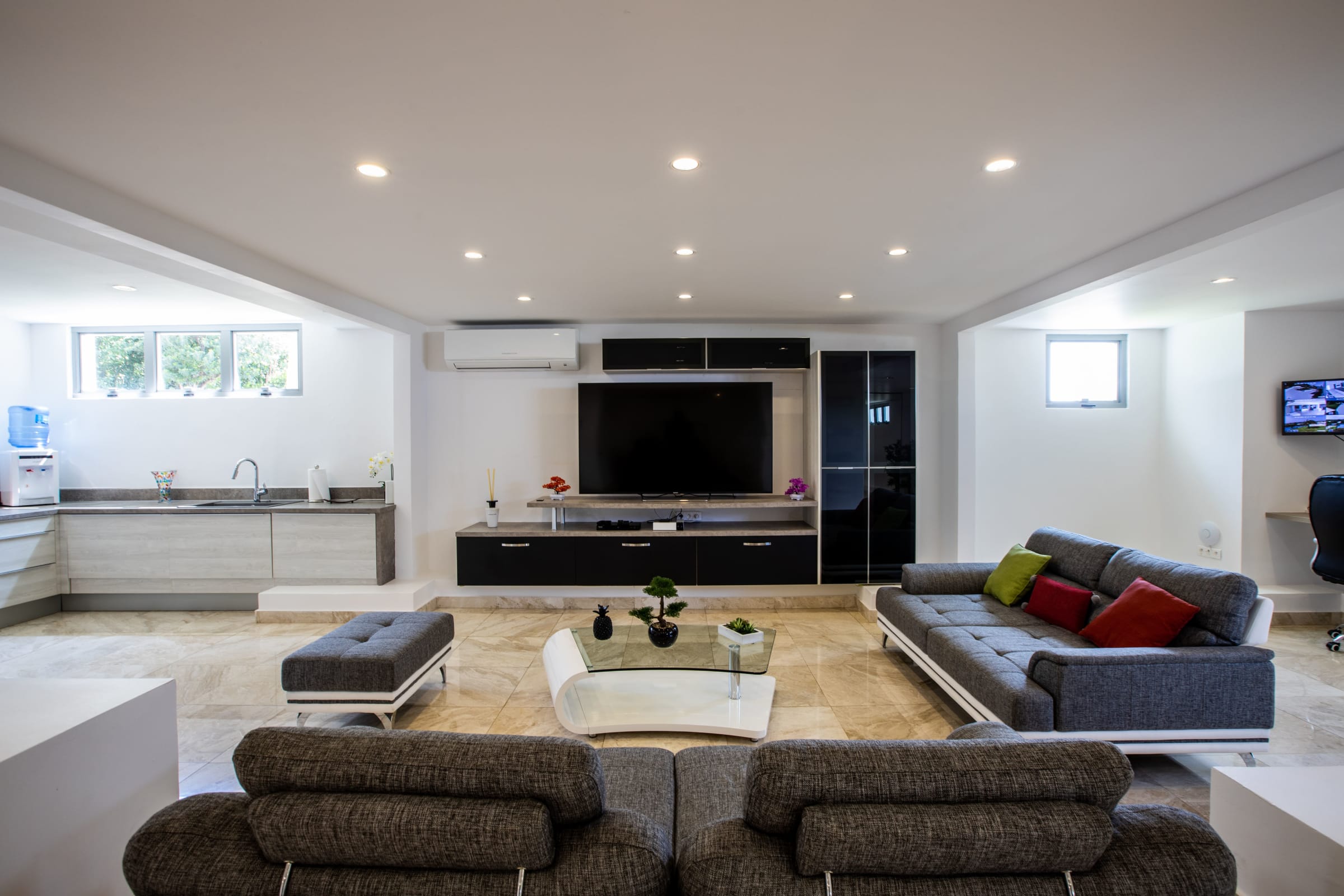 On the pool/terrace level, you'll find three of the bedrooms, and the master suite is situated on a lower level. The master suite features a gourmet kitchen and a spacious dressing room, adding an extra touch of luxury to your stay.